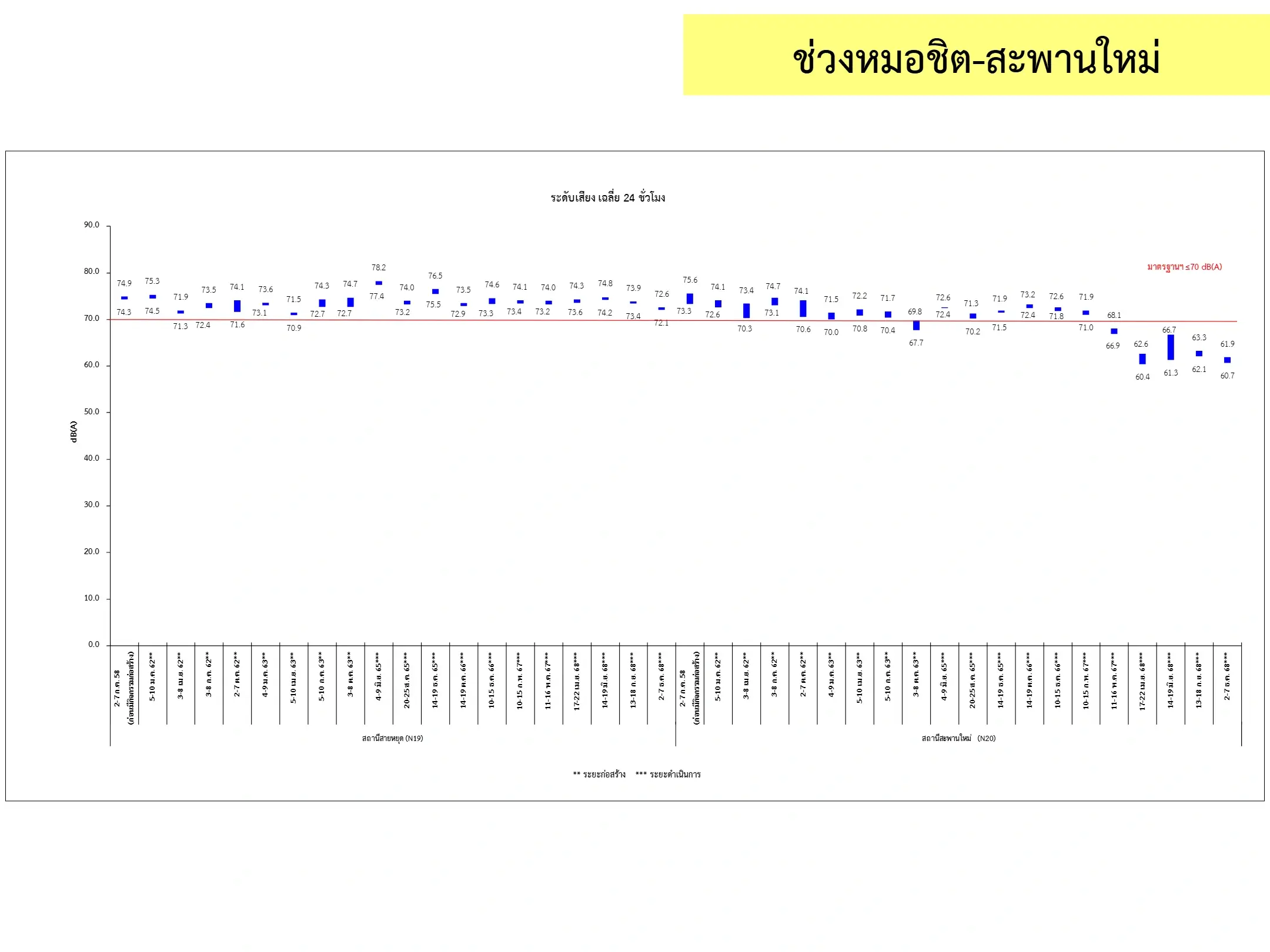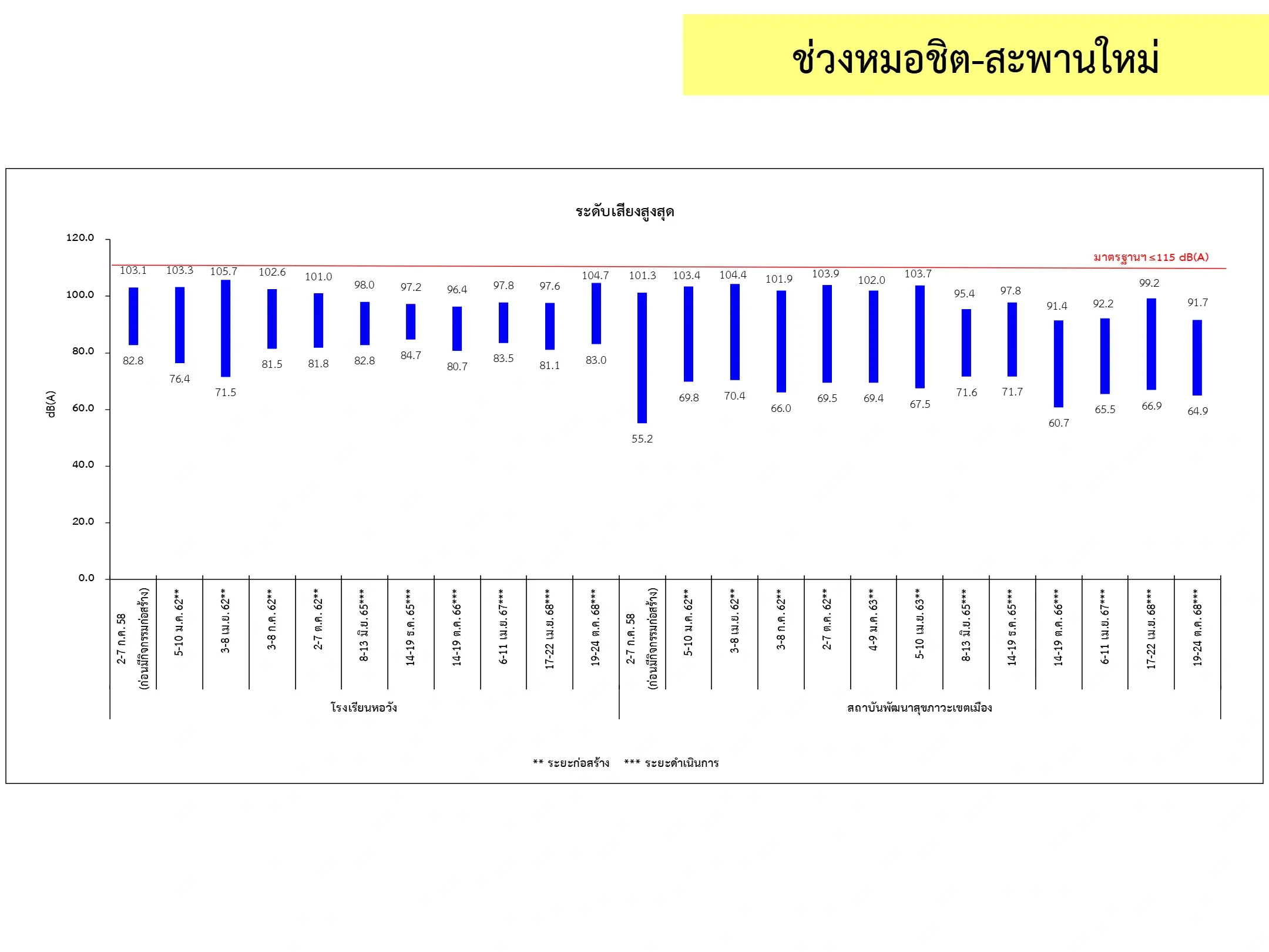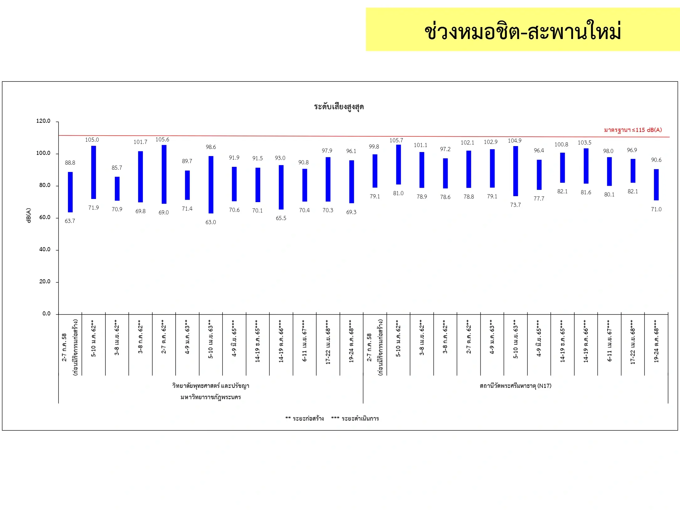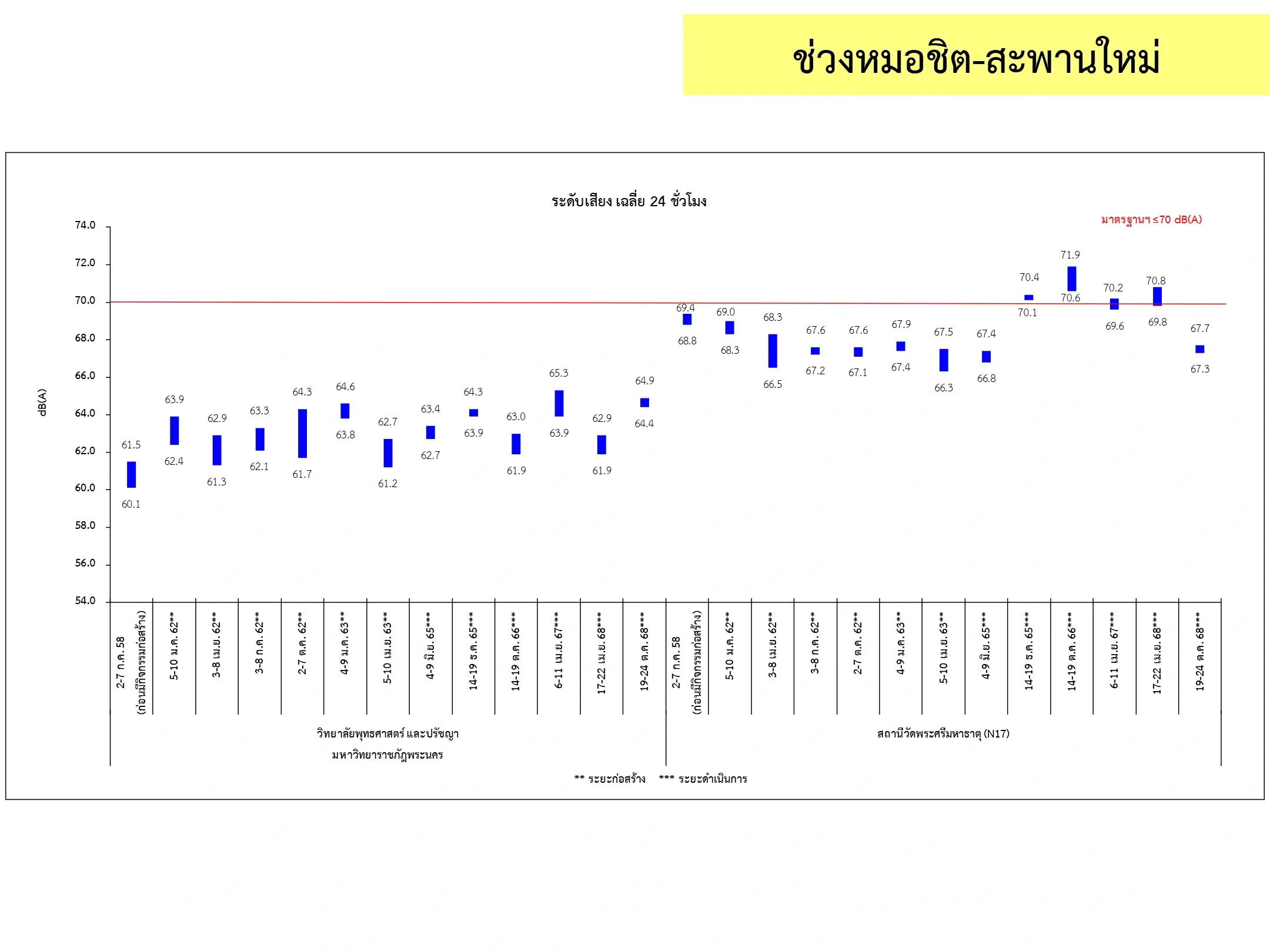 ผลการติดตามตรวจสอบระดับเสียงทั่วไป ได้แก่ ระดับเสียงเฉลี่ย 1 ชั่วโมง ระดับเสียงเฉลี่ย 24 ชั่วโมง ระดับเสียงเปอร์เซ็นไทล์ที่ 90 ระดับเสียงเฉลี่ยกลางวัน-กลางคืน และระดับเสียง ในช่วงเดือนกรกฎาคม-ธันวาคม พ.ศ. 2568 พบว่าโรงเรียนหอวัง สถานีรัชโยธิน (N11) และสถานีสายหยุด (N19) มีค่าไม่อยู่ในเกณฑ์มาตรฐานที่กำหนด เนื่องจากจุดติดตามตรวจสอบระดับเสียงตั้งอยู่ริมถนนพหลโยธิน ซึ่งมีปริมาณการจราจรหนาแน่นตลอดทั้งวัน โดยโครงการควรเพิ่มเติมการปลูกต้นไม้บริเวณริมทางเท้าเกาะกลางถนน และบริเวณเสาโครงสร้างของสถานีเพื่อช่วยดูดซับเสียงจากการจราจร ขณะที่ระดับเสียงสูงสุด มีค่าอยู่ในมาตรฐานระดับเสียงโดยทั่วไป ตามประกาศคณะกรรมการสิ่งแวดล้อมแห่งชาติ ฉบับที่ 15 (พ.ศ. 2540) ที่กำหนดให้ระดับเสียงสูงสุด มีค่าได้ไม่เกิน 115 เดซิเบลเอ สำหรับระดับเสียงเฉลี่ย 1 ชั่วโมง ระดับเสียงเปอร์เซ็นไทล์ที่ 90 และระดับเสียงเฉลี่ยกลางวัน-กลางคืน ยังไม่มีมาตรฐานกำหนด