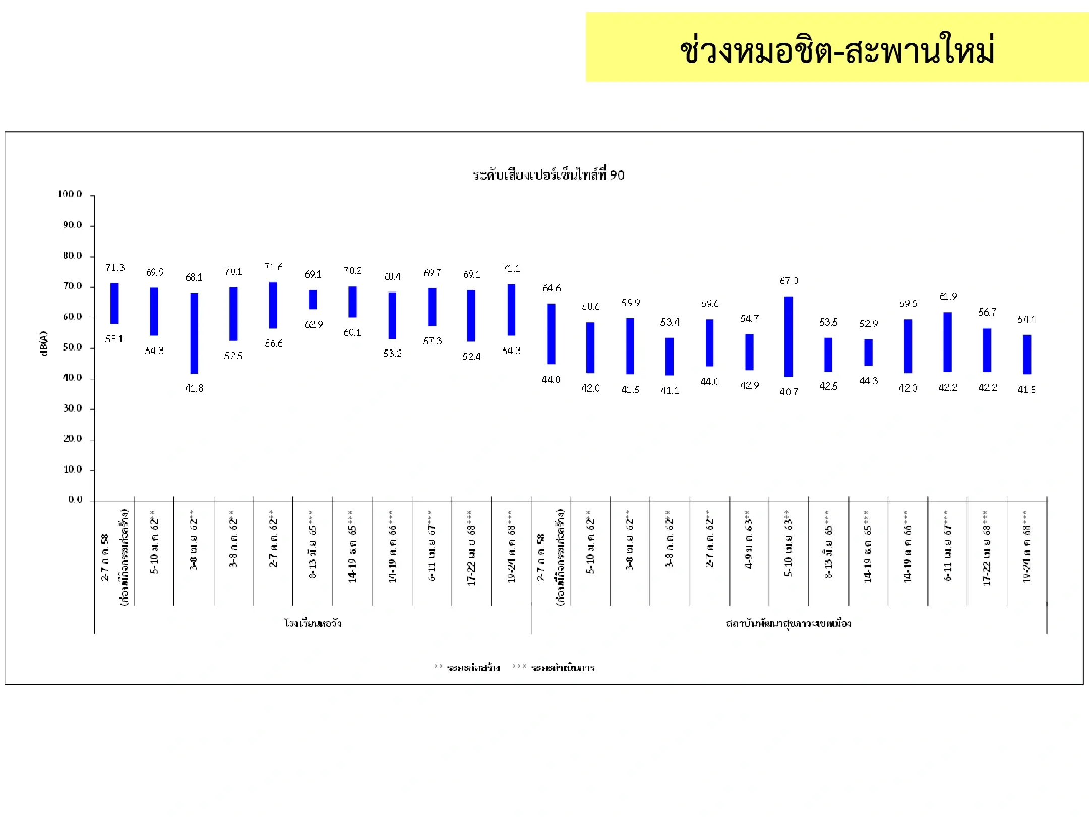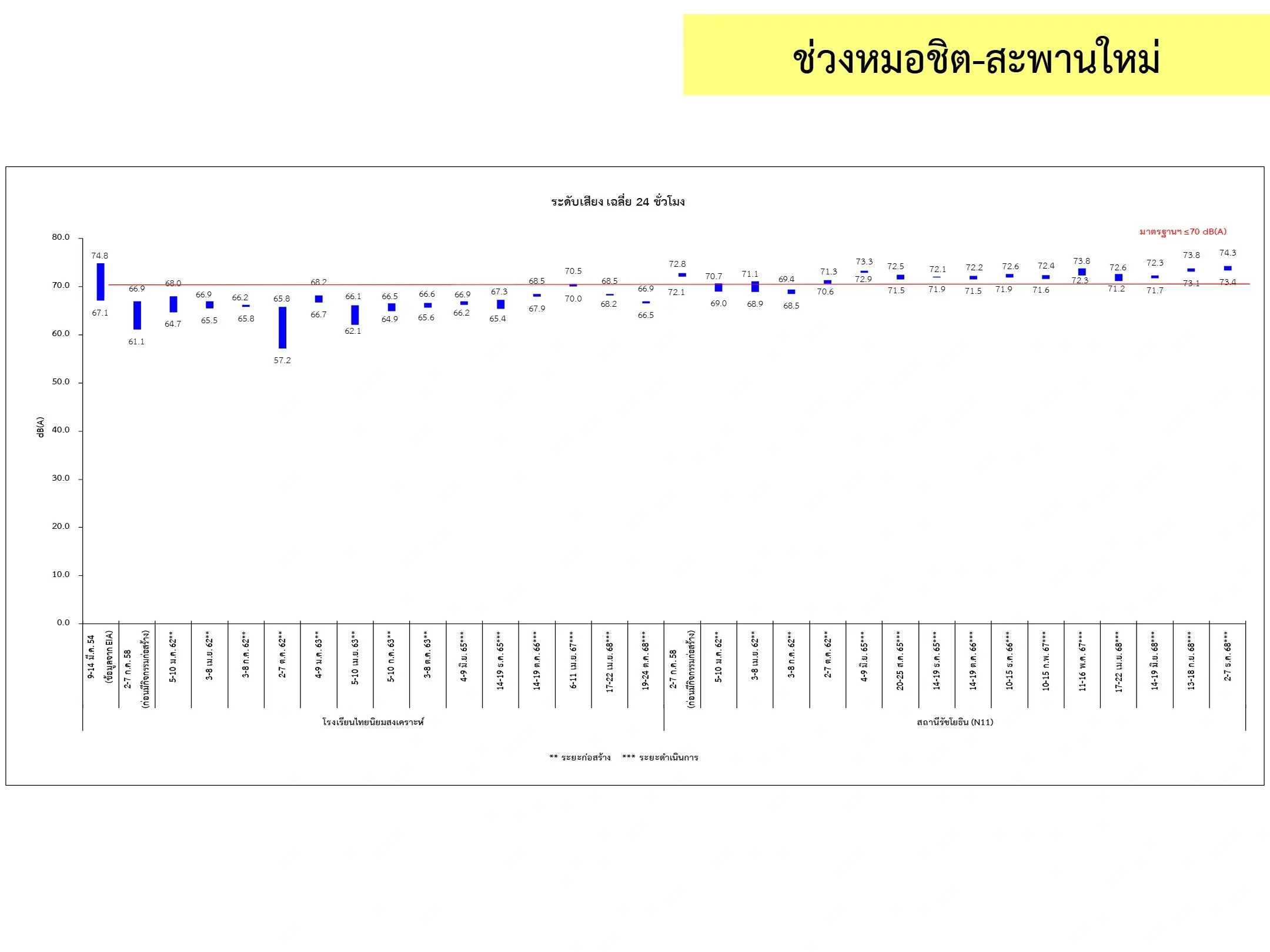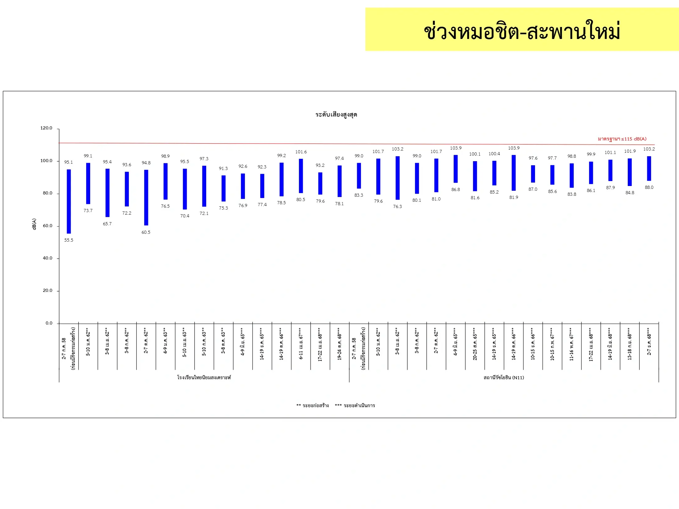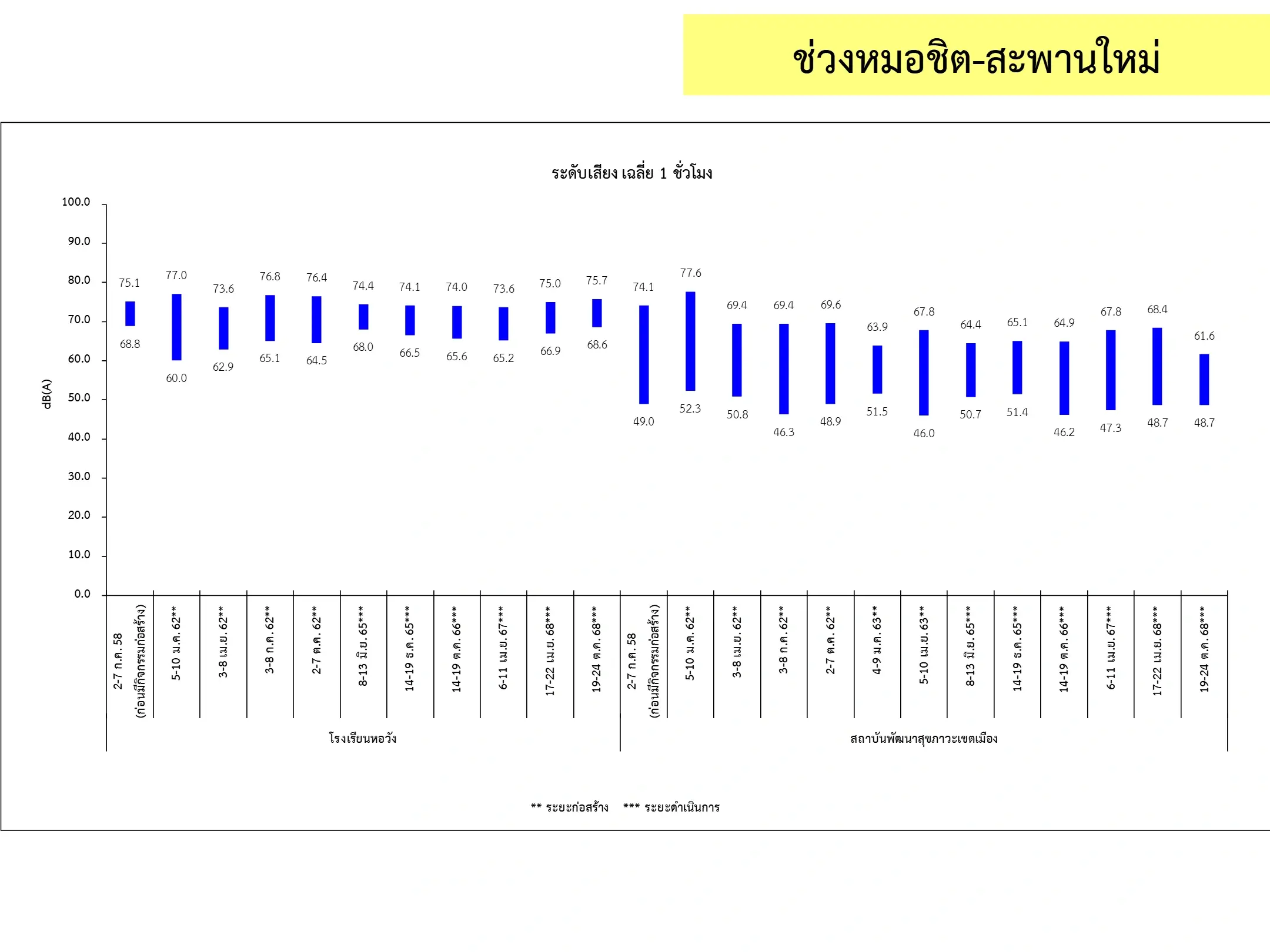 ผลการติดตามตรวจสอบระดับเสียงทั่วไป ได้แก่ ระดับเสียงเฉลี่ย 1 ชั่วโมง ระดับเสียงเฉลี่ย 24 ชั่วโมง ระดับเสียงเปอร์เซ็นไทล์ที่ 90 ระดับเสียงเฉลี่ยกลางวัน-กลางคืน และระดับเสียง ในช่วงเดือนกรกฎาคม-ธันวาคม พ.ศ. 2568 พบว่าโรงเรียนหอวัง สถานีรัชโยธิน (N11) และสถานีสายหยุด (N19) มีค่าไม่อยู่ในเกณฑ์มาตรฐานที่กำหนด เนื่องจากจุดติดตามตรวจสอบระดับเสียงตั้งอยู่ริมถนนพหลโยธิน ซึ่งมีปริมาณการจราจรหนาแน่นตลอดทั้งวัน โดยโครงการควรเพิ่มเติมการปลูกต้นไม้บริเวณริมทางเท้าเกาะกลางถนน และบริเวณเสาโครงสร้างของสถานีเพื่อช่วยดูดซับเสียงจากการจราจร ขณะที่ระดับเสียงสูงสุด มีค่าอยู่ในมาตรฐานระดับเสียงโดยทั่วไป ตามประกาศคณะกรรมการสิ่งแวดล้อมแห่งชาติ ฉบับที่ 15 (พ.ศ. 2540) ที่กำหนดให้ระดับเสียงสูงสุด มีค่าได้ไม่เกิน 115 เดซิเบลเอ สำหรับระดับเสียงเฉลี่ย 1 ชั่วโมง ระดับเสียงเปอร์เซ็นไทล์ที่ 90 และระดับเสียงเฉลี่ยกลางวัน-กลางคืน ยังไม่มีมาตรฐานกำหนด