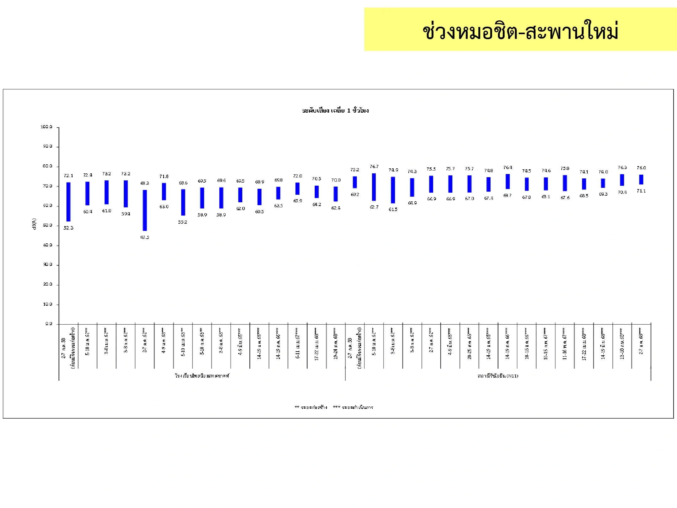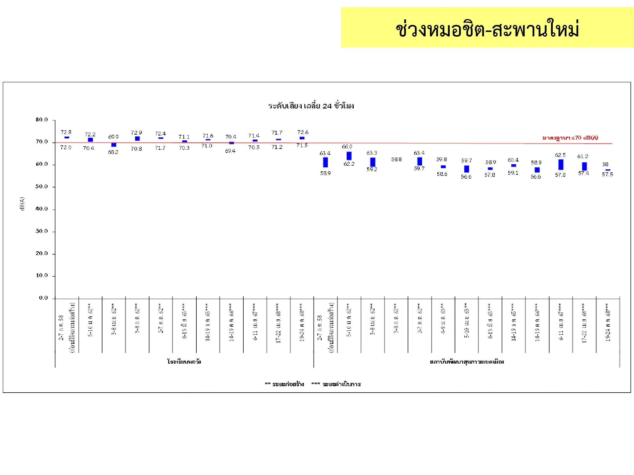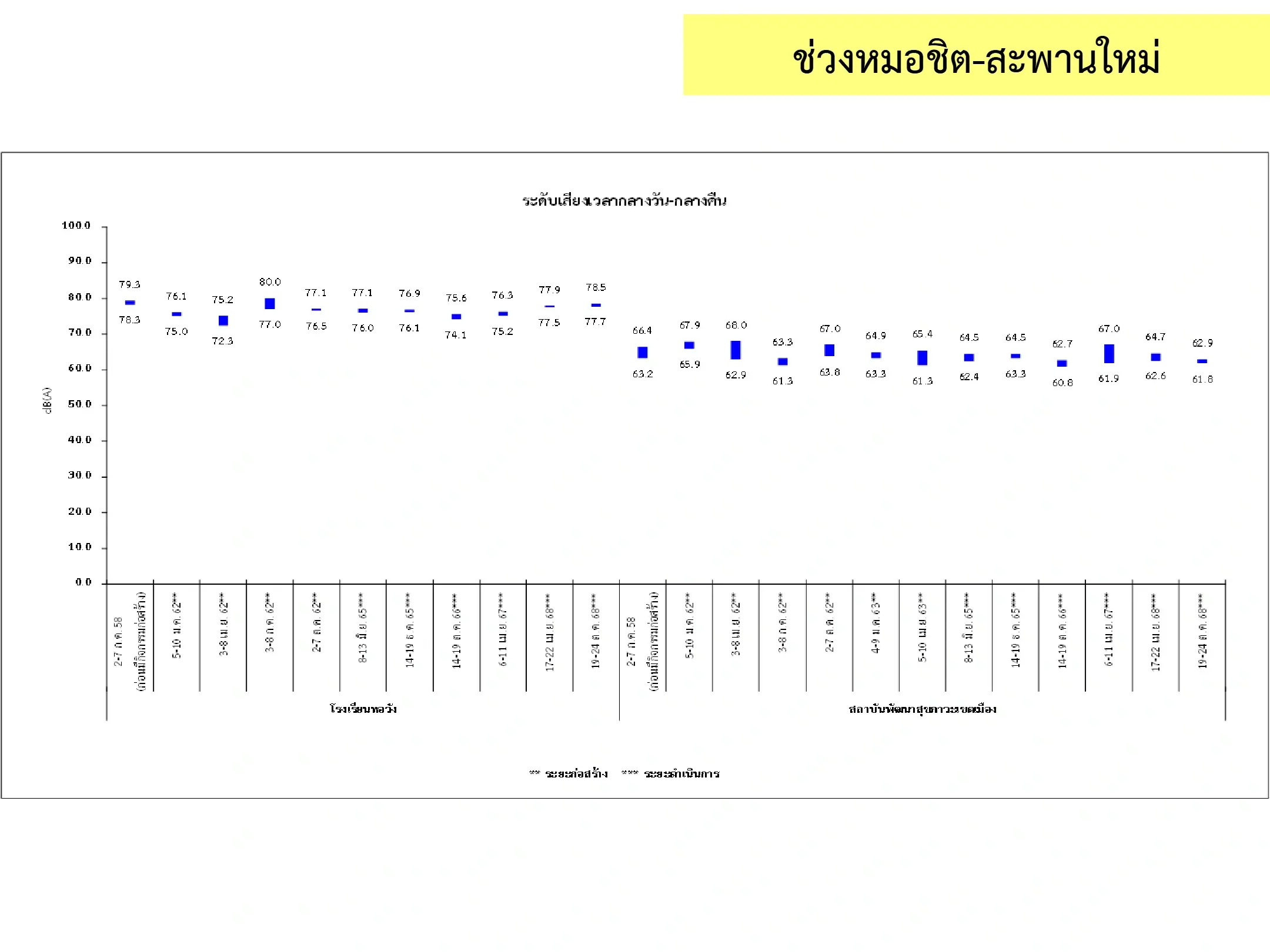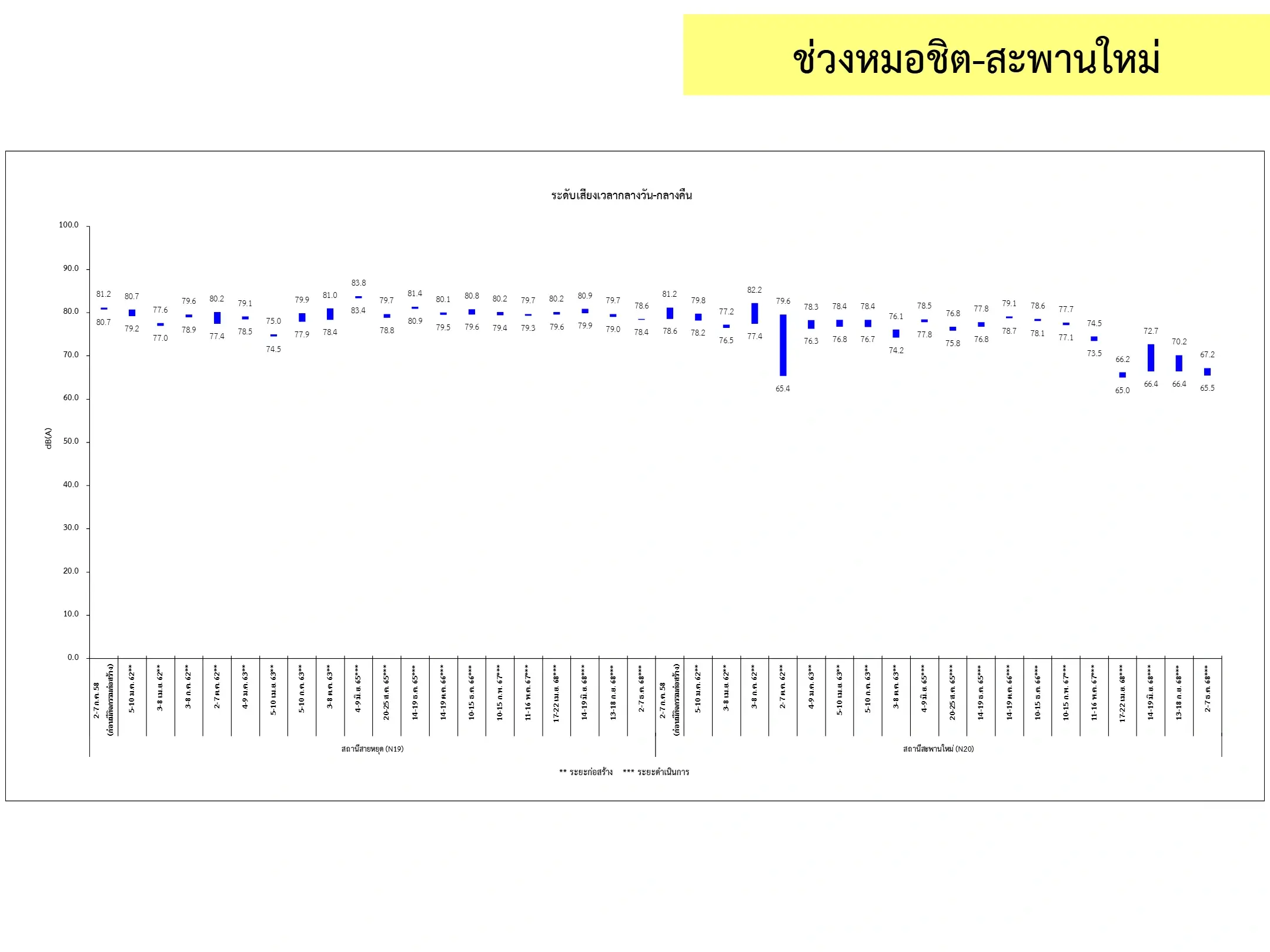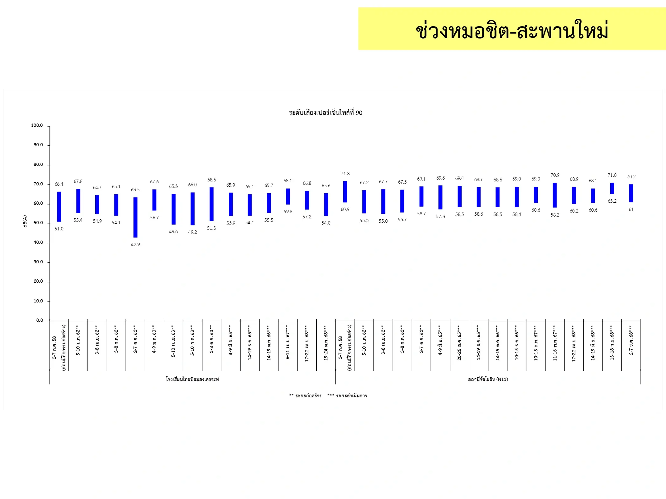 ผลการติดตามตรวจสอบระดับเสียงทั่วไป ได้แก่ ระดับเสียงเฉลี่ย 1 ชั่วโมง ระดับเสียงเฉลี่ย 24 ชั่วโมง ระดับเสียงเปอร์เซ็นไทล์ที่ 90 ระดับเสียงเฉลี่ยกลางวัน-กลางคืน และระดับเสียง ในช่วงเดือนกรกฎาคม-ธันวาคม พ.ศ. 2568 พบว่าโรงเรียนหอวัง สถานีรัชโยธิน (N11) และสถานีสายหยุด (N19) มีค่าไม่อยู่ในเกณฑ์มาตรฐานที่กำหนด เนื่องจากจุดติดตามตรวจสอบระดับเสียงตั้งอยู่ริมถนนพหลโยธิน ซึ่งมีปริมาณการจราจรหนาแน่นตลอดทั้งวัน โดยโครงการควรเพิ่มเติมการปลูกต้นไม้บริเวณริมทางเท้าเกาะกลางถนน และบริเวณเสาโครงสร้างของสถานีเพื่อช่วยดูดซับเสียงจากการจราจร ขณะที่ระดับเสียงสูงสุด มีค่าอยู่ในมาตรฐานระดับเสียงโดยทั่วไป ตามประกาศคณะกรรมการสิ่งแวดล้อมแห่งชาติ ฉบับที่ 15 (พ.ศ. 2540) ที่กำหนดให้ระดับเสียงสูงสุด มีค่าได้ไม่เกิน 115 เดซิเบลเอ สำหรับระดับเสียงเฉลี่ย 1 ชั่วโมง ระดับเสียงเปอร์เซ็นไทล์ที่ 90 และระดับเสียงเฉลี่ยกลางวัน-กลางคืน ยังไม่มีมาตรฐานกำหนด