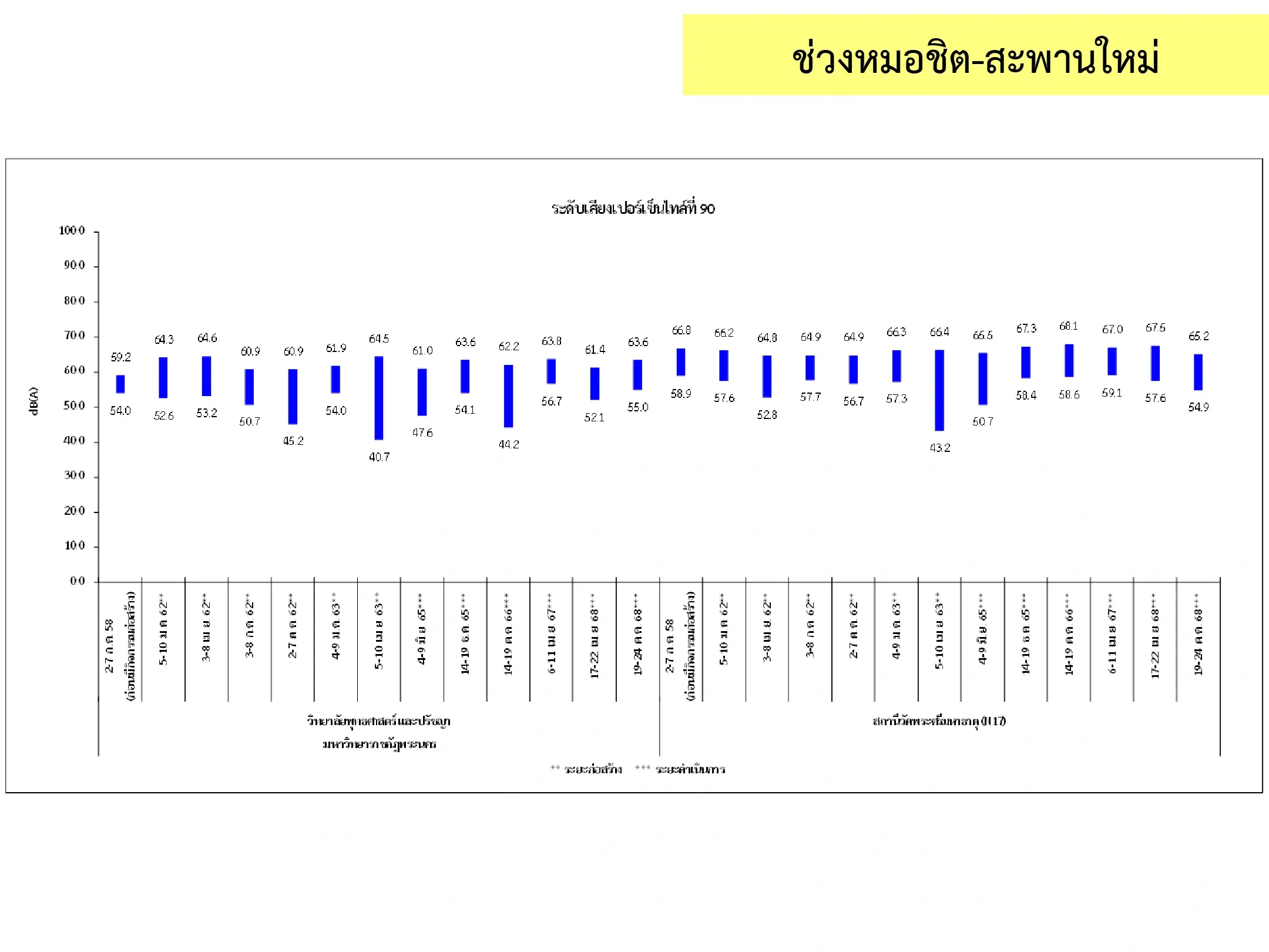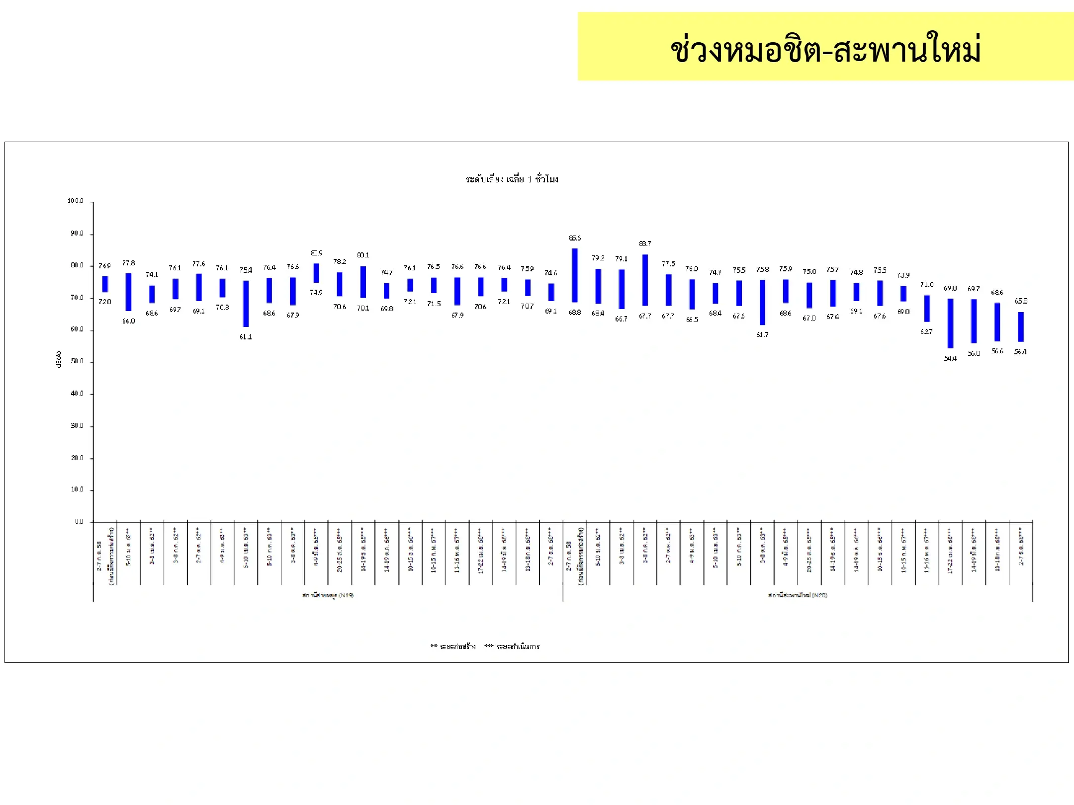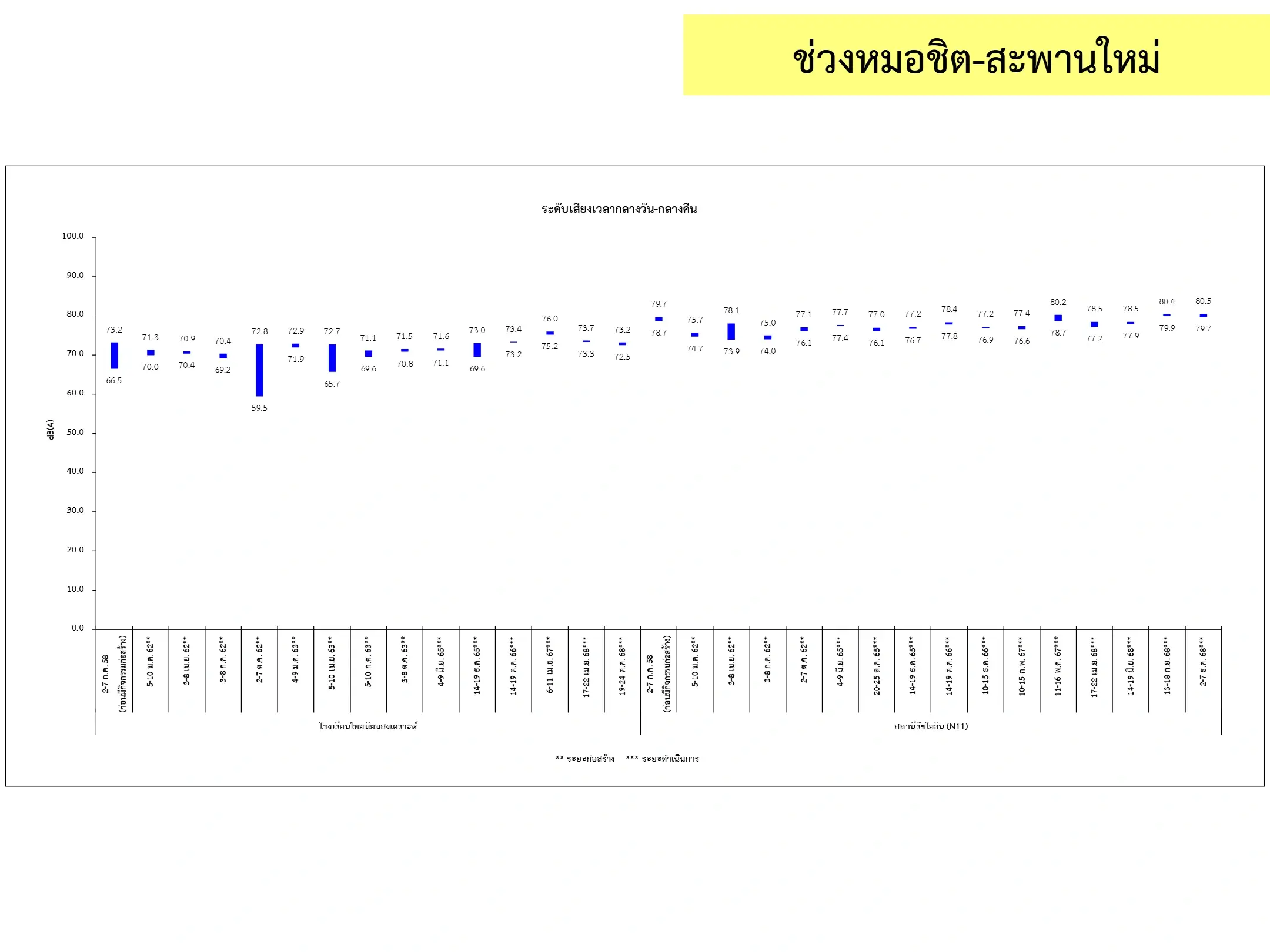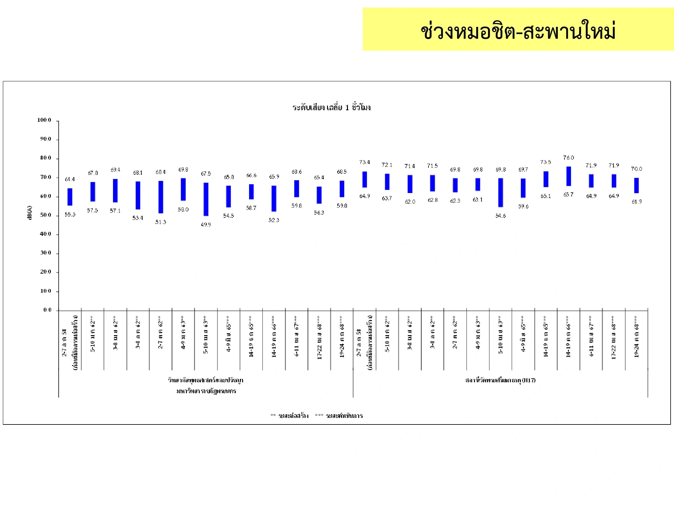ผลการติดตามตรวจสอบระดับเสียงทั่วไป ได้แก่ ระดับเสียงเฉลี่ย 1 ชั่วโมง ระดับเสียงเฉลี่ย 24 ชั่วโมง ระดับเสียงเปอร์เซ็นไทล์ที่ 90 ระดับเสียงเฉลี่ยกลางวัน-กลางคืน และระดับเสียง ในช่วงเดือนกรกฎาคม-ธันวาคม พ.ศ. 2568 พบว่าโรงเรียนหอวัง สถานีรัชโยธิน (N11) และสถานีสายหยุด (N19) มีค่าไม่อยู่ในเกณฑ์มาตรฐานที่กำหนด เนื่องจากจุดติดตามตรวจสอบระดับเสียงตั้งอยู่ริมถนนพหลโยธิน ซึ่งมีปริมาณการจราจรหนาแน่นตลอดทั้งวัน โดยโครงการควรเพิ่มเติมการปลูกต้นไม้บริเวณริมทางเท้าเกาะกลางถนน และบริเวณเสาโครงสร้างของสถานีเพื่อช่วยดูดซับเสียงจากการจราจร ขณะที่ระดับเสียงสูงสุด มีค่าอยู่ในมาตรฐานระดับเสียงโดยทั่วไป ตามประกาศคณะกรรมการสิ่งแวดล้อมแห่งชาติ ฉบับที่ 15 (พ.ศ. 2540) ที่กำหนดให้ระดับเสียงสูงสุด มีค่าได้ไม่เกิน 115 เดซิเบลเอ สำหรับระดับเสียงเฉลี่ย 1 ชั่วโมง ระดับเสียงเปอร์เซ็นไทล์ที่ 90 และระดับเสียงเฉลี่ยกลางวัน-กลางคืน ยังไม่มีมาตรฐานกำหนด