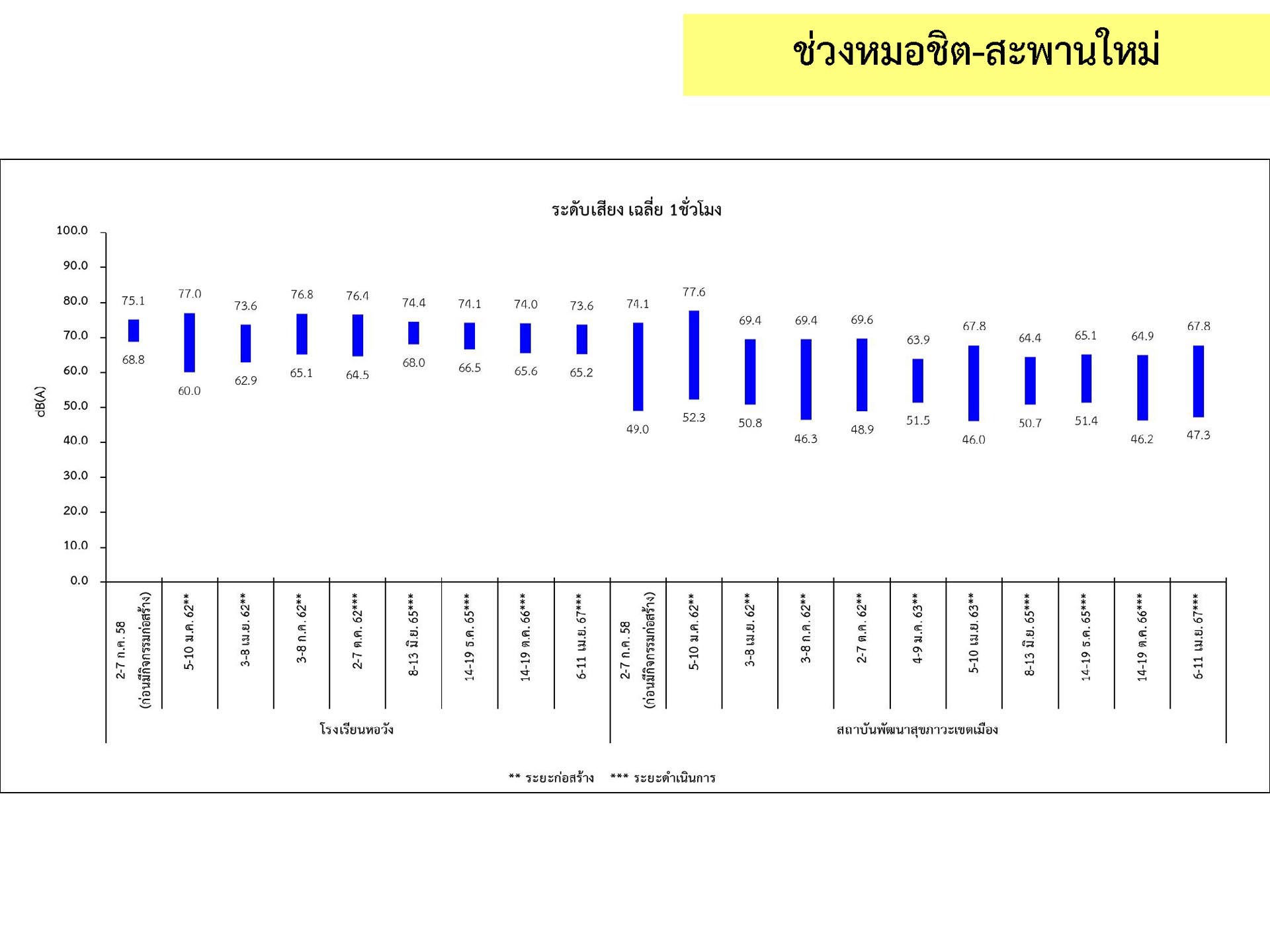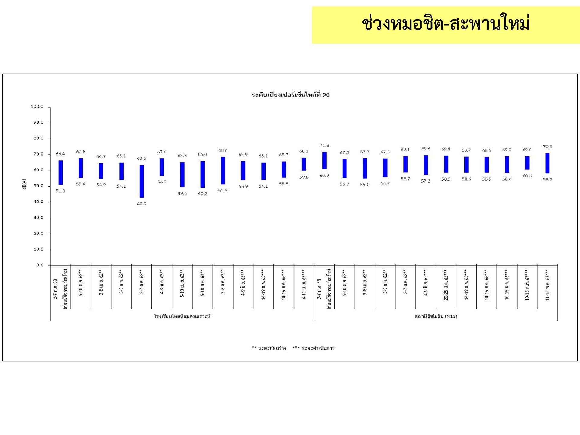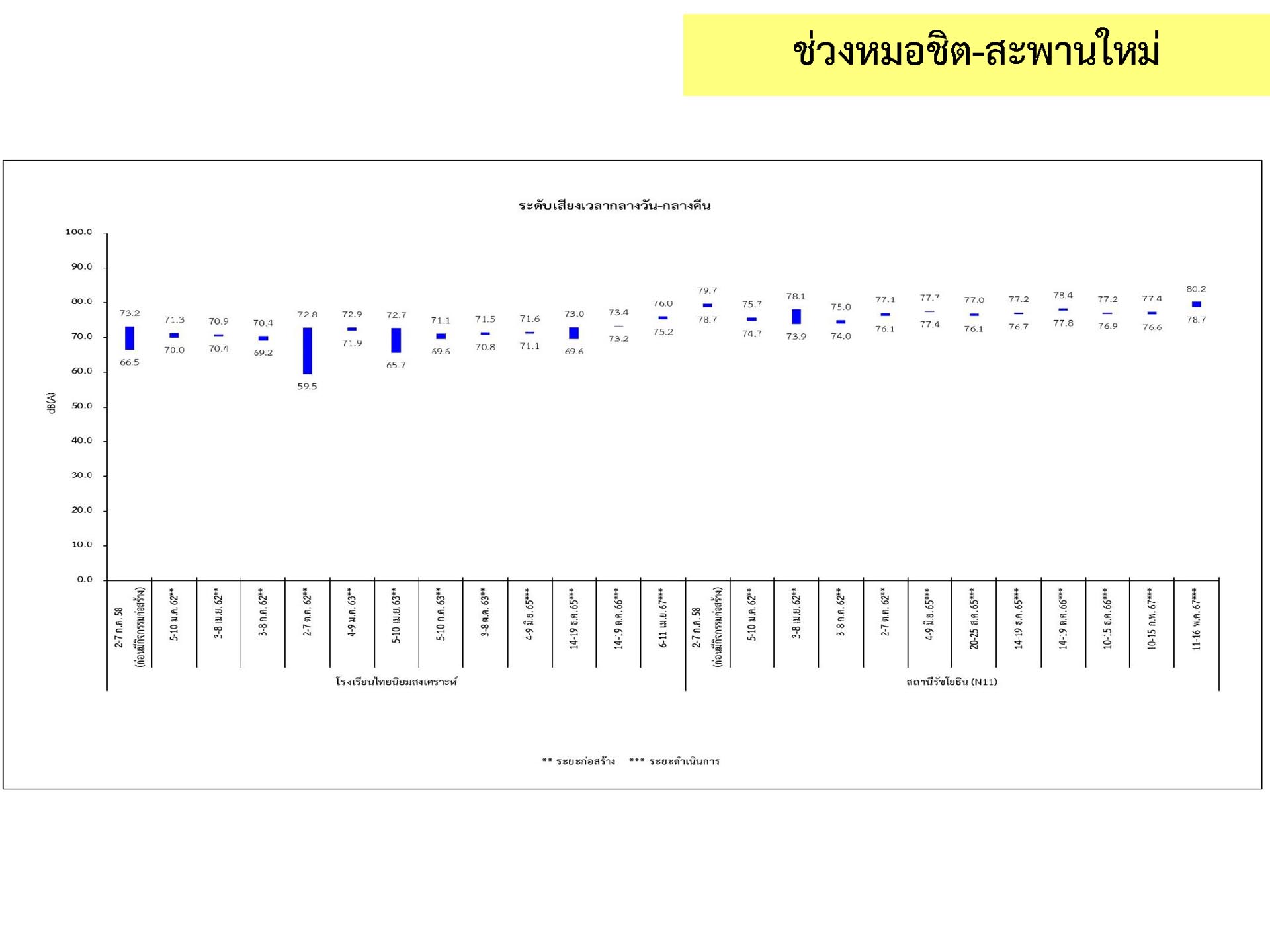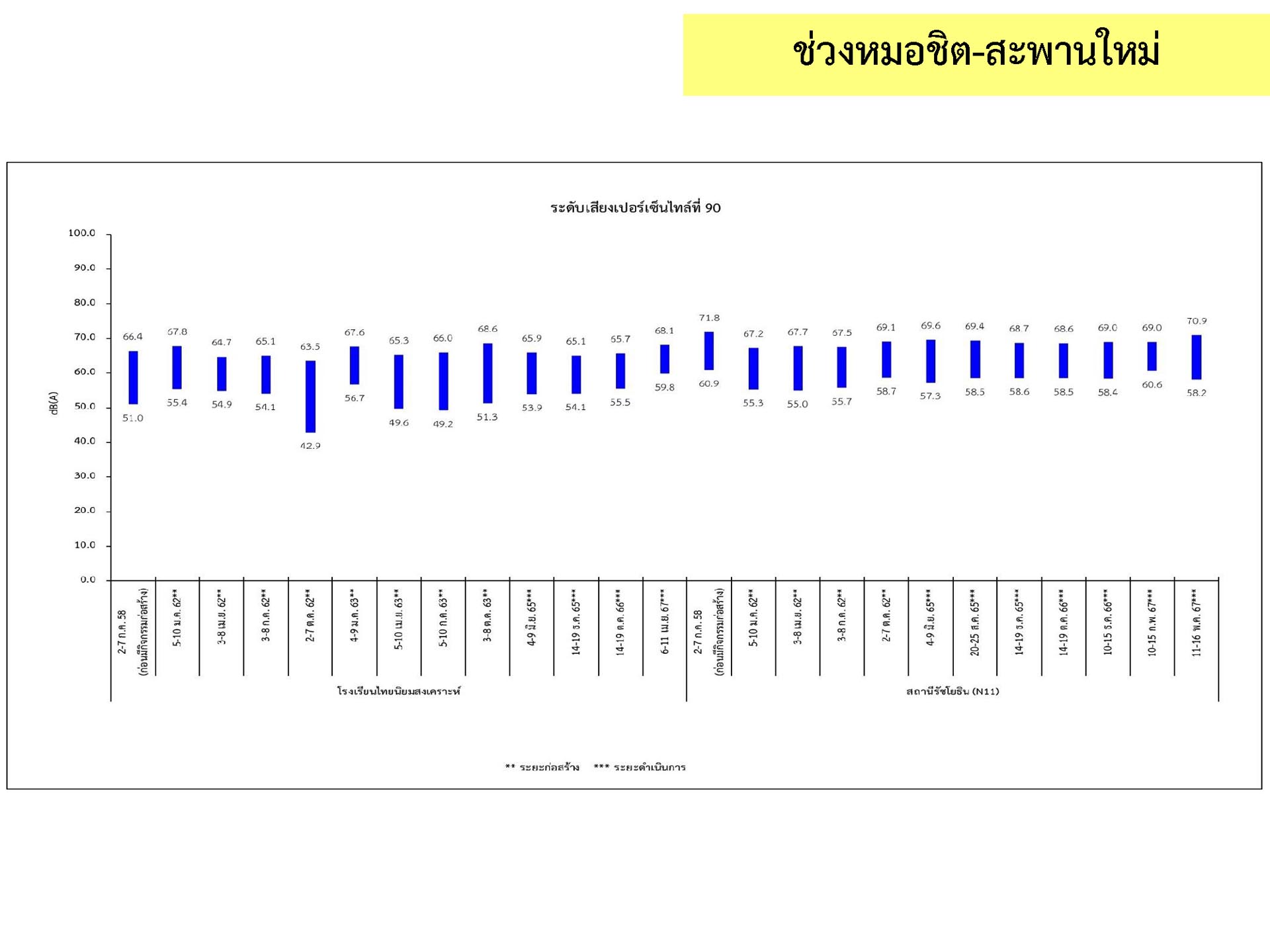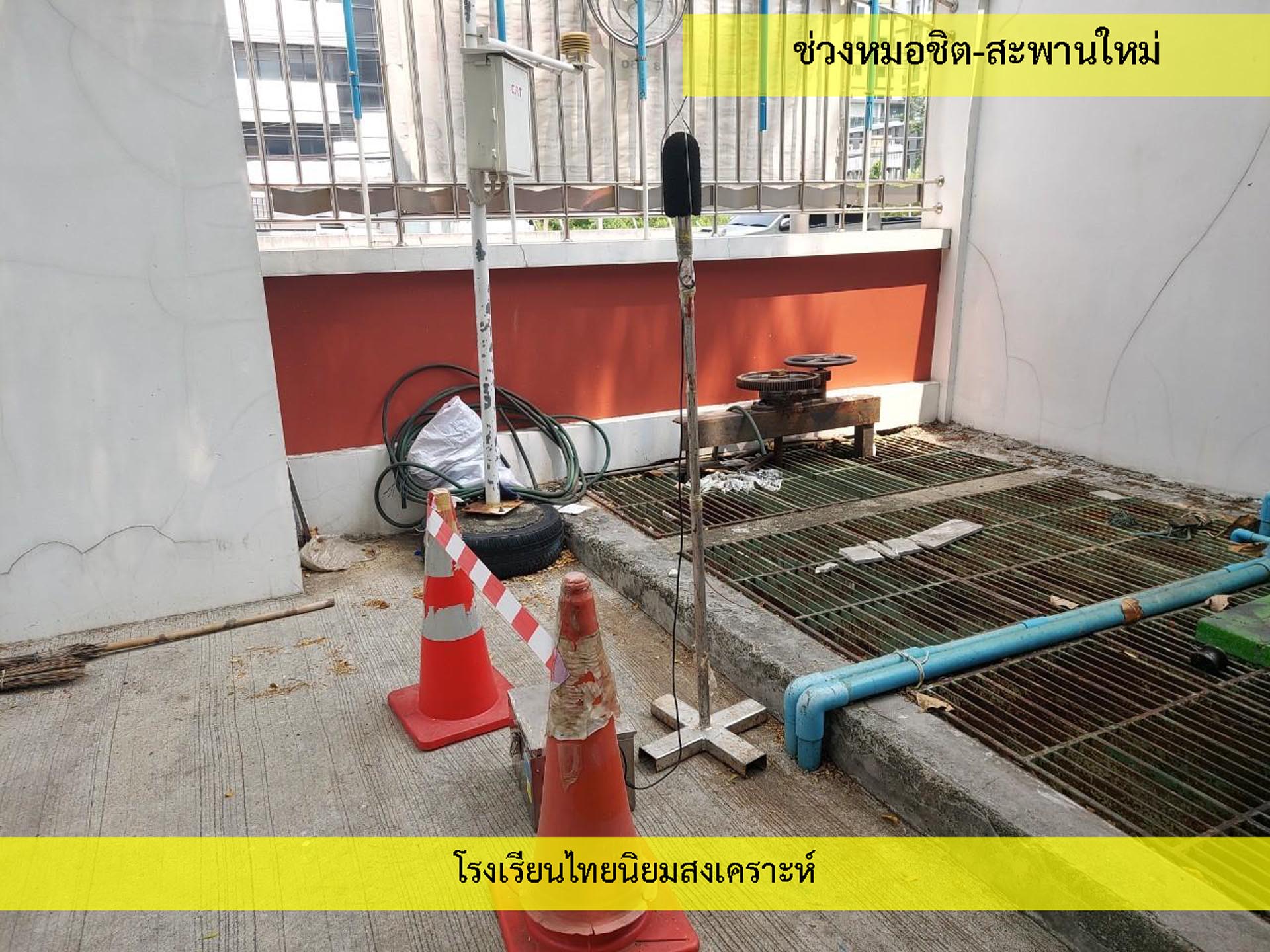 ดูดซับเสียงจากการจราจร ส่วนโรงเรียนไทยนิยมสงเคราะห์ เนื่องจากจุดติดตามตรวจสอบระดับเสียงตั้งอยู่ภายในบริเวณโรงเรียนไทยนิยมสังเคราะห์ ซึ่งอยู่ในช่วงที่มีกิจกรรมการปรับปรุงอาคารภายในโรงเรียน จึงทำให้ระดับเสียงเฉลี่ย 24 ชั่วโมงมีค่าเกินมาตรฐาน ขณะที่ระดับเสียงสูงสุด มีค่าอยู่ในมาตรฐานระดับเสียงโดยทั่วไป ตามประกาศคณะกรรมการสิ่งแวดล้อมแห่งชาติ ฉบับที่ 15 (พ.ศ. 2540) ที่กำหนดให้ระดับเสียงสูงสุด มีค่าได้ไม่เกิน 115 เดซิเบลเอ สำหรับระดับเสียงเฉลี่ย 1 ชั่วโมง ระดับเสียงเปอร์เซ็นไทล์ที่ 90 และระดับเสียงเฉลี่ยกลางวัน-กลางคืน ยังไม่มีมาตรฐานกำหนด