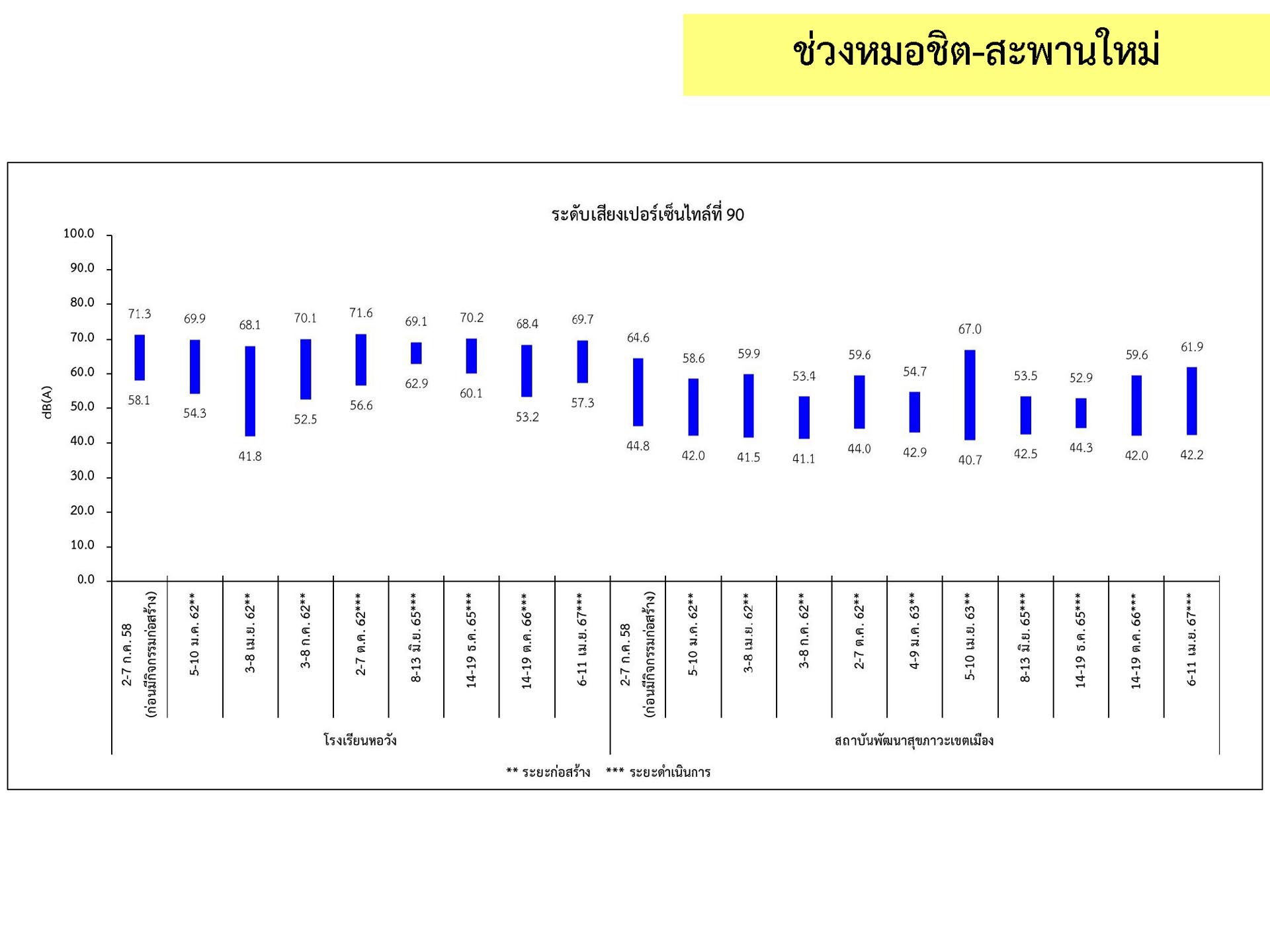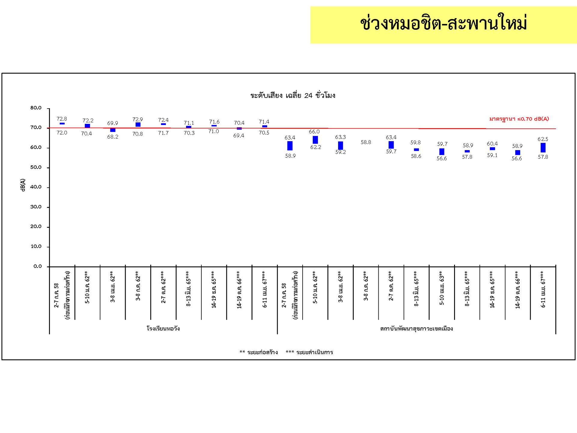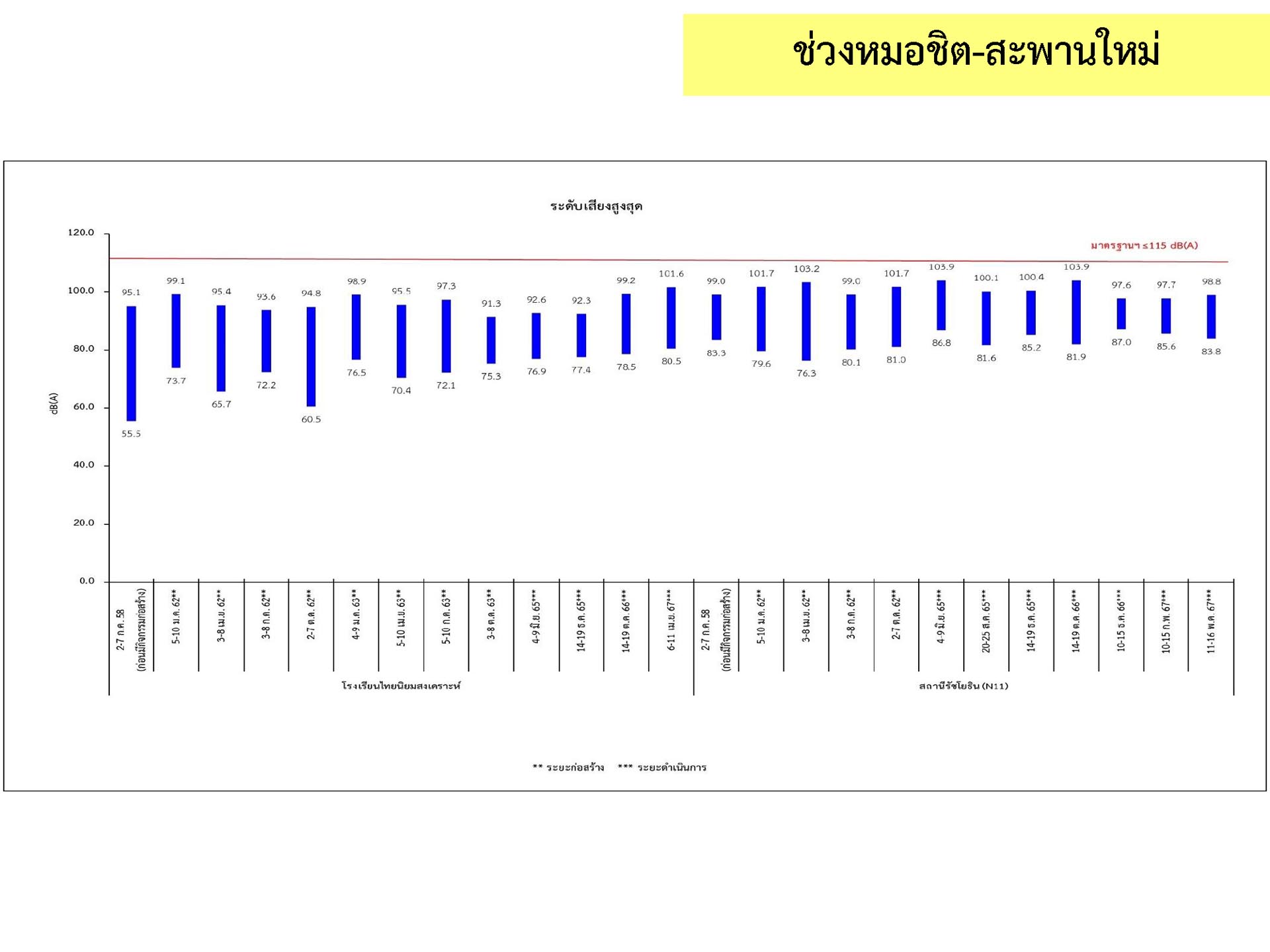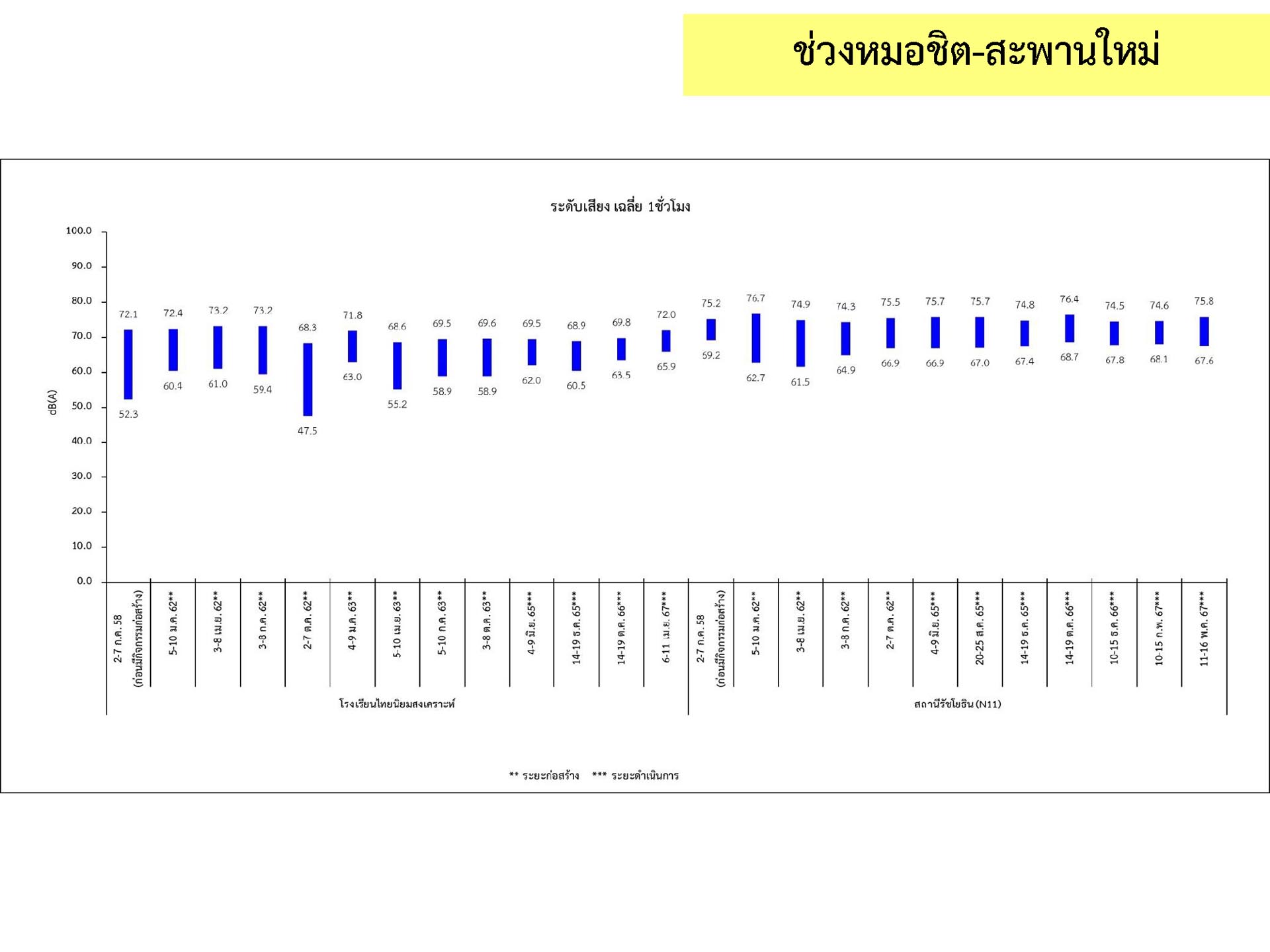 ดูดซับเสียงจากการจราจร ส่วนโรงเรียนไทยนิยมสงเคราะห์ เนื่องจากจุดติดตามตรวจสอบระดับเสียงตั้งอยู่ภายในบริเวณโรงเรียนไทยนิยมสังเคราะห์ ซึ่งอยู่ในช่วงที่มีกิจกรรมการปรับปรุงอาคารภายในโรงเรียน จึงทำให้ระดับเสียงเฉลี่ย 24 ชั่วโมงมีค่าเกินมาตรฐาน ขณะที่ระดับเสียงสูงสุด มีค่าอยู่ในมาตรฐานระดับเสียงโดยทั่วไป ตามประกาศคณะกรรมการสิ่งแวดล้อมแห่งชาติ ฉบับที่ 15 (พ.ศ. 2540) ที่กำหนดให้ระดับเสียงสูงสุด มีค่าได้ไม่เกิน 115 เดซิเบลเอ สำหรับระดับเสียงเฉลี่ย 1 ชั่วโมง ระดับเสียงเปอร์เซ็นไทล์ที่ 90 และระดับเสียงเฉลี่ยกลางวัน-กลางคืน ยังไม่มีมาตรฐานกำหนด