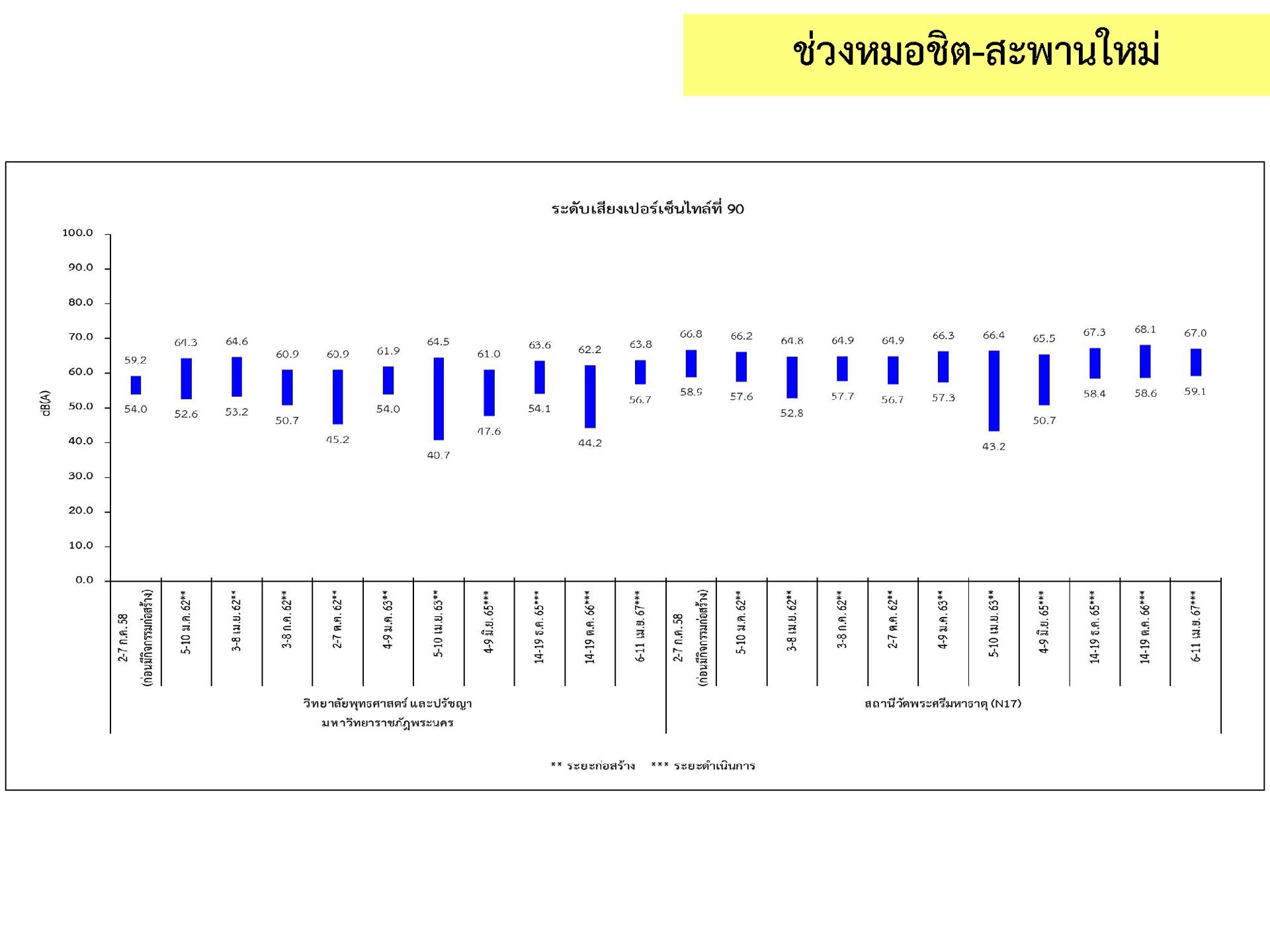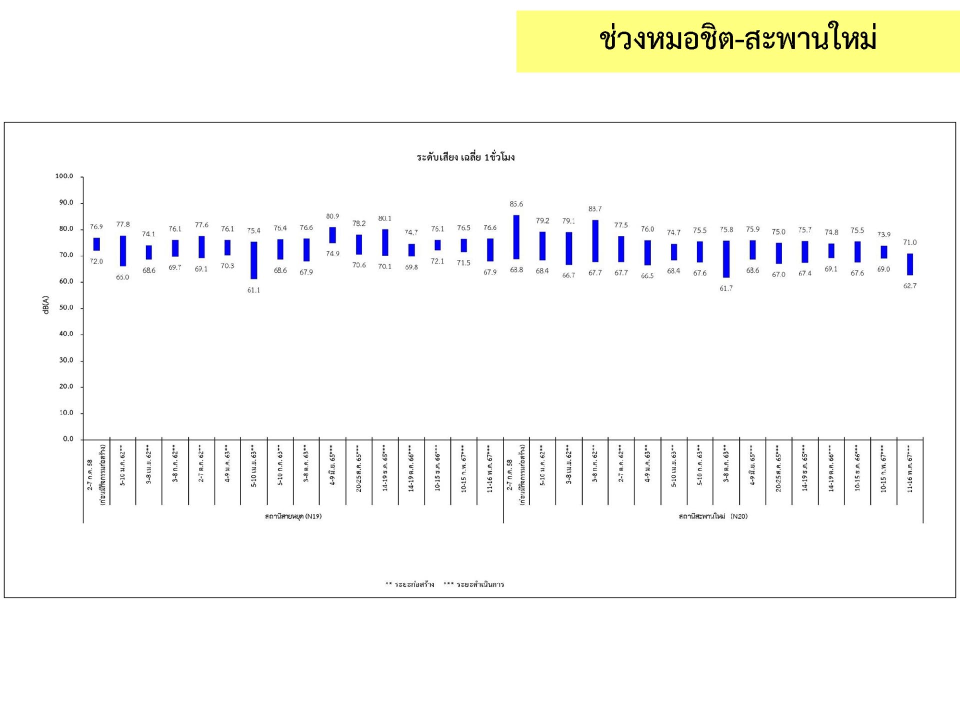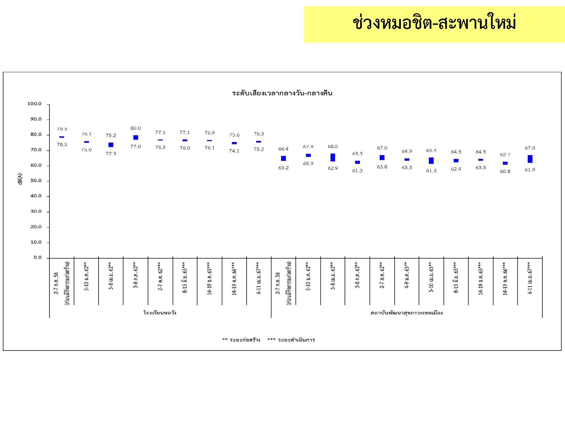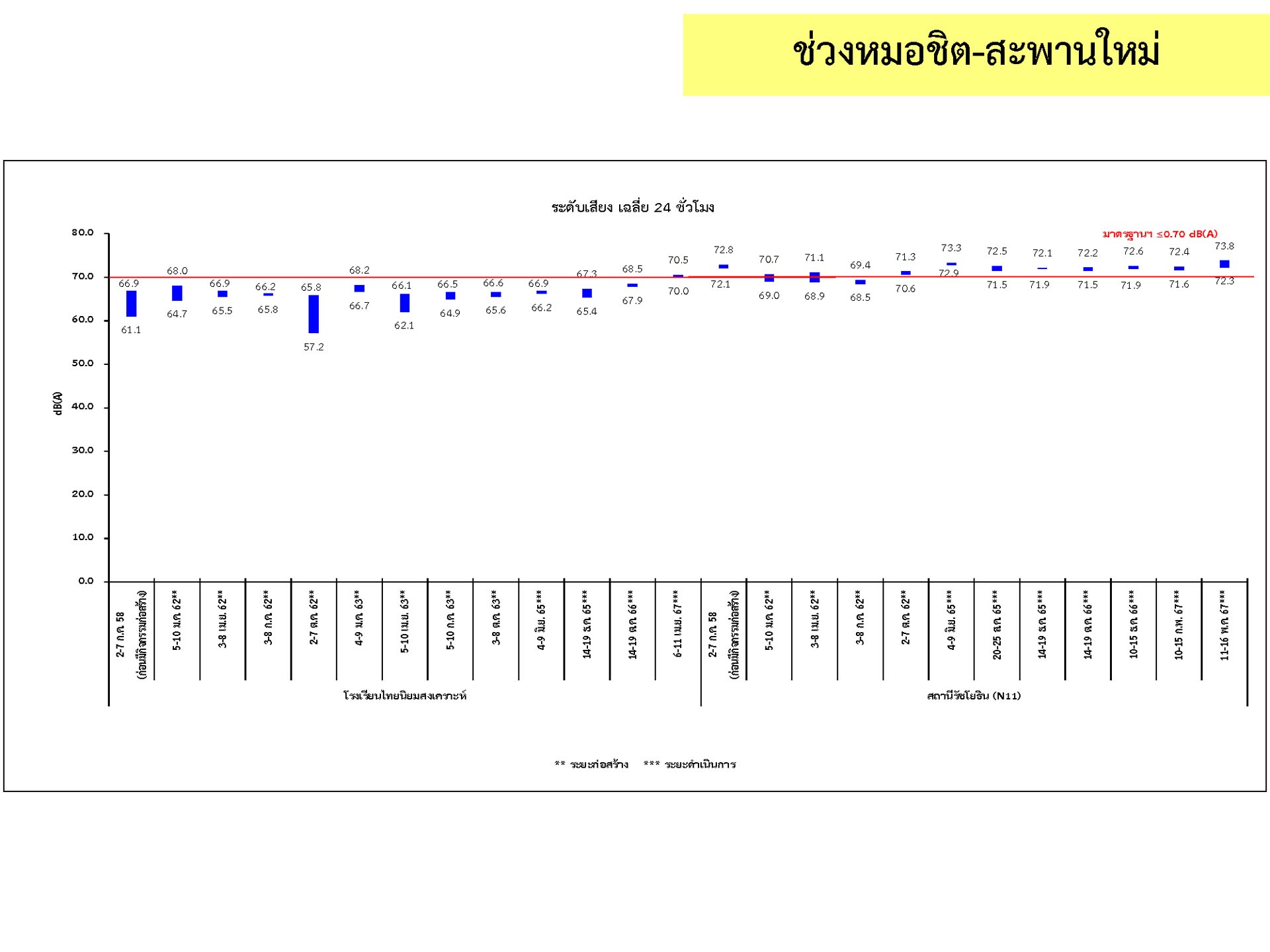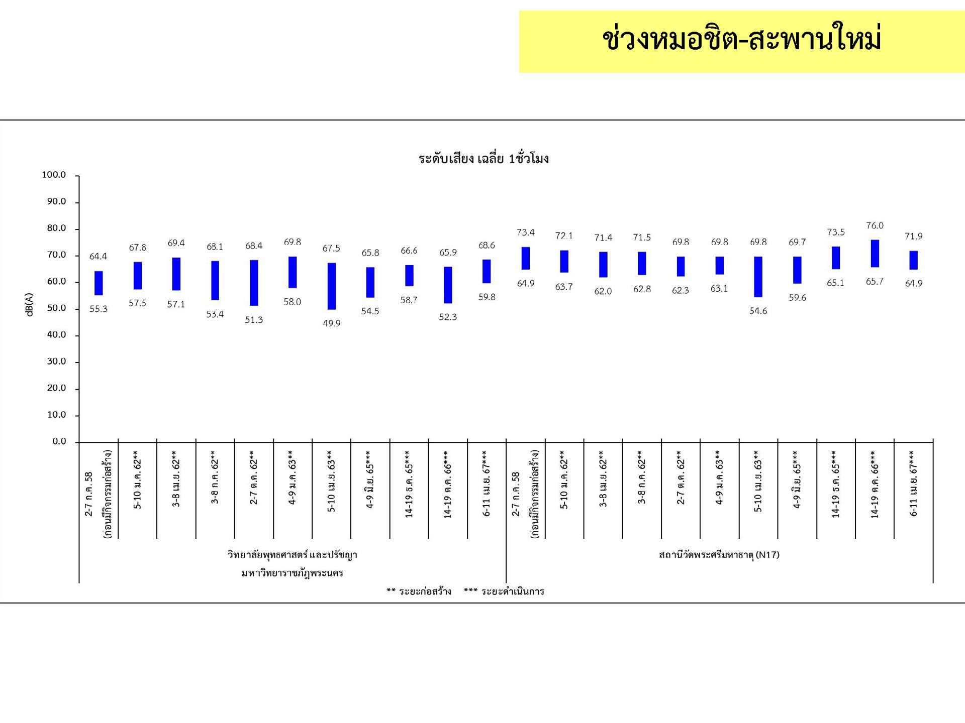 ดูดซับเสียงจากการจราจร ส่วนโรงเรียนไทยนิยมสงเคราะห์ เนื่องจากจุดติดตามตรวจสอบระดับเสียงตั้งอยู่ภายในบริเวณโรงเรียนไทยนิยมสังเคราะห์ ซึ่งอยู่ในช่วงที่มีกิจกรรมการปรับปรุงอาคารภายในโรงเรียน จึงทำให้ระดับเสียงเฉลี่ย 24 ชั่วโมงมีค่าเกินมาตรฐาน ขณะที่ระดับเสียงสูงสุด มีค่าอยู่ในมาตรฐานระดับเสียงโดยทั่วไป ตามประกาศคณะกรรมการสิ่งแวดล้อมแห่งชาติ ฉบับที่ 15 (พ.ศ. 2540) ที่กำหนดให้ระดับเสียงสูงสุด มีค่าได้ไม่เกิน 115 เดซิเบลเอ สำหรับระดับเสียงเฉลี่ย 1 ชั่วโมง ระดับเสียงเปอร์เซ็นไทล์ที่ 90 และระดับเสียงเฉลี่ยกลางวัน-กลางคืน ยังไม่มีมาตรฐานกำหนด