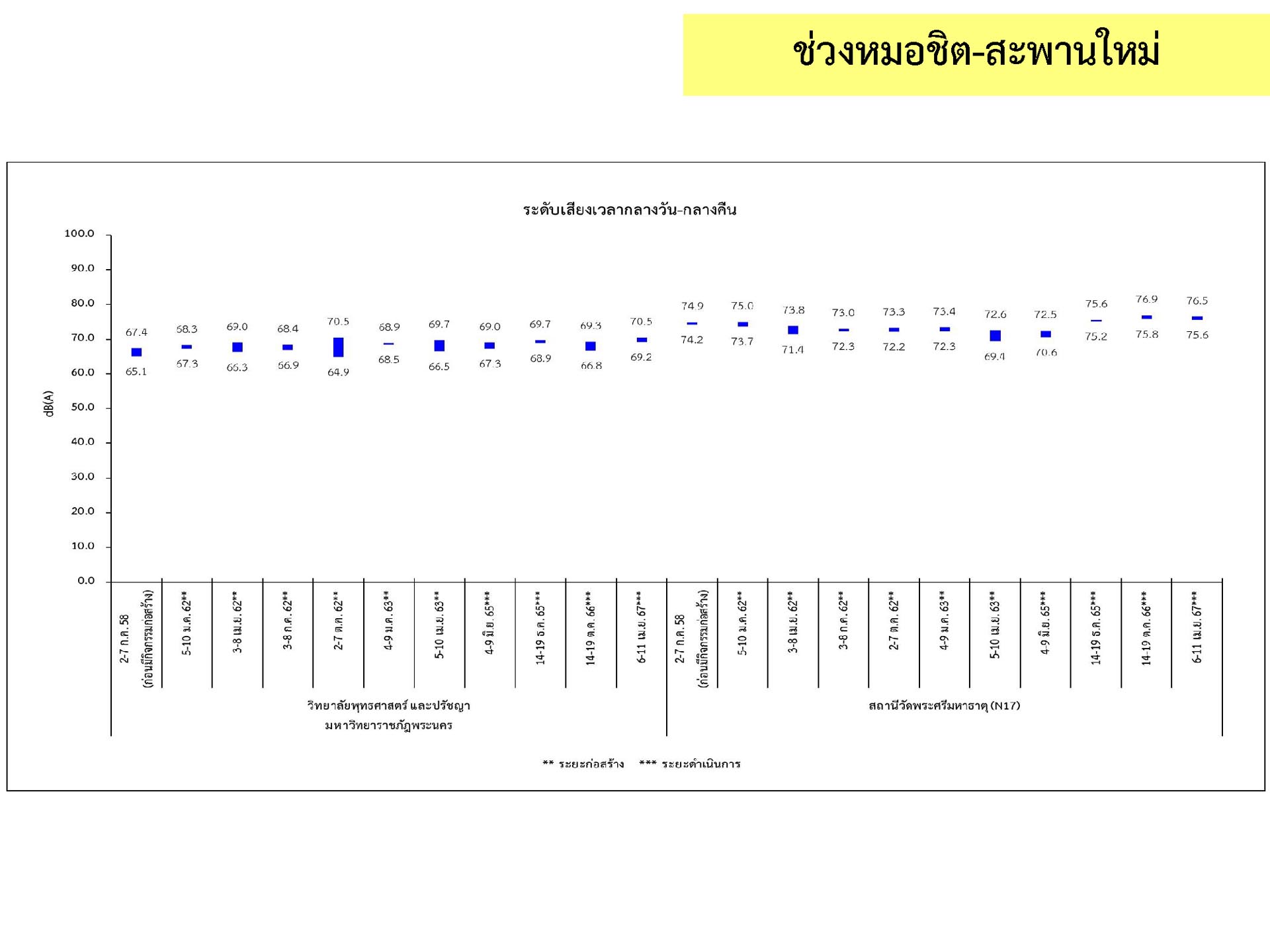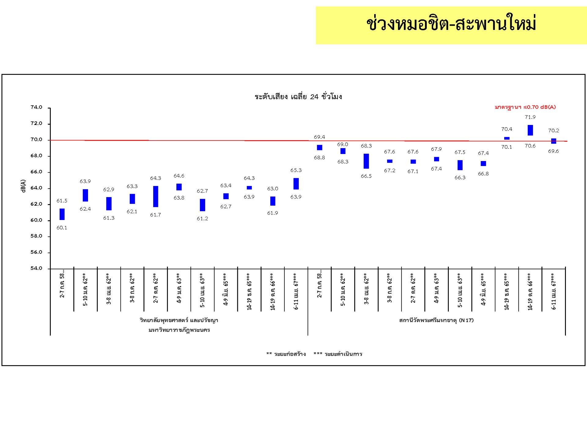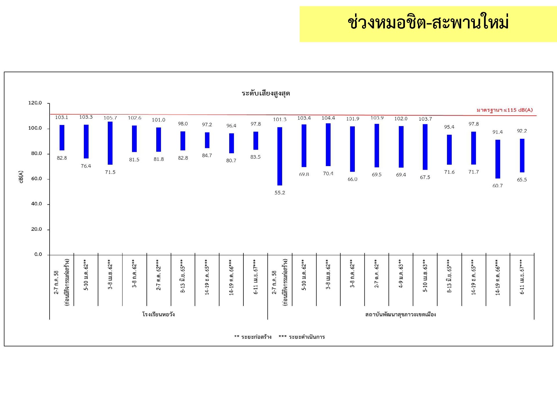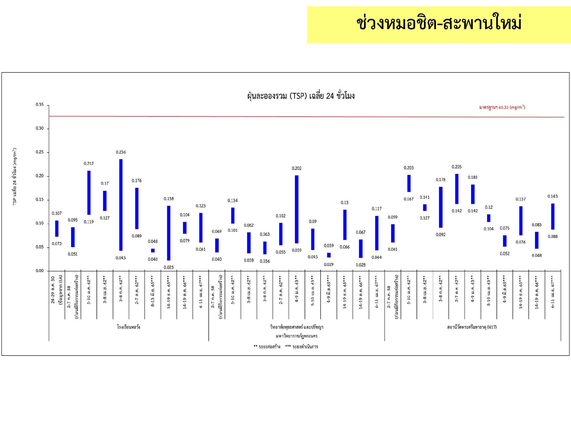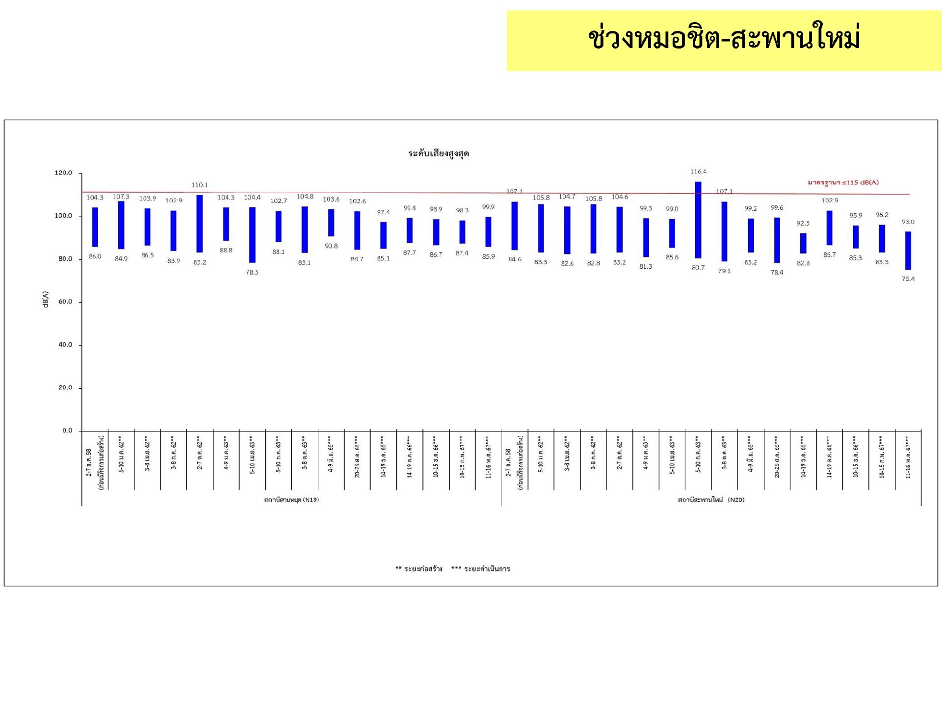 ดูดซับเสียงจากการจราจร ส่วนโรงเรียนไทยนิยมสงเคราะห์ เนื่องจากจุดติดตามตรวจสอบระดับเสียงตั้งอยู่ภายในบริเวณโรงเรียนไทยนิยมสังเคราะห์ ซึ่งอยู่ในช่วงที่มีกิจกรรมการปรับปรุงอาคารภายในโรงเรียน จึงทำให้ระดับเสียงเฉลี่ย 24 ชั่วโมงมีค่าเกินมาตรฐาน ขณะที่ระดับเสียงสูงสุด มีค่าอยู่ในมาตรฐานระดับเสียงโดยทั่วไป ตามประกาศคณะกรรมการสิ่งแวดล้อมแห่งชาติ ฉบับที่ 15 (พ.ศ. 2540) ที่กำหนดให้ระดับเสียงสูงสุด มีค่าได้ไม่เกิน 115 เดซิเบลเอ สำหรับระดับเสียงเฉลี่ย 1 ชั่วโมง ระดับเสียงเปอร์เซ็นไทล์ที่ 90 และระดับเสียงเฉลี่ยกลางวัน-กลางคืน ยังไม่มีมาตรฐานกำหนด