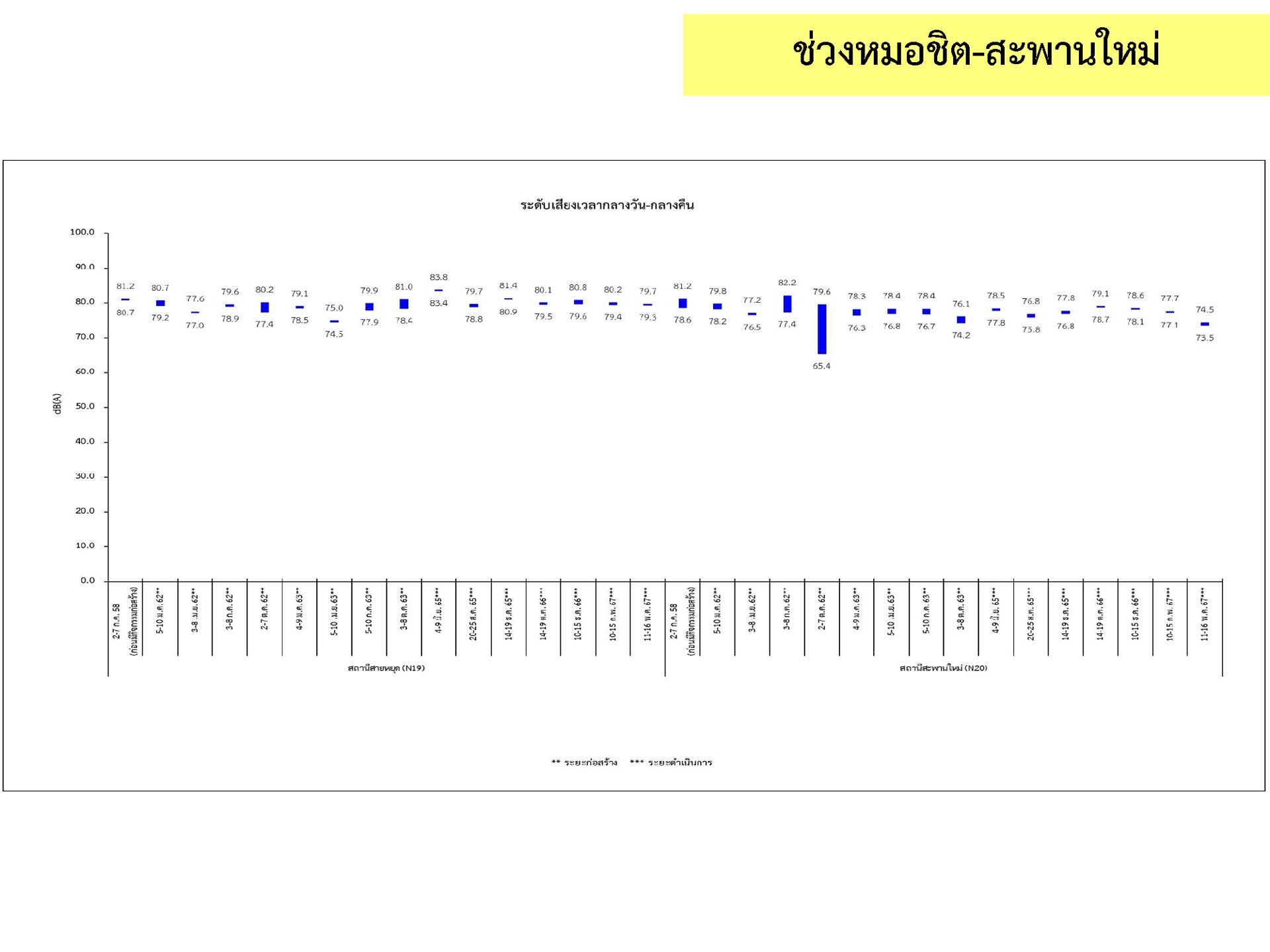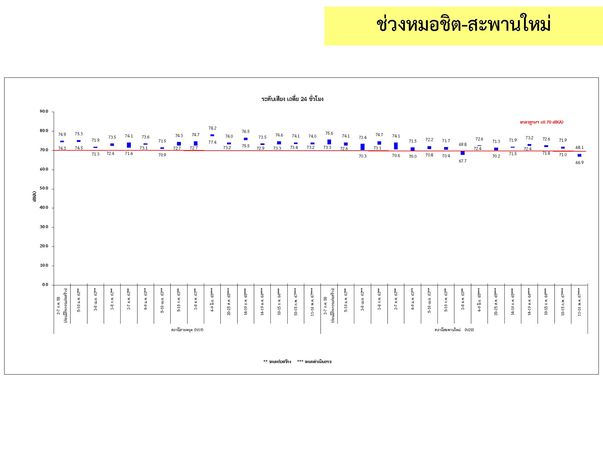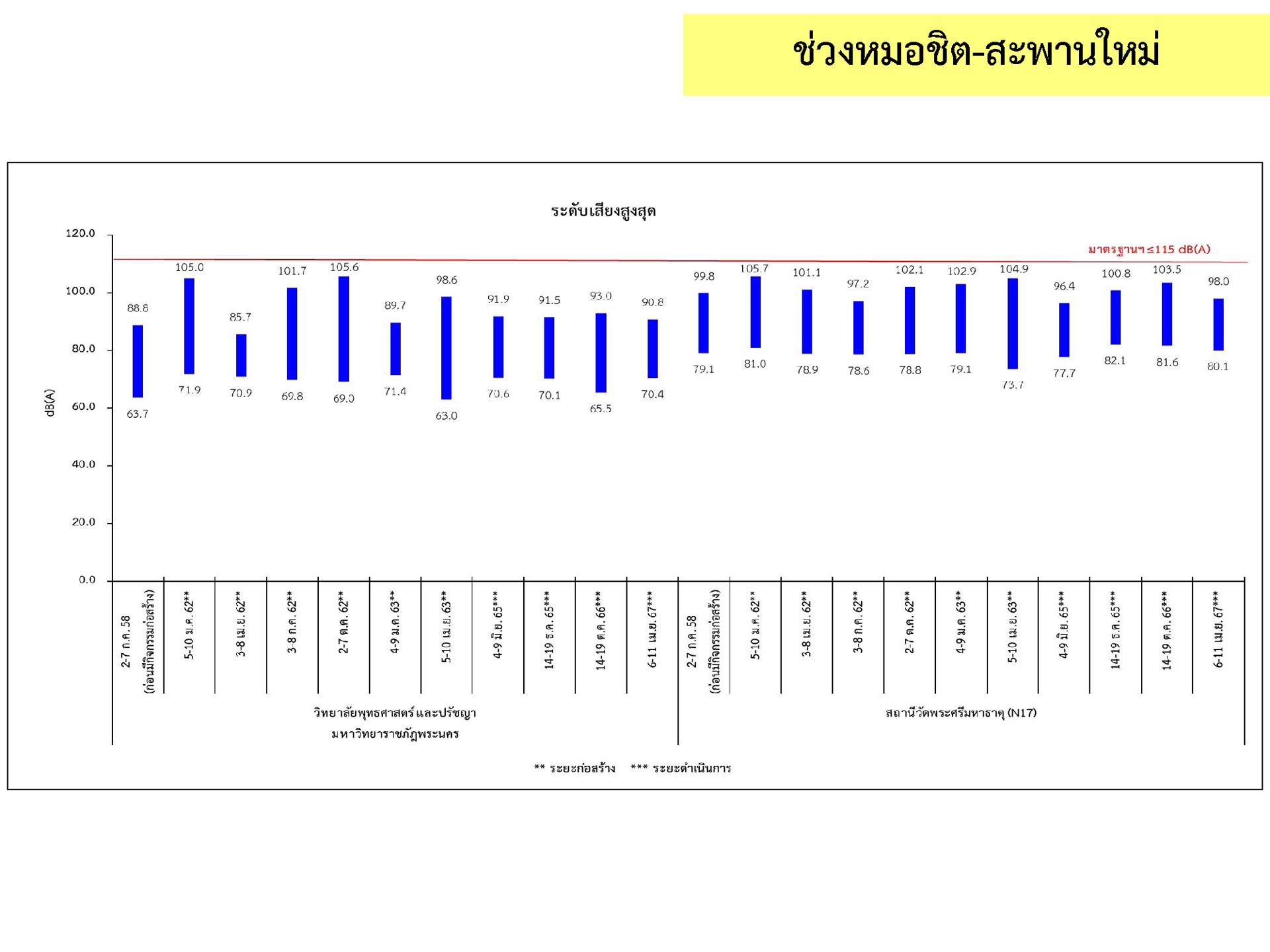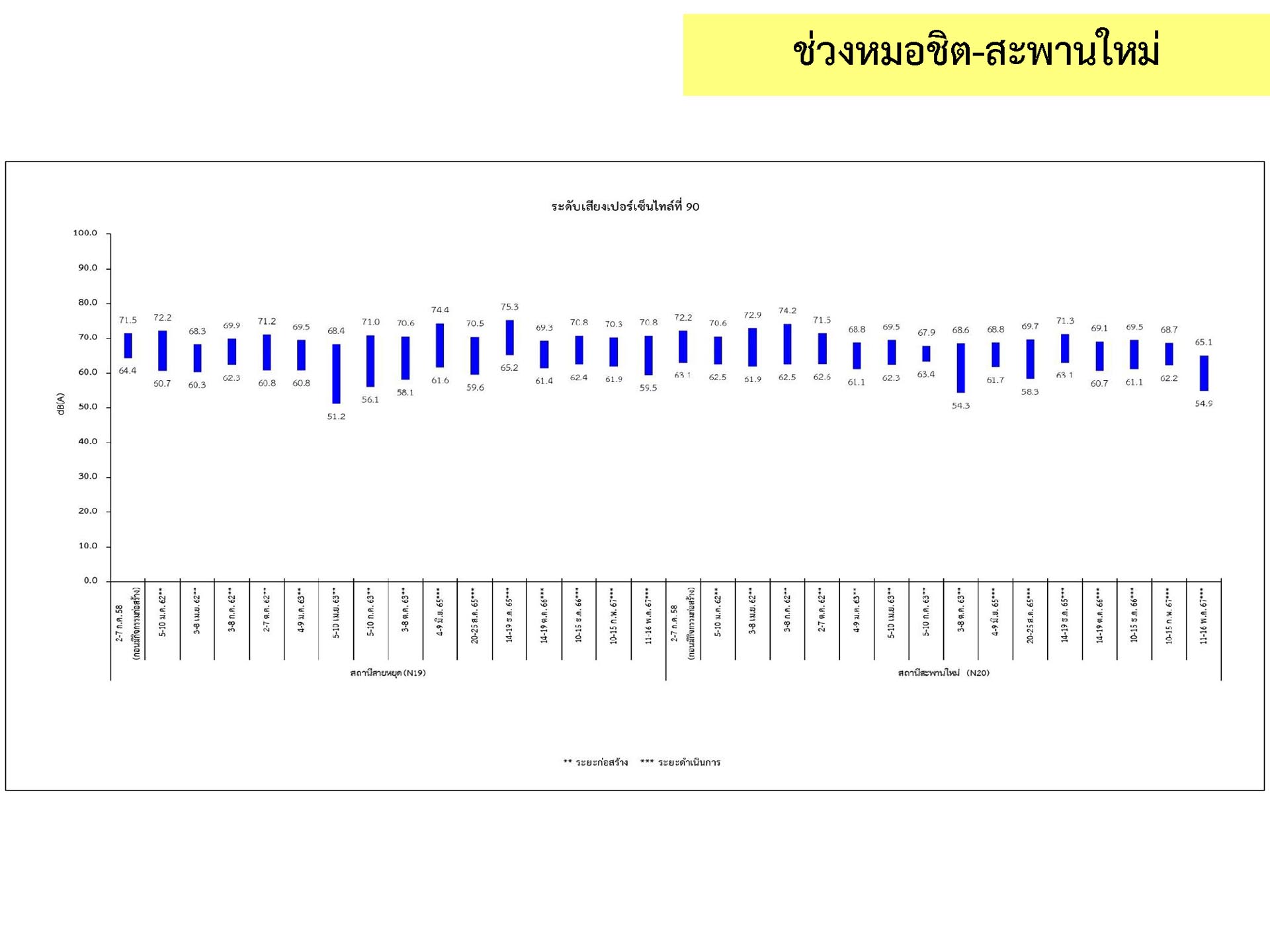 ดูดซับเสียงจากการจราจร ส่วนโรงเรียนไทยนิยมสงเคราะห์ เนื่องจากจุดติดตามตรวจสอบระดับเสียงตั้งอยู่ภายในบริเวณโรงเรียนไทยนิยมสังเคราะห์ ซึ่งอยู่ในช่วงที่มีกิจกรรมการปรับปรุงอาคารภายในโรงเรียน จึงทำให้ระดับเสียงเฉลี่ย 24 ชั่วโมงมีค่าเกินมาตรฐาน ขณะที่ระดับเสียงสูงสุด มีค่าอยู่ในมาตรฐานระดับเสียงโดยทั่วไป ตามประกาศคณะกรรมการสิ่งแวดล้อมแห่งชาติ ฉบับที่ 15 (พ.ศ. 2540) ที่กำหนดให้ระดับเสียงสูงสุด มีค่าได้ไม่เกิน 115 เดซิเบลเอ สำหรับระดับเสียงเฉลี่ย 1 ชั่วโมง ระดับเสียงเปอร์เซ็นไทล์ที่ 90 และระดับเสียงเฉลี่ยกลางวัน-กลางคืน ยังไม่มีมาตรฐานกำหนด