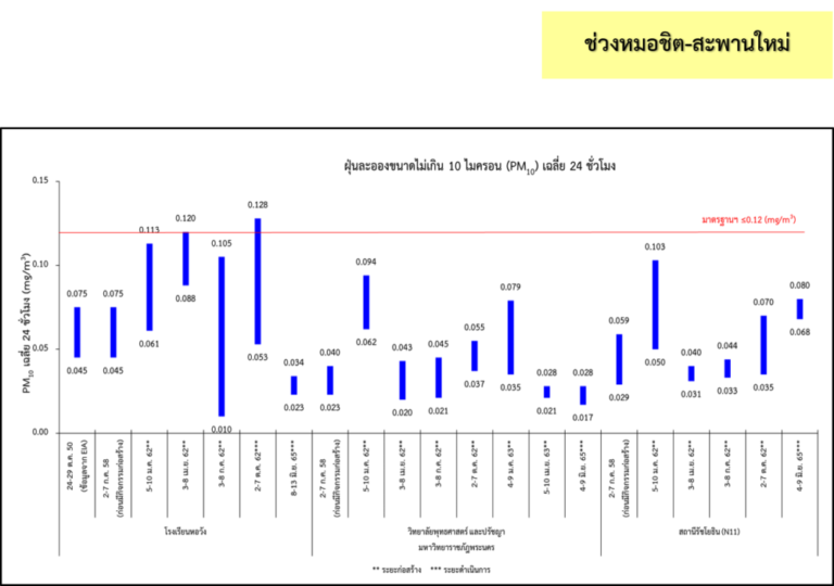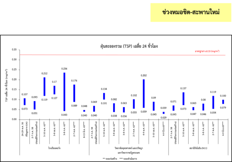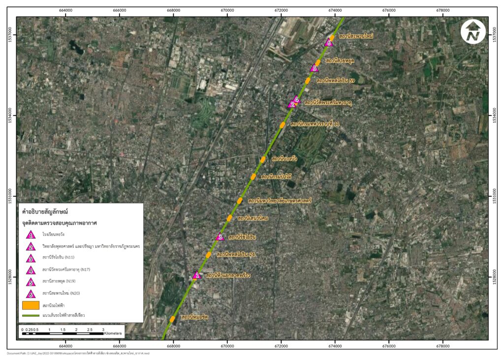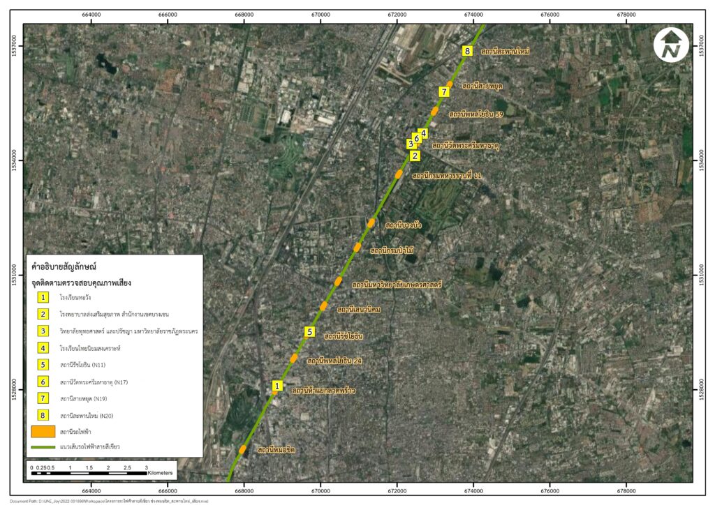 มาตรการกำหนดให้ติดตามตรวจสอบผลกระทบสิ่งแวดล้อม ประกอบด้วย คุณภาพอากาศในบรรยากาศ ตรวจสอบ ปีละ 2 ครั้ง จำนวน 3 สถานี ได้แก่ โรงเรียนหอวัง วิทยาลัยพุทธศาสตร์ และปรัชญา มหาวิทยาลัยราชภัฏพระนคร และสถานีวัดพระศรีมหาธาตุ (N17) และติดตามตรวจสอบทุก 3 ปี ปีละ 4 ครั้ง จำนวน 3 สถานี ได้แก่ สถานีรัชโยธิน (N11) สถานีสายหยุด (N19) และสถานีสะพานใหม่ (N20) สำหรับระดับเสียงโดยทั่วไป ติดตามตรวจสอบ ปีละ 2 ครั้ง จำนวน 5 สถานี คือ โรงเรียนหอวัง วิทยาลัยพุทธศาสตร์ และปรัชญา มหาวิทยาลัยราชภัฏพระนคร โรงเรียนไทยนิยมสงเคราะห์ สถาบันพัฒนาสุขภาวะเขตเมือง (เดิมชื่อ รพ.ส่งเสริมสุขภาพ สำนักงานบางเขน) และสถานีวัดพระศรีมหาธาตุ (N17) และติดตามตรวจสอบทุก 3 ปี ปีละ 4 ครั้ง จำนวน 3 สถานี ได้แก่ สถานีรัชโยธิน (N11) สถานีสายหยุด (N19) และสถานีสะพานใหม่ (N20) การติดตามตรวจสอบสาธารณสุข อาชีวอนามัยและความปลอดภัย ปีละ 1 ครั้ง โดยในช่วงเดือนมกราคม-มิถุนายน พ.ศ. 2565 ทางโครงการได้ปฏิบัติตามข้อกำหนดในรายงานฯ ที่ได้กำหนดไว้