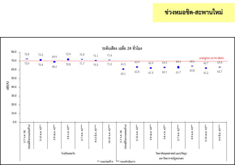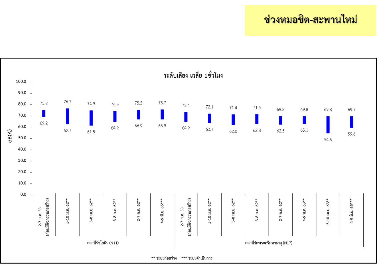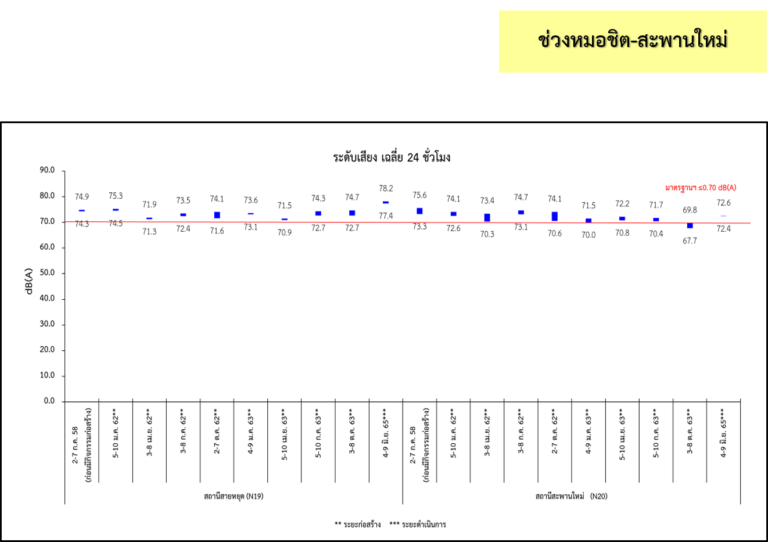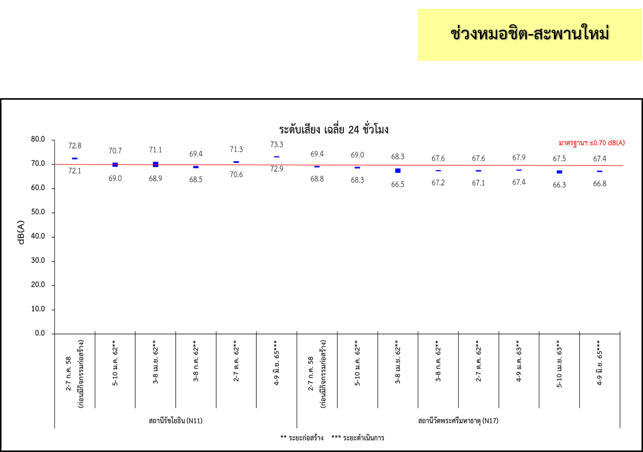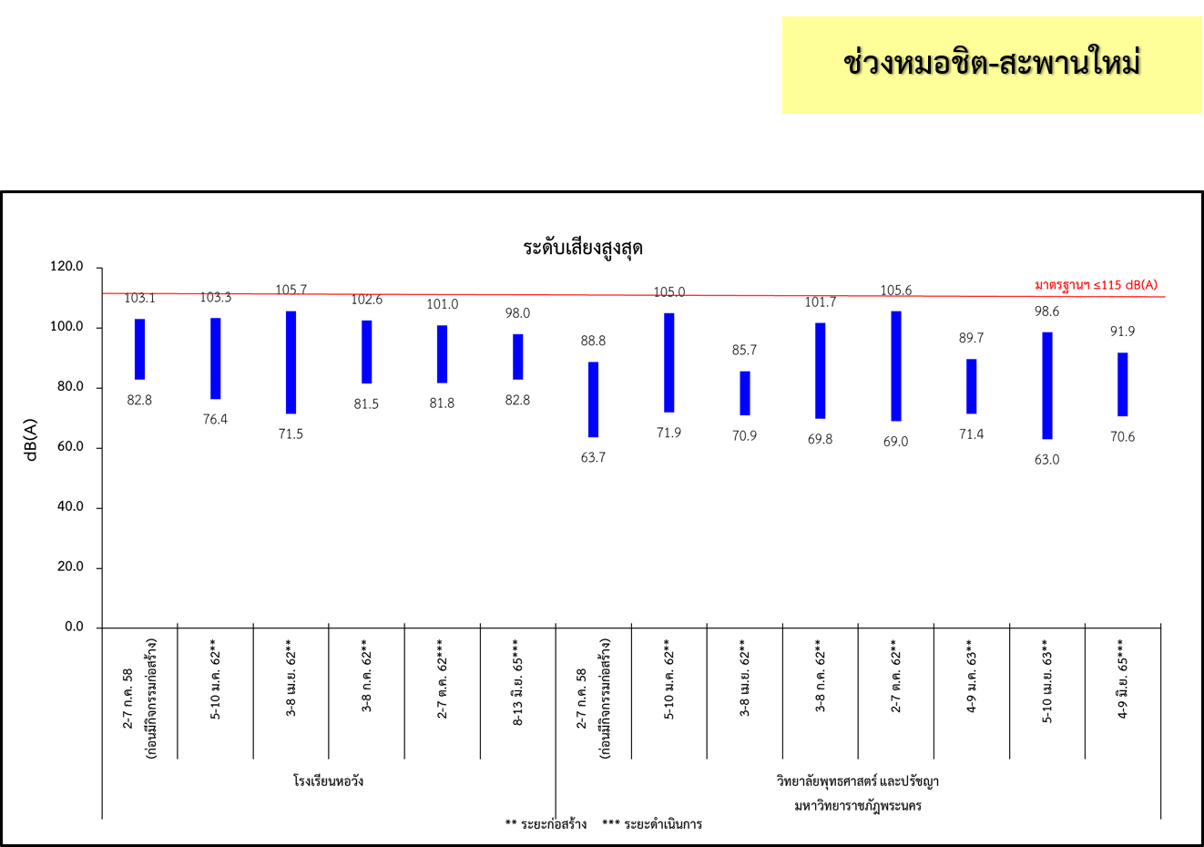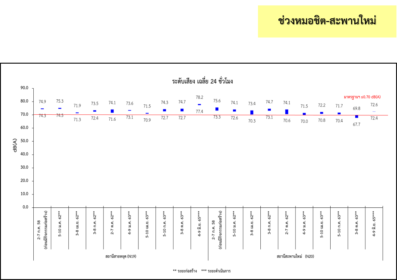 ผลการติดตามตรวจสอบระดับเสียงทั่วไป ได้แก่ ระดับเสียงเฉลี่ย 1 ชั่วโมง ระดับเสียงเฉลี่ย 24 ชั่วโมง ระดับเสียงเปอร์เซ็นไทล์ที่ 90 ระดับเสียงเฉลี่ยกลางวัน-กลางคืน และระดับเสียงสูงสุด ระหว่างปี พ.ศ. 2562-2565 พบว่า ระดับเสียงเฉลี่ย 24 ชั่วโมง ส่วนใหญ่มีค่าอยู่ในเกณฑ์มาตรฐาน ยกเว้นบริเวณโรงเรียนหอวัง สถานีรัชโยธิน สถานีสายหยุด และสถานีสะพานใหม่ ซึ่งมีค่าไม่อยู่ในมาตรฐานตามประกาศคณะกรรมการสิ่งแวดล้อมแห่งชาติ ฉบับที่ 15 (พ.ศ. 2540) เรื่อง กำหนดมาตรฐานระดับเสียงโดยทั่วไป ลงวันที่ 12 มีนาคม พ.ศ. 2540 ประกาศในราชกิจจานุเบกษา เล่ม 114 ตอนที่ 27 ง วันที่ 3 เมษายน พ.ศ. 2540 ที่กำหนดให้ระดับเสียงเฉลี่ย 24 ชั่วโมง มีค่าได้ไม่เกิน 70 เดซิเบลเอ เนื่องจากจุดติดตามตรวจสอบอยู่ติดกับถนน ซึ่งมีการจราจรหนาแน่นและติดขัดตลอดทั้งวัน ขณะที่ระดับเสียงสูงสุด มีค่าอยู่ในมาตรฐานระดับเสียงโดยทั่วไป ตามประกาศคณะกรรมการสิ่งแวดล้อมแห่งชาติ ฉบับที่ 15 (พ.ศ. 2540) ที่กำหนดให้ระดับเสียงสูงสุด มีค่าได้ไม่เกิน 115 เดซิเบลเอ สำหรับระดับเสียงเฉลี่ย 1 ชั่วโมง ระดับเสียงเปอร์เซ็นไทล์ที่ 90 และระดับเสียงเฉลี่ยกลางวัน-กลางคืน ยังไม่มีมาตรฐานกำหนด