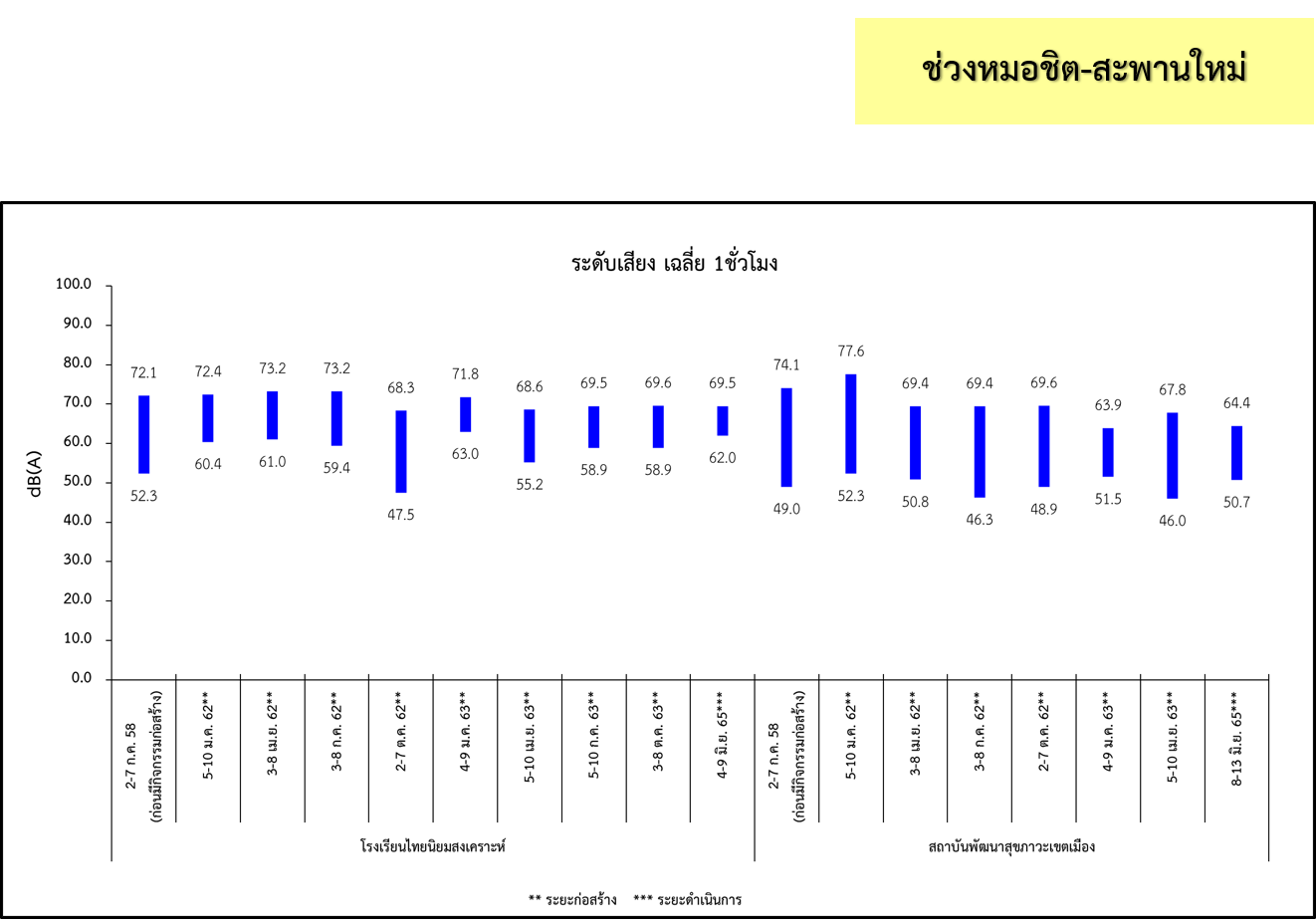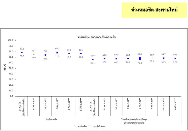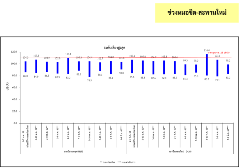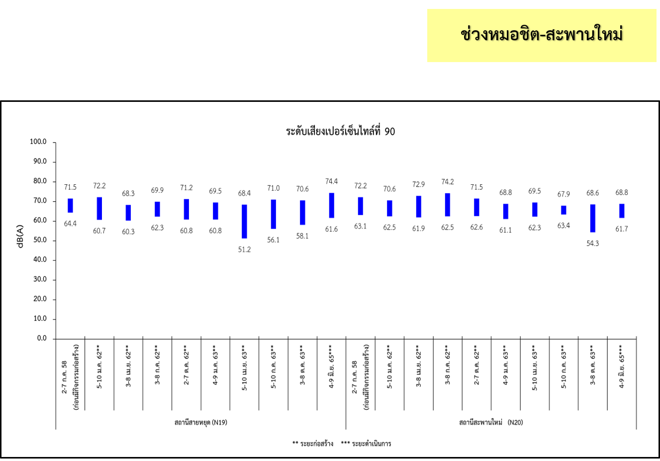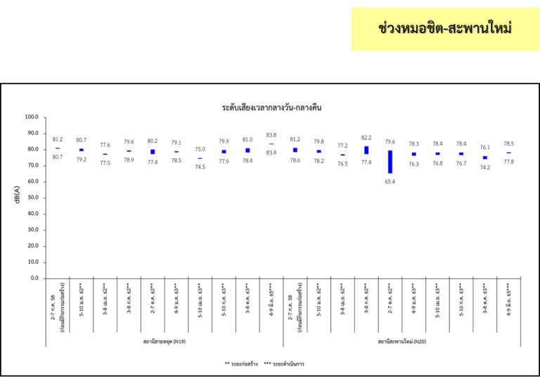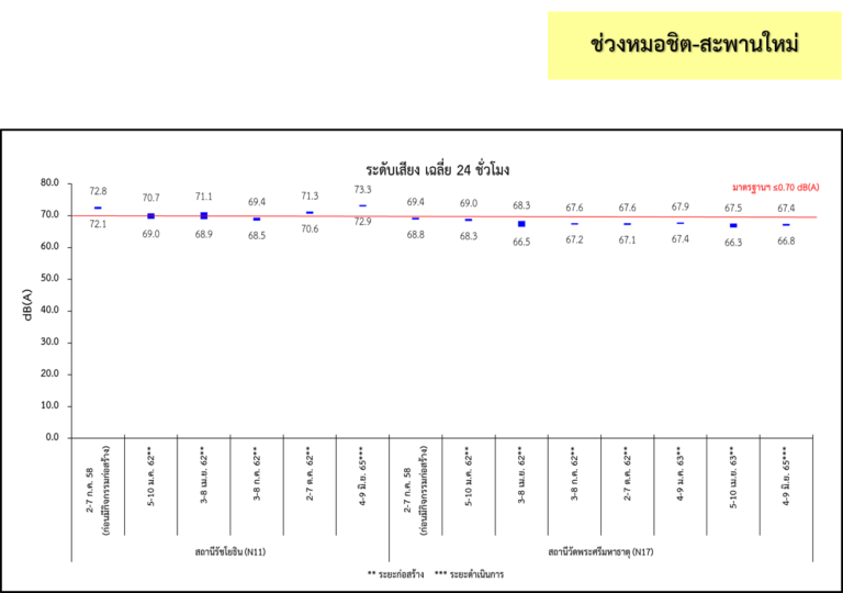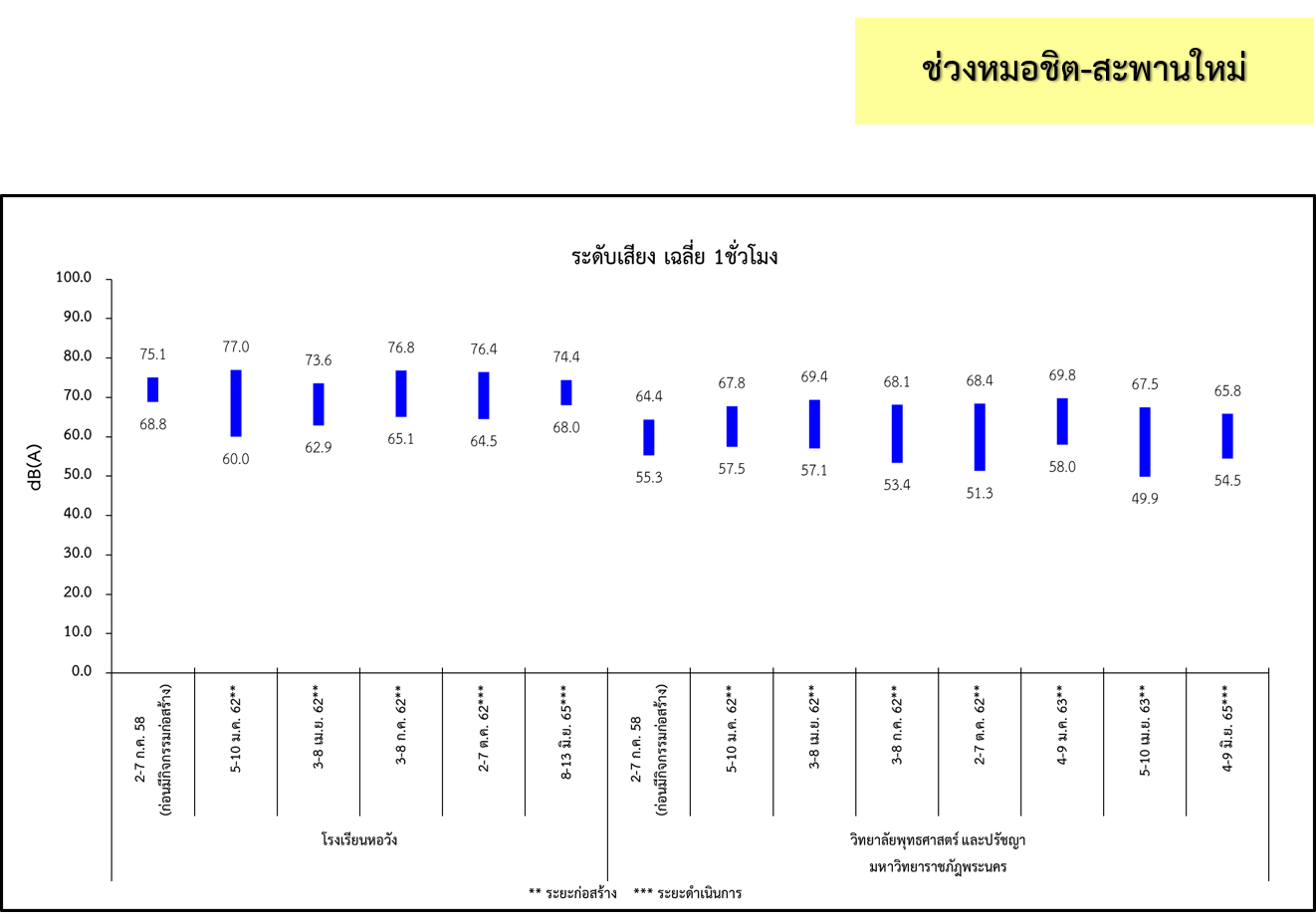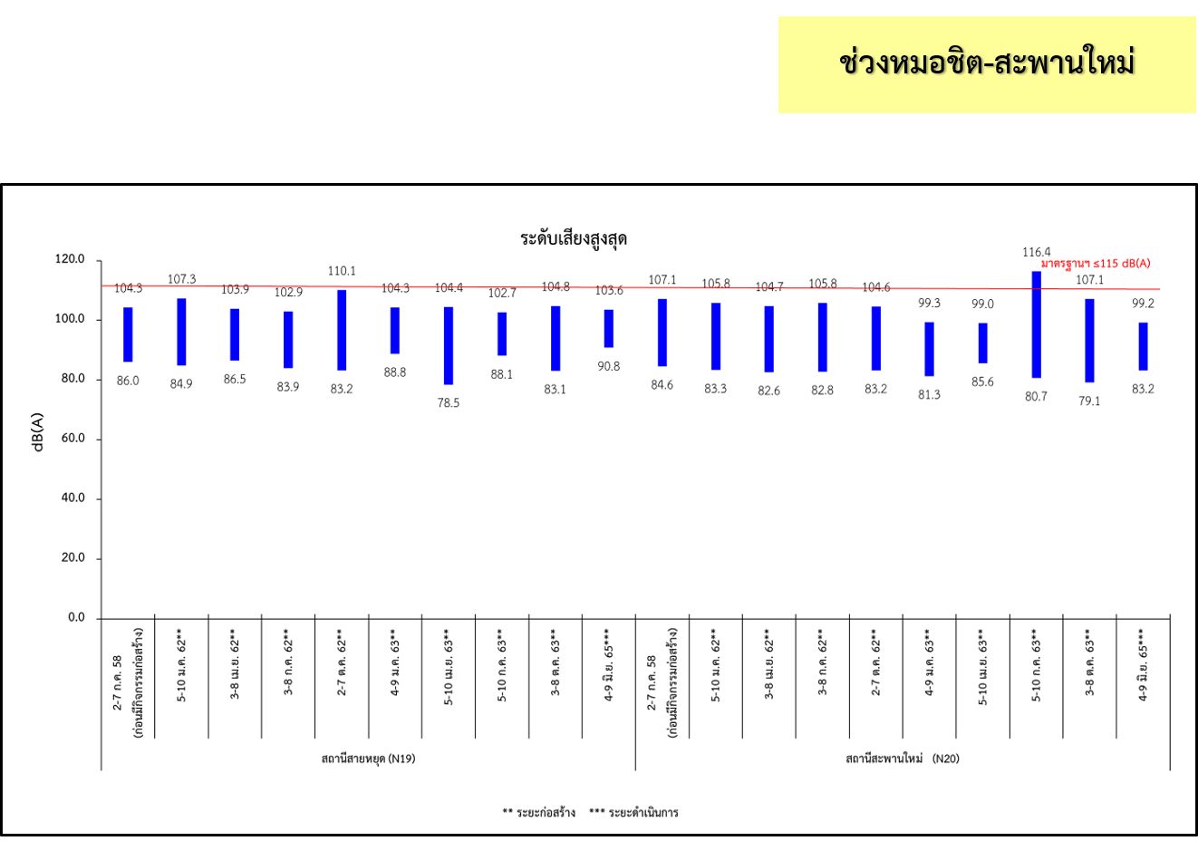 ผลการติดตามตรวจสอบระดับเสียงทั่วไป ได้แก่ ระดับเสียงเฉลี่ย 1 ชั่วโมง ระดับเสียงเฉลี่ย 24 ชั่วโมง ระดับเสียงเปอร์เซ็นไทล์ที่ 90 ระดับเสียงเฉลี่ยกลางวัน-กลางคืน และระดับเสียงสูงสุด ระหว่างปี พ.ศ. 2562-2565 พบว่า ระดับเสียงเฉลี่ย 24 ชั่วโมง ส่วนใหญ่มีค่าอยู่ในเกณฑ์มาตรฐาน ยกเว้นบริเวณโรงเรียนหอวัง สถานีรัชโยธิน สถานีสายหยุด และสถานีสะพานใหม่ ซึ่งมีค่าไม่อยู่ในมาตรฐานตามประกาศคณะกรรมการสิ่งแวดล้อมแห่งชาติ ฉบับที่ 15 (พ.ศ. 2540) เรื่อง กำหนดมาตรฐานระดับเสียงโดยทั่วไป ลงวันที่ 12 มีนาคม พ.ศ. 2540 ประกาศในราชกิจจานุเบกษา เล่ม 114 ตอนที่ 27 ง วันที่ 3 เมษายน พ.ศ. 2540 ที่กำหนดให้ระดับเสียงเฉลี่ย 24 ชั่วโมง มีค่าได้ไม่เกิน 70 เดซิเบลเอ เนื่องจากจุดติดตามตรวจสอบอยู่ติดกับถนน ซึ่งมีการจราจรหนาแน่นและติดขัดตลอดทั้งวัน ขณะที่ระดับเสียงสูงสุด มีค่าอยู่ในมาตรฐานระดับเสียงโดยทั่วไป ตามประกาศคณะกรรมการสิ่งแวดล้อมแห่งชาติ ฉบับที่ 15 (พ.ศ. 2540) ที่กำหนดให้ระดับเสียงสูงสุด มีค่าได้ไม่เกิน 115 เดซิเบลเอ สำหรับระดับเสียงเฉลี่ย 1 ชั่วโมง ระดับเสียงเปอร์เซ็นไทล์ที่ 90 และระดับเสียงเฉลี่ยกลางวัน-กลางคืน ยังไม่มีมาตรฐานกำหนด