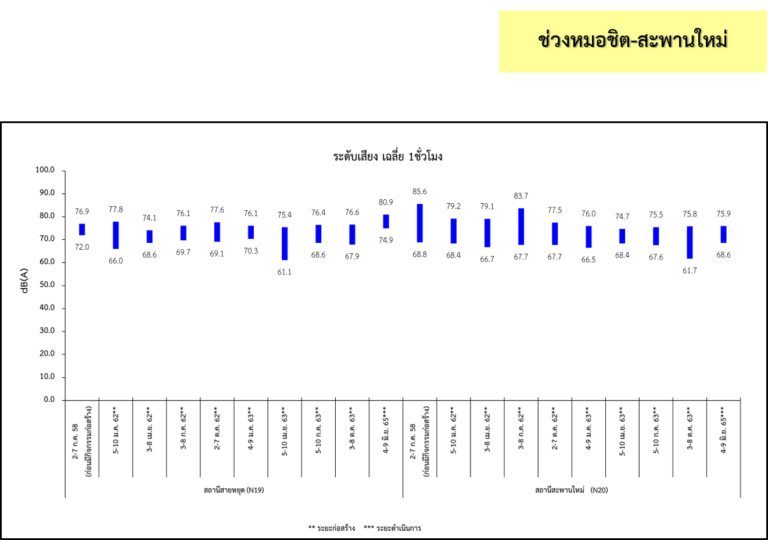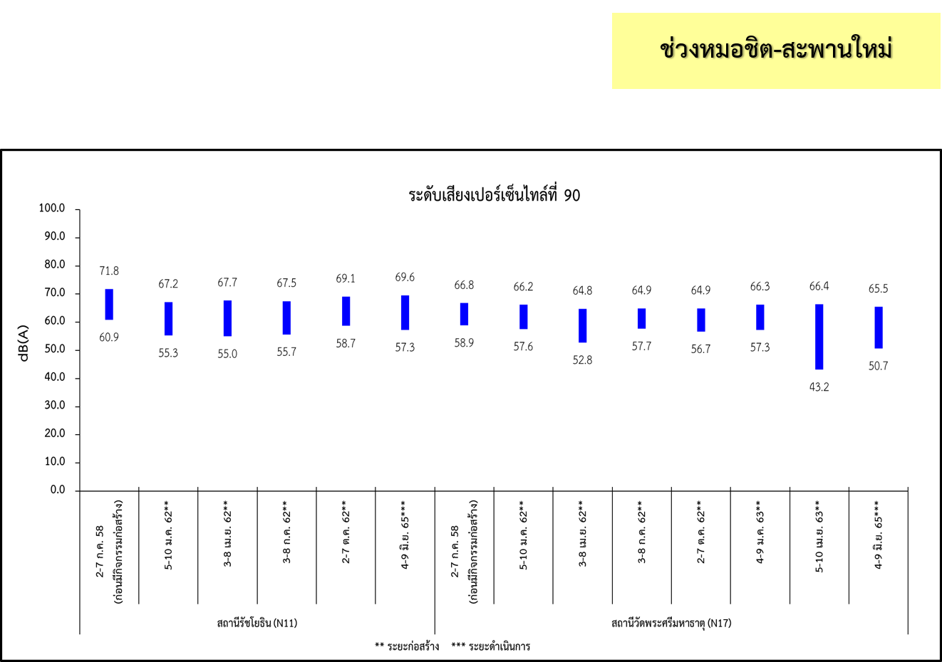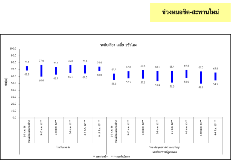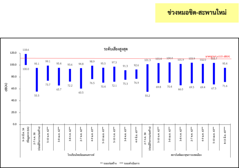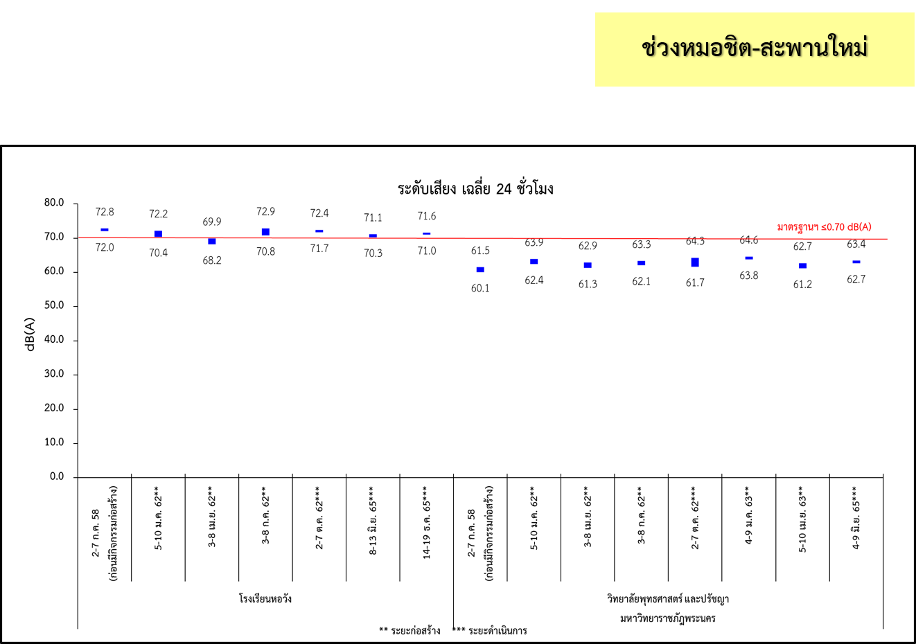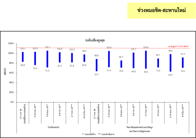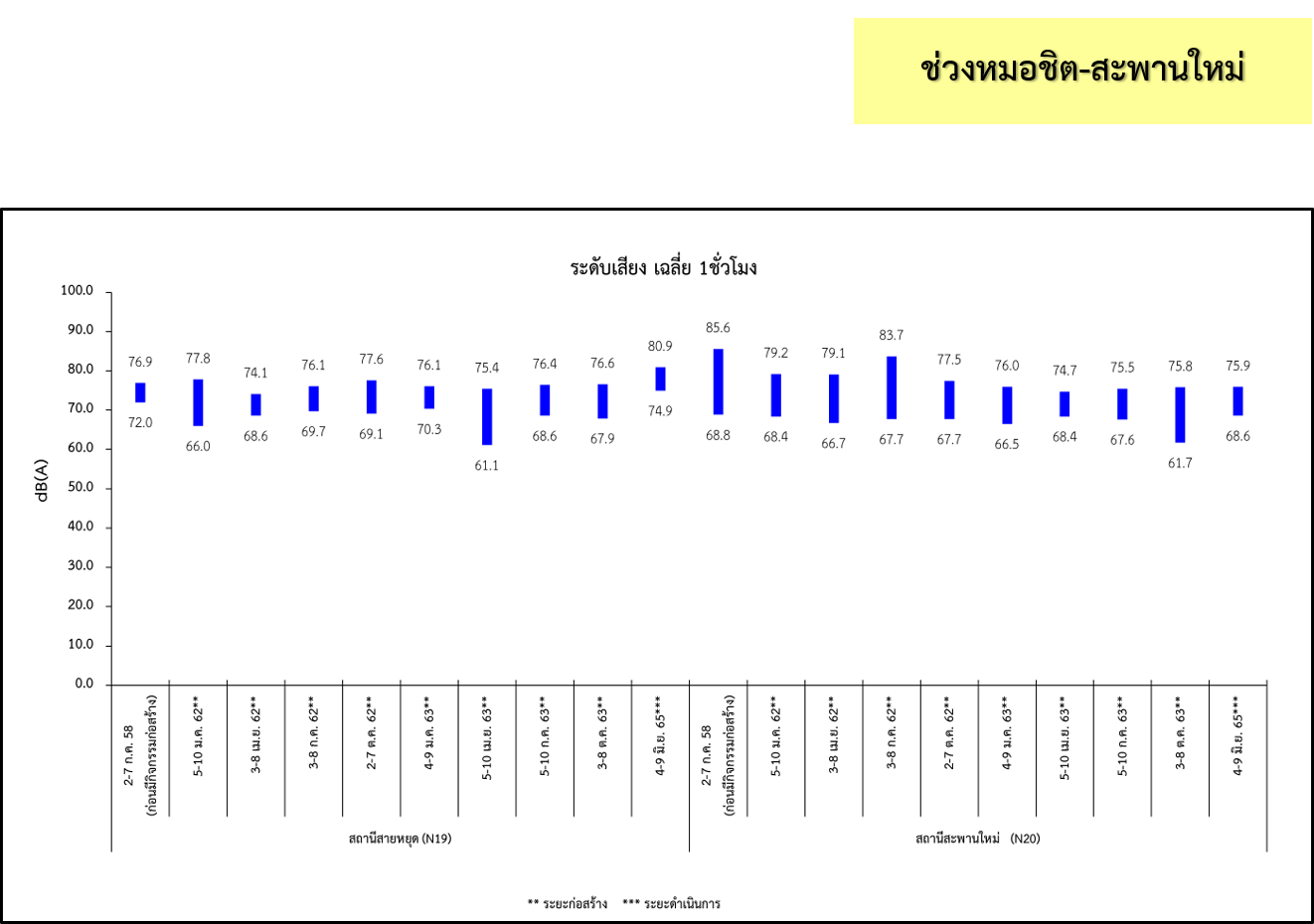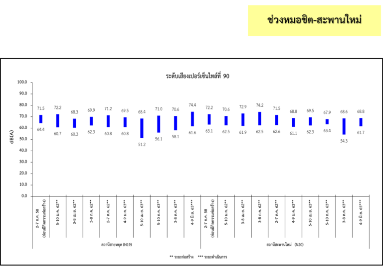 ผลการติดตามตรวจสอบระดับเสียงทั่วไป ได้แก่ ระดับเสียงเฉลี่ย 1 ชั่วโมง ระดับเสียงเฉลี่ย 24 ชั่วโมง ระดับเสียงเปอร์เซ็นไทล์ที่ 90 ระดับเสียงเฉลี่ยกลางวัน-กลางคืน และระดับเสียงสูงสุด ระหว่างปี พ.ศ. 2562-2565 พบว่า ระดับเสียงเฉลี่ย 24 ชั่วโมง ส่วนใหญ่มีค่าอยู่ในเกณฑ์มาตรฐาน ยกเว้นบริเวณโรงเรียนหอวัง สถานีรัชโยธิน สถานีสายหยุด และสถานีสะพานใหม่ ซึ่งมีค่าไม่อยู่ในมาตรฐานตามประกาศคณะกรรมการสิ่งแวดล้อมแห่งชาติ ฉบับที่ 15 (พ.ศ. 2540) เรื่อง กำหนดมาตรฐานระดับเสียงโดยทั่วไป ลงวันที่ 12 มีนาคม พ.ศ. 2540 ประกาศในราชกิจจานุเบกษา เล่ม 114 ตอนที่ 27 ง วันที่ 3 เมษายน พ.ศ. 2540 ที่กำหนดให้ระดับเสียงเฉลี่ย 24 ชั่วโมง มีค่าได้ไม่เกิน 70 เดซิเบลเอ เนื่องจากจุดติดตามตรวจสอบอยู่ติดกับถนน ซึ่งมีการจราจรหนาแน่นและติดขัดตลอดทั้งวัน ขณะที่ระดับเสียงสูงสุด มีค่าอยู่ในมาตรฐานระดับเสียงโดยทั่วไป ตามประกาศคณะกรรมการสิ่งแวดล้อมแห่งชาติ ฉบับที่ 15 (พ.ศ. 2540) ที่กำหนดให้ระดับเสียงสูงสุด มีค่าได้ไม่เกิน 115 เดซิเบลเอ สำหรับระดับเสียงเฉลี่ย 1 ชั่วโมง ระดับเสียงเปอร์เซ็นไทล์ที่ 90 และระดับเสียงเฉลี่ยกลางวัน-กลางคืน ยังไม่มีมาตรฐานกำหนด