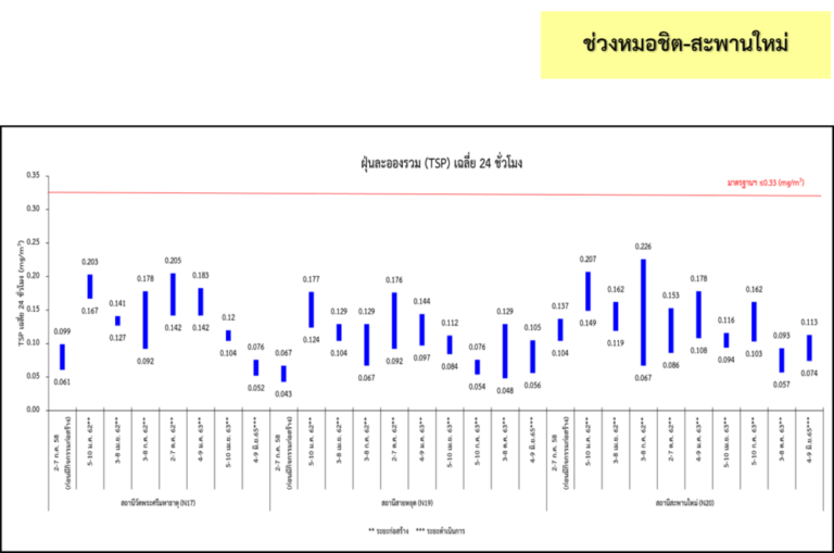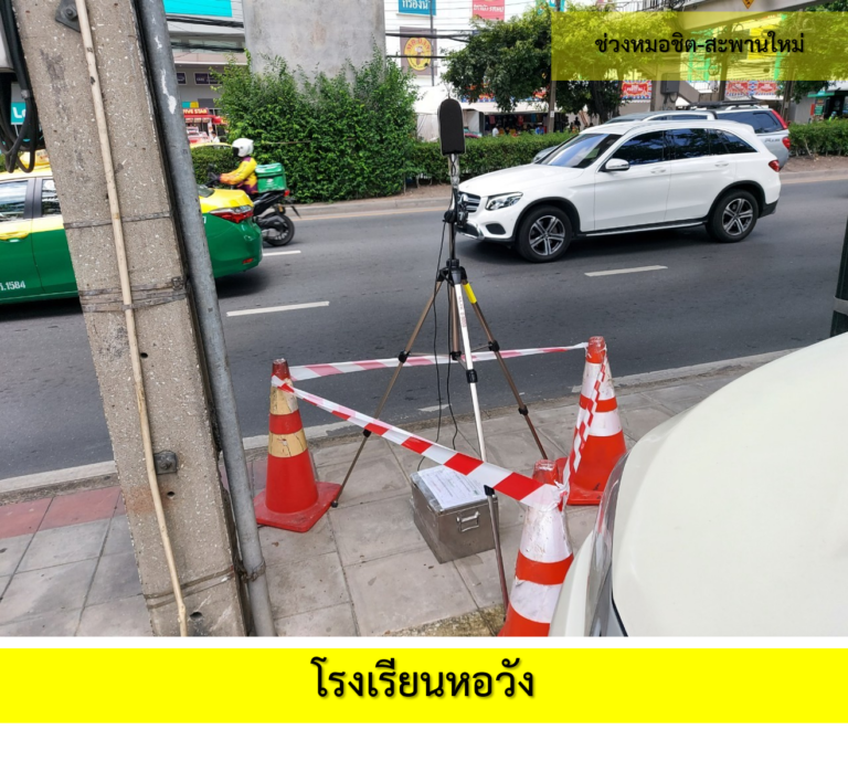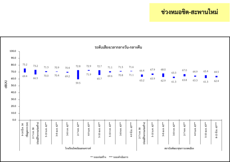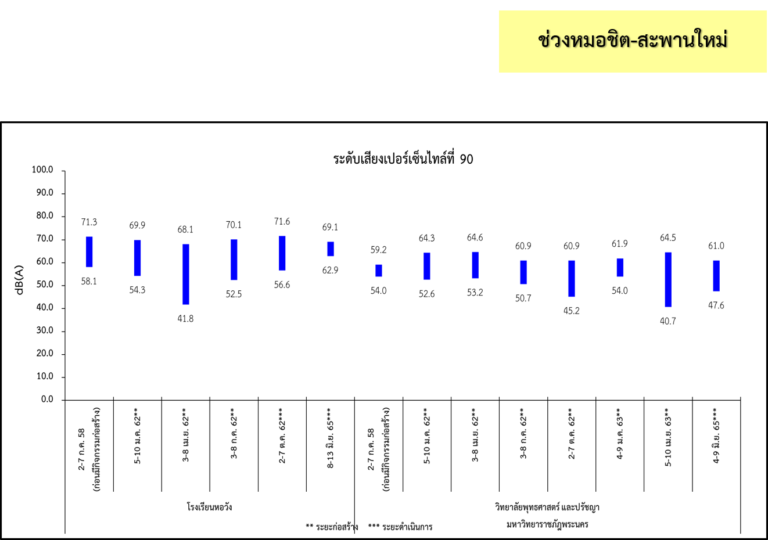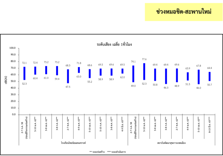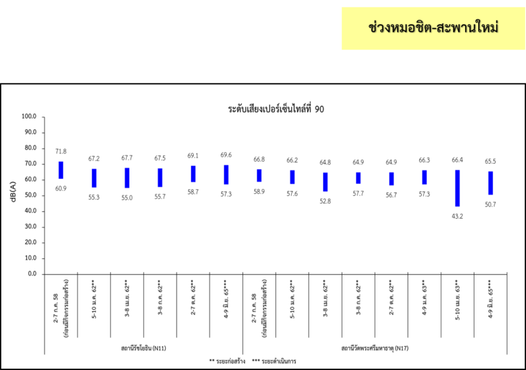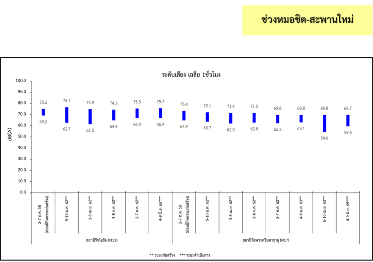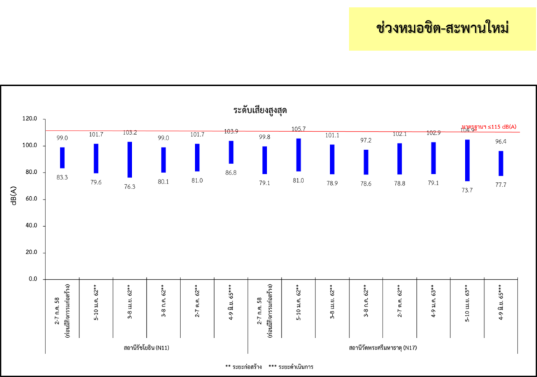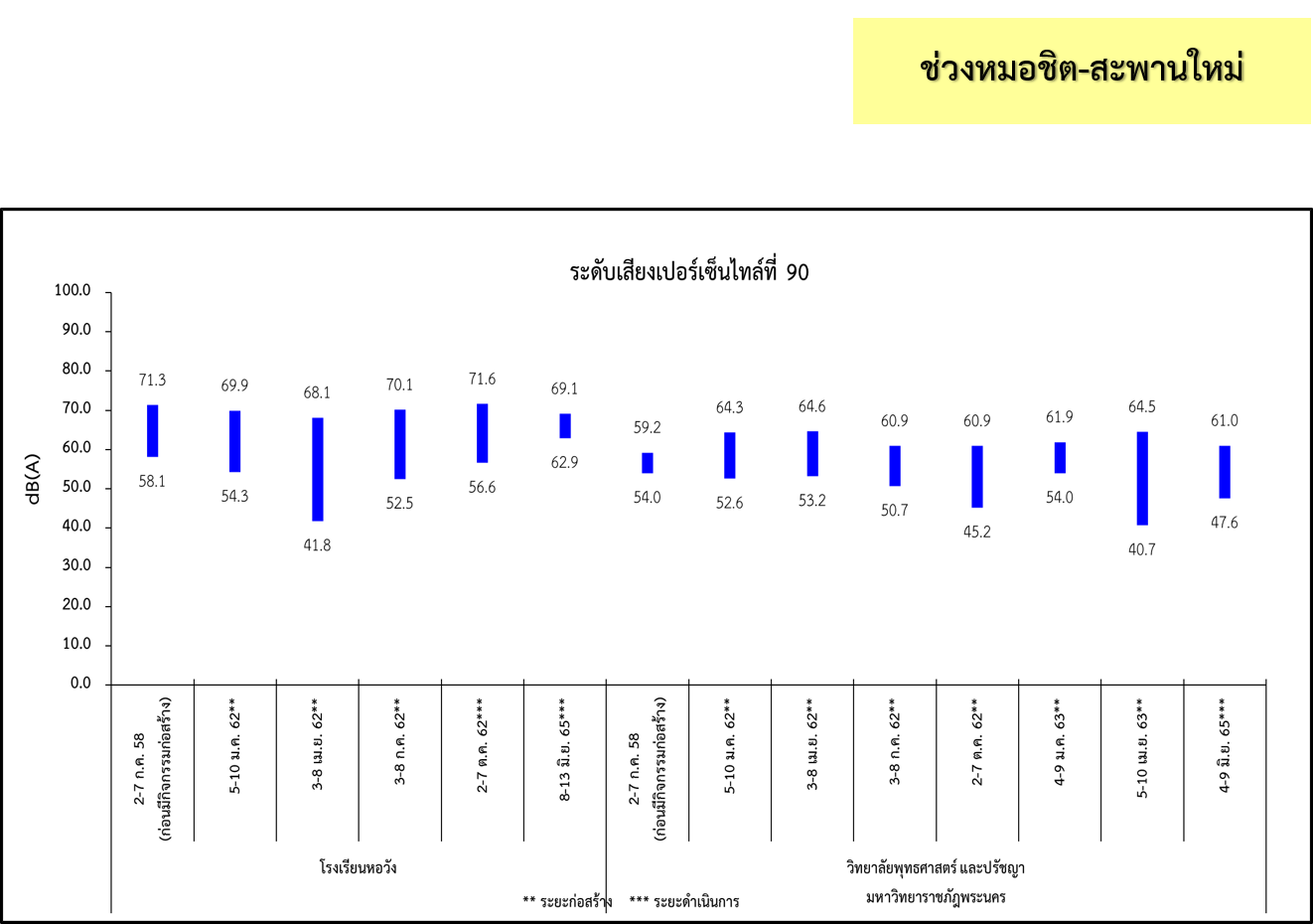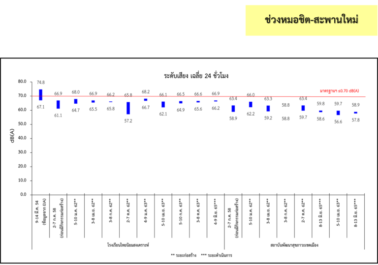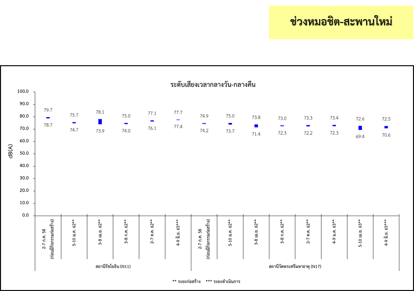 ผลการติดตามตรวจสอบระดับเสียงทั่วไป ได้แก่ ระดับเสียงเฉลี่ย 1 ชั่วโมง ระดับเสียงเฉลี่ย 24 ชั่วโมง ระดับเสียงเปอร์เซ็นไทล์ที่ 90 ระดับเสียงเฉลี่ยกลางวัน-กลางคืน และระดับเสียงสูงสุด ระหว่างปี พ.ศ. 2562-2565 พบว่า ระดับเสียงเฉลี่ย 24 ชั่วโมง ส่วนใหญ่มีค่าอยู่ในเกณฑ์มาตรฐาน ยกเว้นบริเวณโรงเรียนหอวัง สถานีรัชโยธิน สถานีสายหยุด และสถานีสะพานใหม่ ซึ่งมีค่าไม่อยู่ในมาตรฐานตามประกาศคณะกรรมการสิ่งแวดล้อมแห่งชาติ ฉบับที่ 15 (พ.ศ. 2540) เรื่อง กำหนดมาตรฐานระดับเสียงโดยทั่วไป ลงวันที่ 12 มีนาคม พ.ศ. 2540 ประกาศในราชกิจจานุเบกษา เล่ม 114 ตอนที่ 27 ง วันที่ 3 เมษายน พ.ศ. 2540 ที่กำหนดให้ระดับเสียงเฉลี่ย 24 ชั่วโมง มีค่าได้ไม่เกิน 70 เดซิเบลเอ เนื่องจากจุดติดตามตรวจสอบอยู่ติดกับถนน ซึ่งมีการจราจรหนาแน่นและติดขัดตลอดทั้งวัน ขณะที่ระดับเสียงสูงสุด มีค่าอยู่ในมาตรฐานระดับเสียงโดยทั่วไป ตามประกาศคณะกรรมการสิ่งแวดล้อมแห่งชาติ ฉบับที่ 15 (พ.ศ. 2540) ที่กำหนดให้ระดับเสียงสูงสุด มีค่าได้ไม่เกิน 115 เดซิเบลเอ สำหรับระดับเสียงเฉลี่ย 1 ชั่วโมง ระดับเสียงเปอร์เซ็นไทล์ที่ 90 และระดับเสียงเฉลี่ยกลางวัน-กลางคืน ยังไม่มีมาตรฐานกำหนด