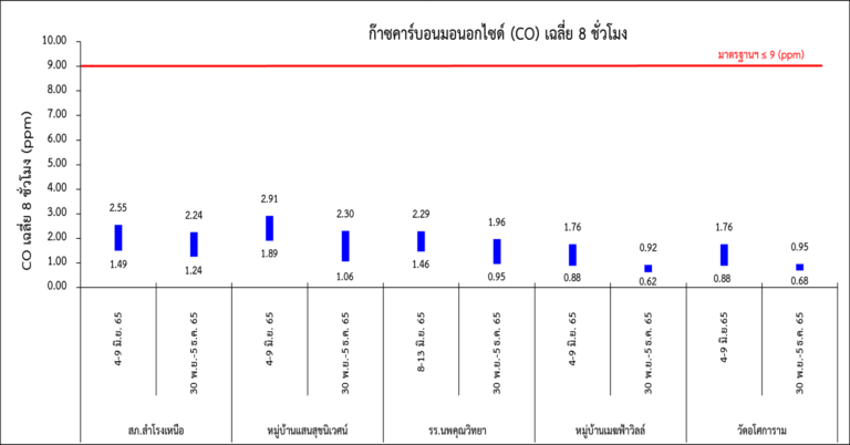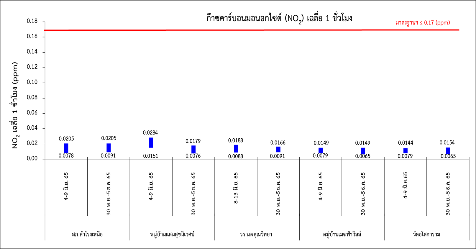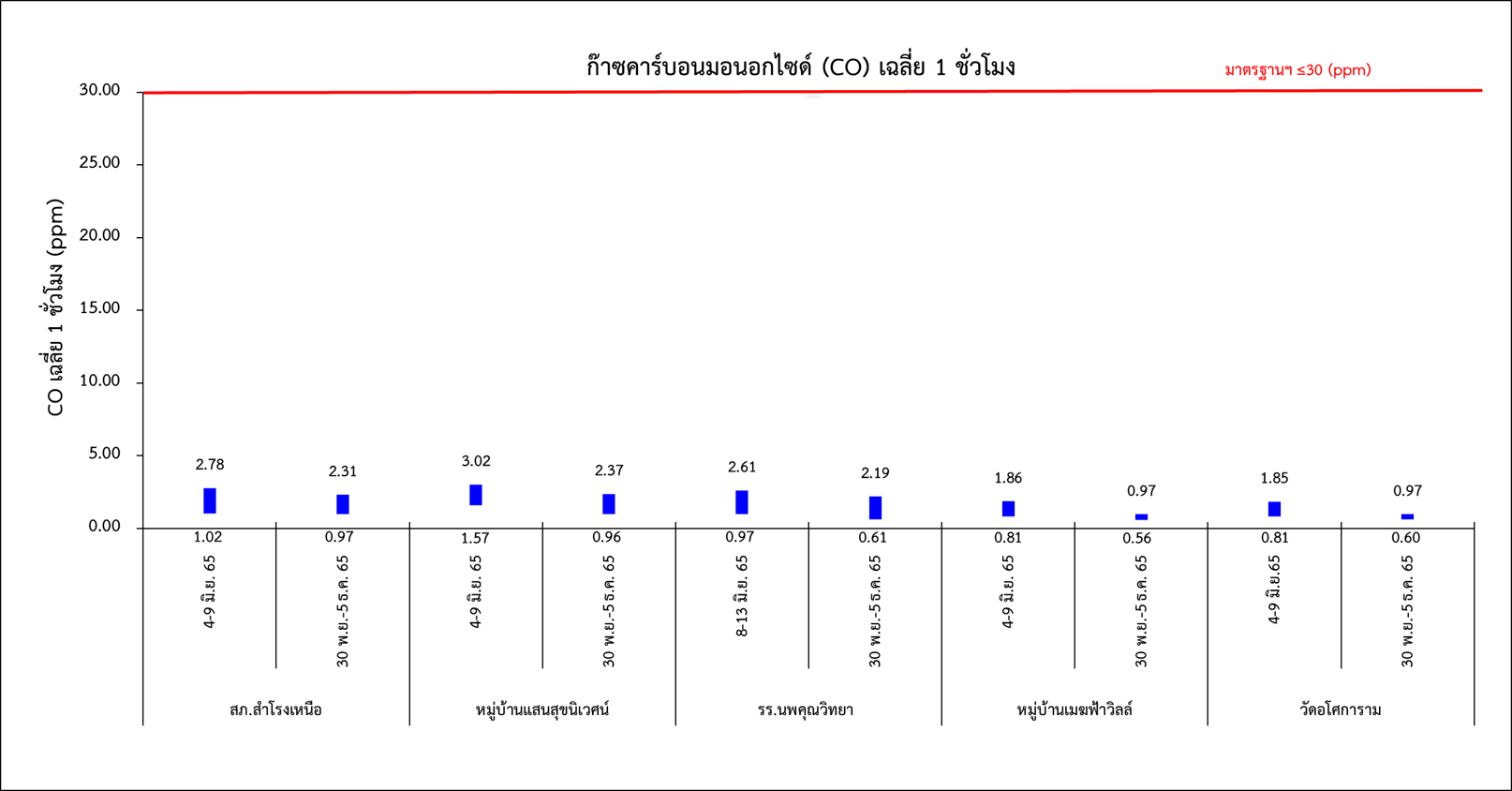 ผลการติดตามตรวจสอบคุณภาพอากาศในบรรยากาศ ได้แก่ ฝุ่นละอองขนาดไม่เกิน 10 ไมครอน ฝุ่นละอองรวม ก๊าซคาร์บอนมอนอกไซด์ ก๊าซไนโตรเจนไดออกไซด์ ปี พ.ศ. 2565 พบว่า ดัชนีคุณภาพอากาศทั้งหมด มีค่าอยู่ในมาตรฐานตามประกาศคณะกรรมการสิ่งแวดล้อมแห่งชาติ ฉบับที่ 10 (พ.ศ. 2538) เรื่อง กำหนดมาตรฐานคุณภาพอากาศในบรรยากาศทั่วไป มาตรฐานตามประกาศคณะกรรมการสิ่งแวดล้อมแห่งชาติ ฉบับที่ 24 (พ.ศ. 2547) เรื่อง กำหนดมาตรฐานคุณภาพอากาศในบรรยากาศทั่วไป และมาตรฐานตามประกาศคณะกรรมการสิ่งแวดล้อมแห่งชาติ ฉบับที่ 33 (พ.ศ. 2552) เรื่อง กำหนดมาตรฐานค่าก๊าซไนโตรเจนไดออกไซด์ในบรรยากาศโดยทั่วไป