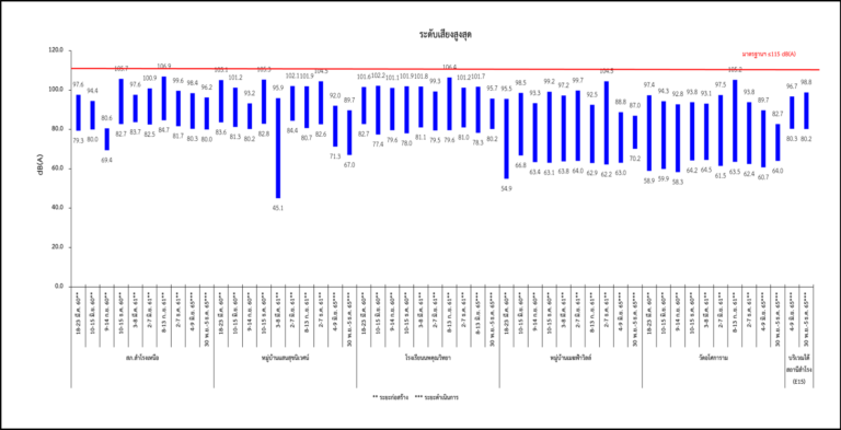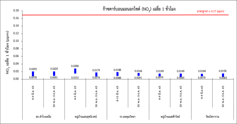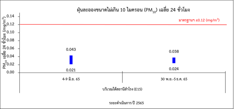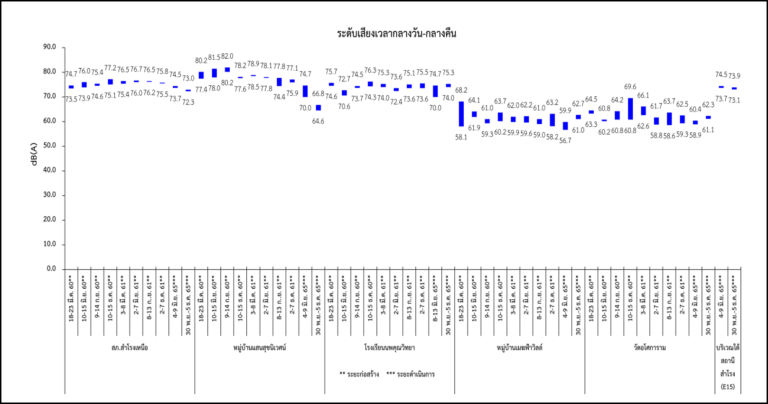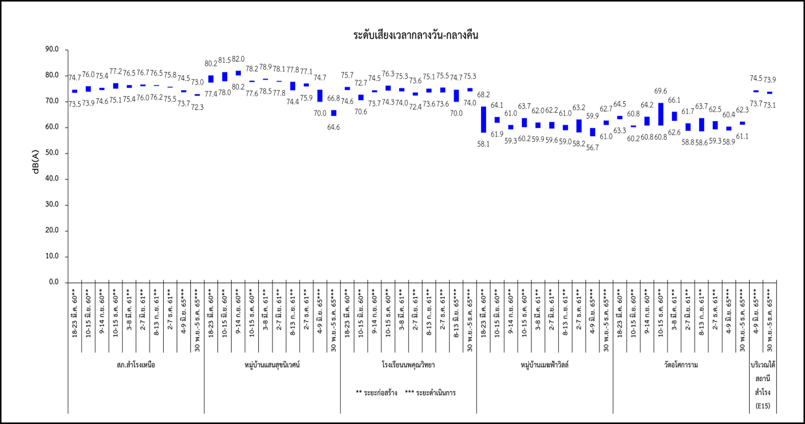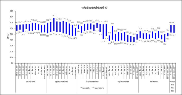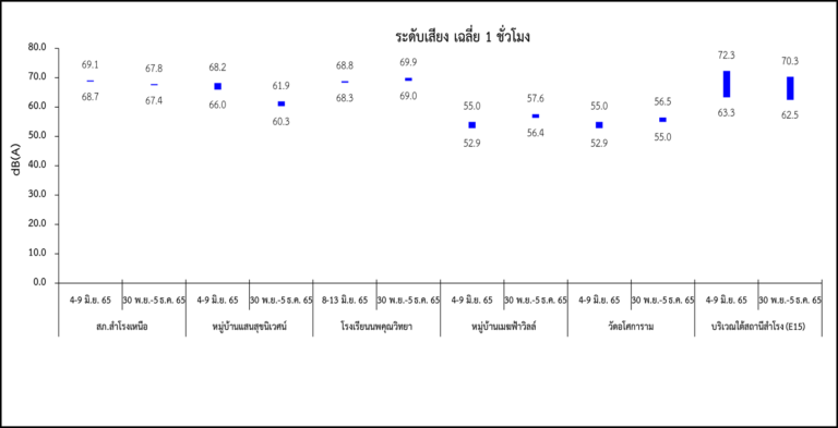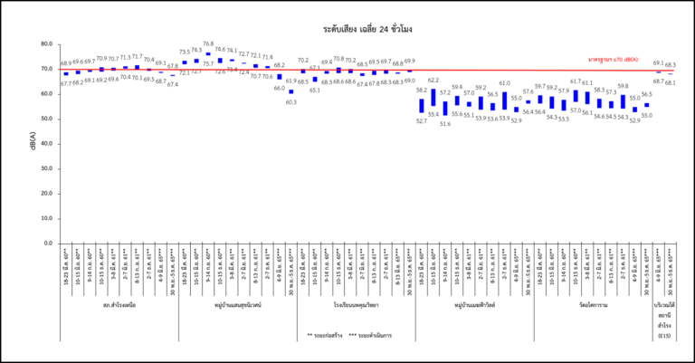 ผลการติดตามตรวจสอบระดับเสียงทั่วไป ได้แก่ ระดับเสียงเฉลี่ย 24 ชั่วโมง ระดับเสียงเปอร์เซ็นไทล์ที่ 90 ระดับเสียงเฉลี่ยกลางวัน-กลางคืน และระดับเสียงสูงสุด ระหว่างปี พ.ศ. 2560-2565 และระดับเสียงเฉลี่ย 1 ชั่วโมง ปี พ.ศ. 2565 พบว่า ระดับเสียงเฉลี่ย 24 ชั่วโมง ส่วนใหญ่มีค่าอยู่ในเกณฑ์มาตรฐาน ตามประกาศคณะกรรมการสิ่งแวดล้อมแห่งชาติ ฉบับที่ 15 (พ.ศ. 2540) เรื่อง กำหนดมาตรฐานระดับเสียงโดยทั่วไป ลงวันที่ 12 มีนาคม พ.ศ. 2540 ประกาศในราชกิจจานุเบกษา เล่ม 114 ตอนที่ 27 ง วันที่ 3 เมษายน พ.ศ. 2540 ที่กำหนดให้ระดับเสียงเฉลี่ย 24 ชั่วโมง มีค่าได้ไม่เกิน 70 เดซิเบลเอ และระดับเสียงสูงสุดมีค่าอยู่ในมาตรฐานระดับเสียงโดยทั่วไป ตามประกาศคณะกรรมการสิ่งแวดล้อมแห่งชาติ ฉบับที่ 15 (พ.ศ. 2540) ที่กำหนดให้ระดับเสียงสูงสุด มีค่าได้ไม่เกิน 115 เดซิเบลเอ สำหรับระดับเสียงเฉลี่ย 1 ชั่วโมง ระดับเสียงเปอร์เซ็นไทล์ที่ 90 และระดับเสียงเฉลี่ยกลางวัน-กลางคืน ยังไม่มีมาตรฐานกำหนด