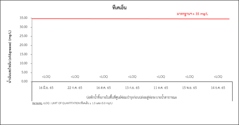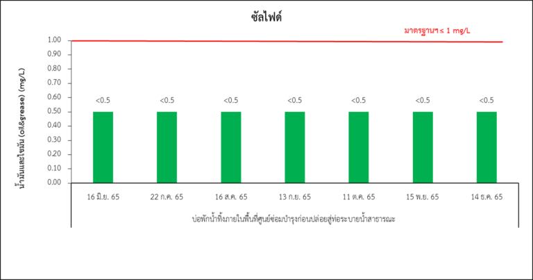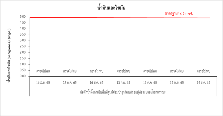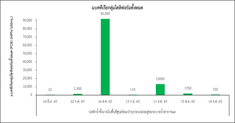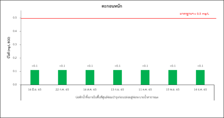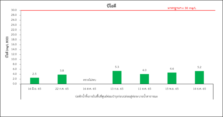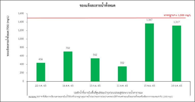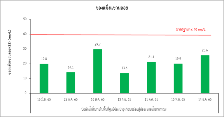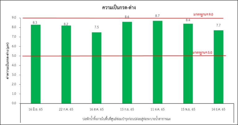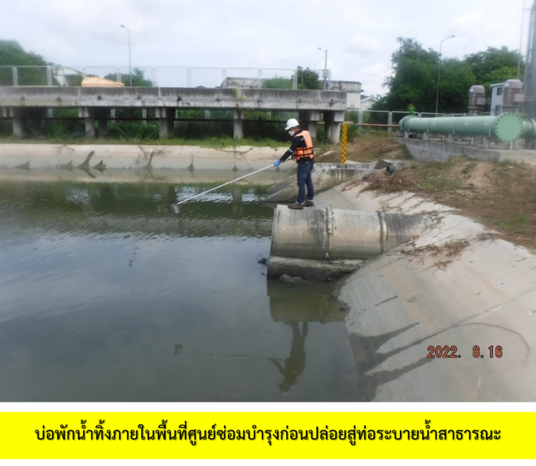 ผลการติดตามตรวจสอบคุณภาพน้ำทิ้ง ได้แก่ อุณหภูมิ ความเป็นกรด-ด่าง บีโอดี ซัลไฟด์ ทีเคเอ็น ปริมาณสารแขวนลอย ปริมาณของแข็งละลายทั้งหมด ปริมาณตะกอนหนัก น้ำมันและไขมัน และปริมาณโคลิฟอร์มแบคทีเรียทั้งหมด ปี พ.ศ. 2565 พบว่า ดัชนีทั้งหมดมีค่าอยู่ในมาตรฐานตามประกาศกระทรวงทรัพยากรธรรมชาติและสิ่งแวดล้อม เรื่อง กำหนดมาตรฐานควบคุมการระบายน้ำทิ้งจากอาคารบางประเภทและบางขนาด ประกาศในราชกิจจานุเบกษา เล่ม 122 ตอนที่ 125 ง วันที่ 29 ธันวาคม พ.ศ. 2548 (เกณฑ์กำหนดสูงสุดตามประเภทมาตรฐานควบคุมการระบายน้ำทิ้งจากอาคารประเภท ข)