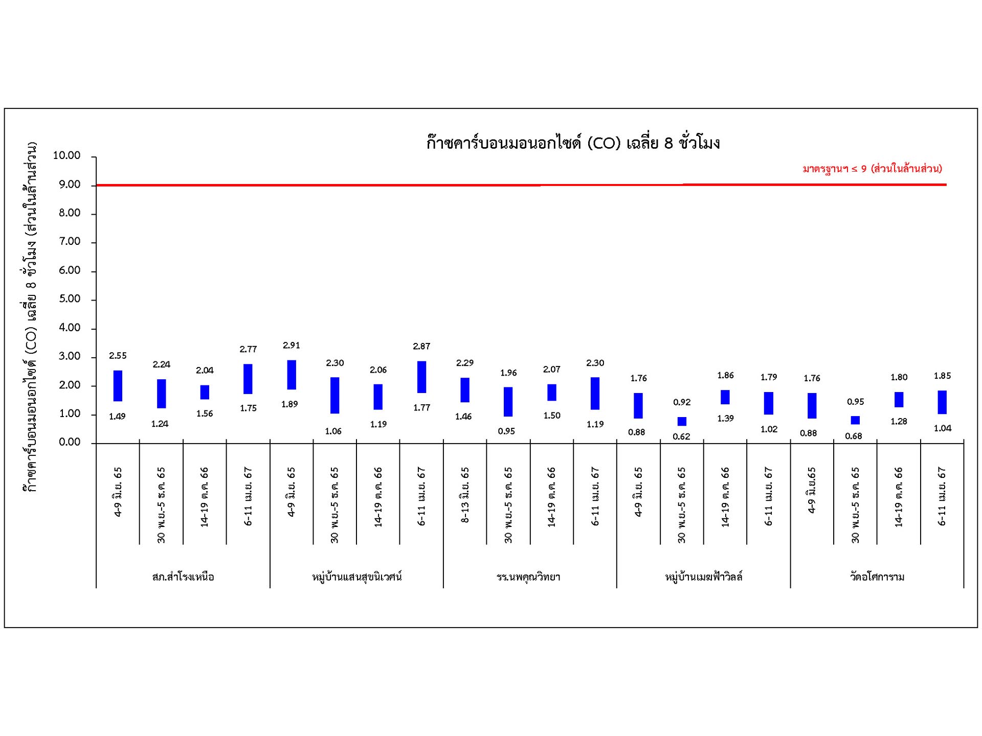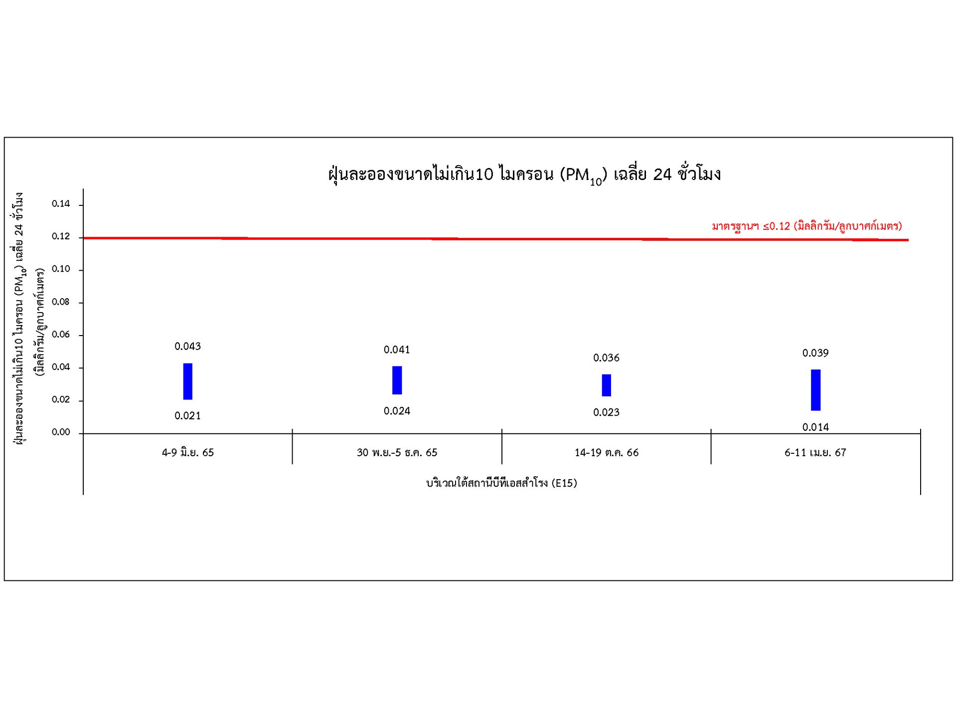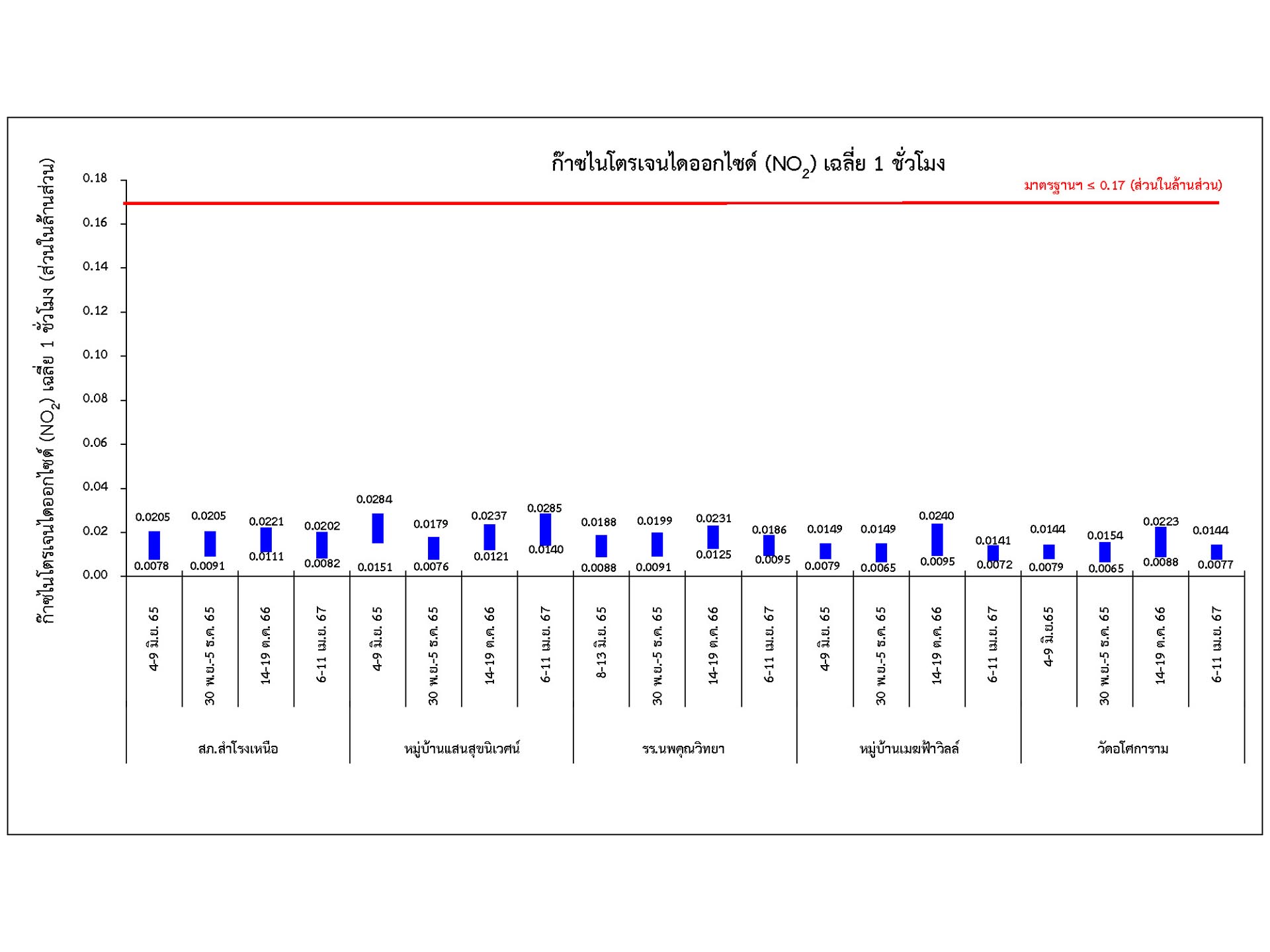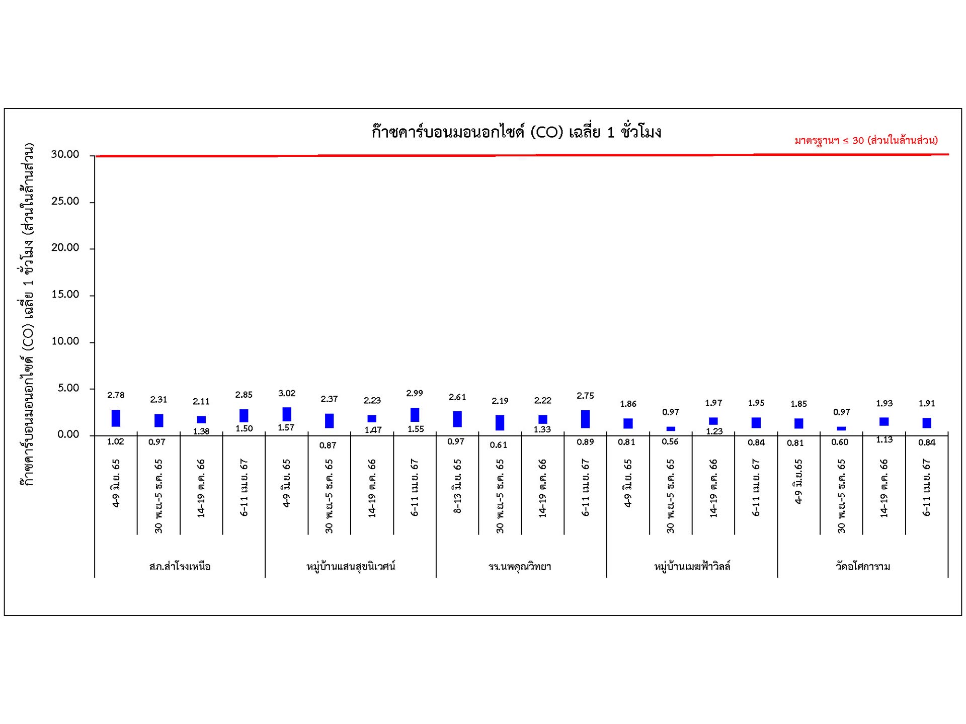 ผลการติดตามตรวจสอบคุณภาพอากาศในบรรยากาศ ได้แก่ ฝุ่นละอองขนาดไม่เกิน 10 ไมครอน ฝุ่นละอองรวม ก๊าซคาร์บอนมอนอกไซด์ ก๊าซไนโตรเจนไดออกไซด์ ในช่วงมกราคม-มิถุนายน พ.ศ. 2567 พบว่า ดัชนีคุณภาพอากาศทั้งหมด มีค่าอยู่ในมาตรฐานตามประกาศคณะกรรมการสิ่งแวดล้อมแห่งชาติ ฉบับที่ 10 (พ.ศ. 2538) เรื่อง กำหนดมาตรฐานคุณภาพอากาศในบรรยากาศทั่วไป มาตรฐานตามประกาศคณะกรรมการสิ่งแวดล้อมแห่งชาติ ฉบับที่ 24 (พ.ศ. 2547) เรื่อง กำหนดมาตรฐานคุณภาพอากาศในบรรยากาศทั่วไป และมาตรฐานตามประกาศคณะกรรมการสิ่งแวดล้อมแห่งชาติ ฉบับที่ 33 (พ.ศ. 2552) เรื่อง กำหนดมาตรฐานค่าก๊าซไนโตรเจนไดออกไซด์ในบรรยากาศโดยทั่วไป