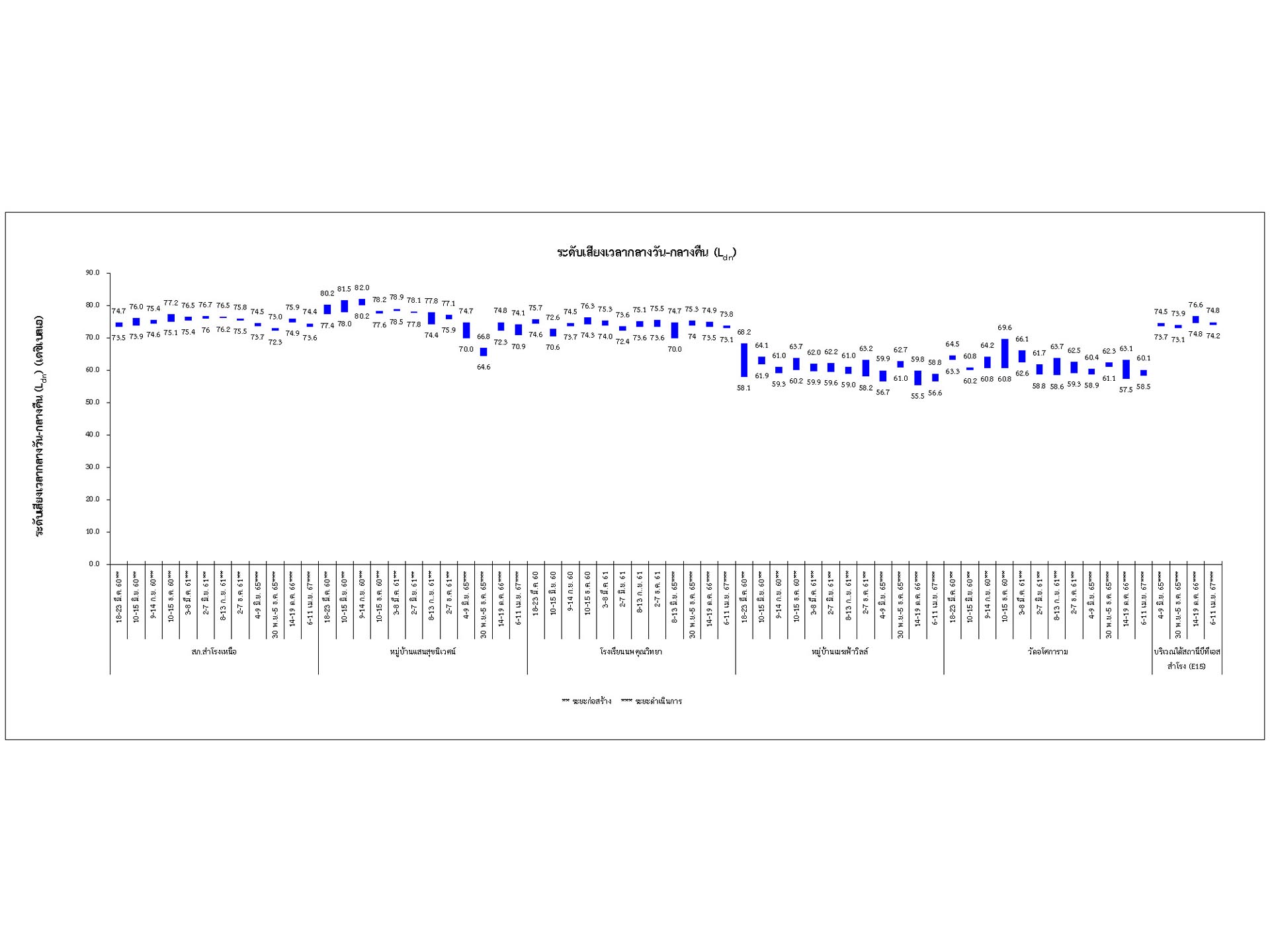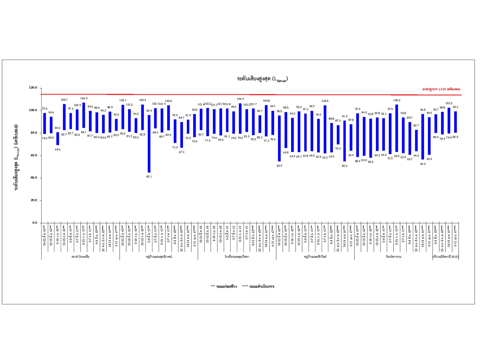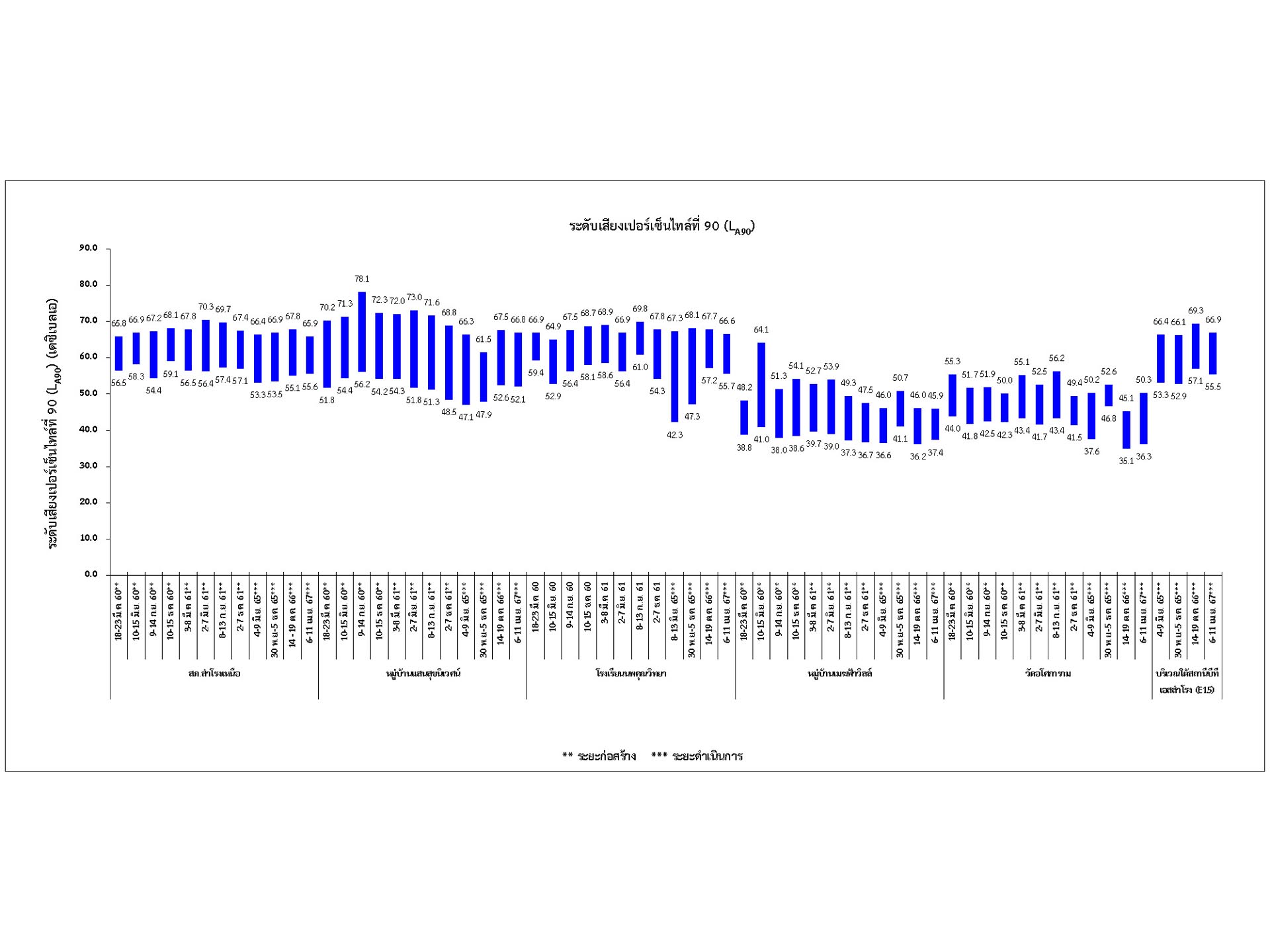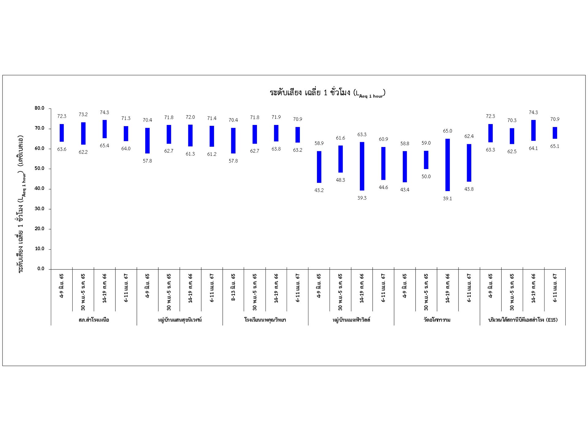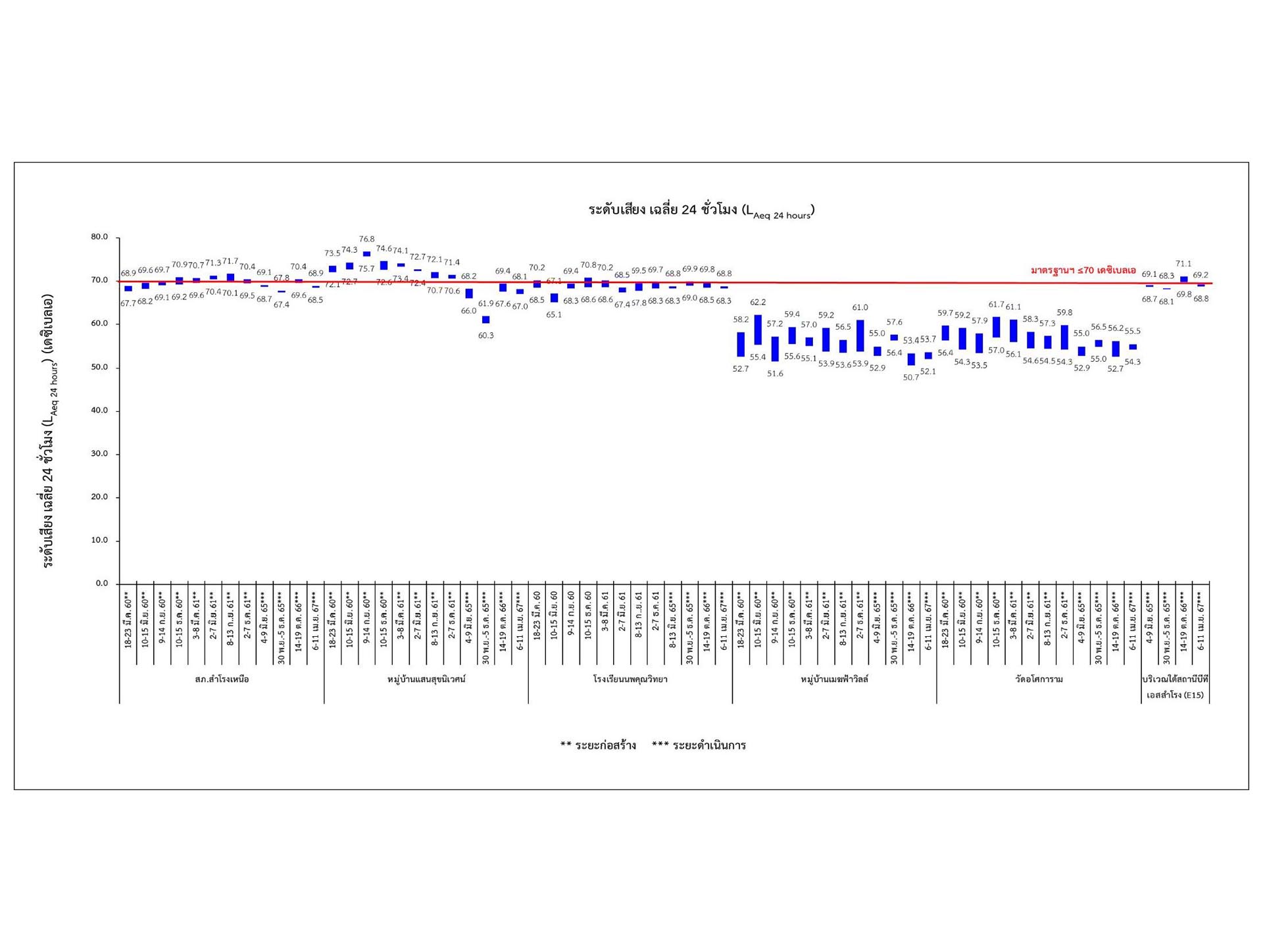 ผลการติดตามตรวจสอบระดับเสียงทั่วไป ได้แก่ ระดับเสียงเฉลี่ย 24 ชั่วโมง ระดับเสียงเปอร์เซ็นไทล์ที่ 90 ระดับเสียงเฉลี่ยกลางวัน-กลางคืน ระดับเสียงสูงสุด และระดับเสียงเฉลี่ย 1 ชั่วโมง พบว่า ระดับเสียงเฉลี่ย 24 ชั่วโมง มีค่าอยู่ในเกณฑ์มาตรฐาน ตามประกาศคณะกรรมการสิ่งแวดล้อมแห่งชาติ ฉบับที่ 15 (พ.ศ. 2540) เรื่อง กำหนดมาตรฐานระดับเสียงโดยทั่วไป ลงวันที่ 12 มีนาคม พ.ศ. 2540 ประกาศในราชกิจจานุเบกษา เล่ม 114 ตอนที่ 27 ง วันที่ 3 เมษายน พ.ศ. 2540 ที่กำหนดให้ระดับเสียงเฉลี่ย 24 ชั่วโมง มีค่าได้ไม่เกิน 70 เดซิเบลเอ และระดับเสียงสูงสุดมีค่าอยู่ในมาตรฐานระดับเสียงโดยทั่วไป ตามประกาศคณะกรรมการสิ่งแวดล้อมแห่งชาติ ฉบับที่ 15 (พ.ศ. 2540) ที่กำหนดให้ระดับเสียงสูงสุด มีค่าได้ไม่เกิน 115 เดซิเบลเอ สำหรับระดับเสียงเฉลี่ย 1 ชั่วโมง ระดับเสียงเปอร์เซ็นไทล์ที่ 90 และระดับเสียงเฉลี่ยกลางวัน-กลางคืน ยังไม่มีมาตรฐานกำหนด