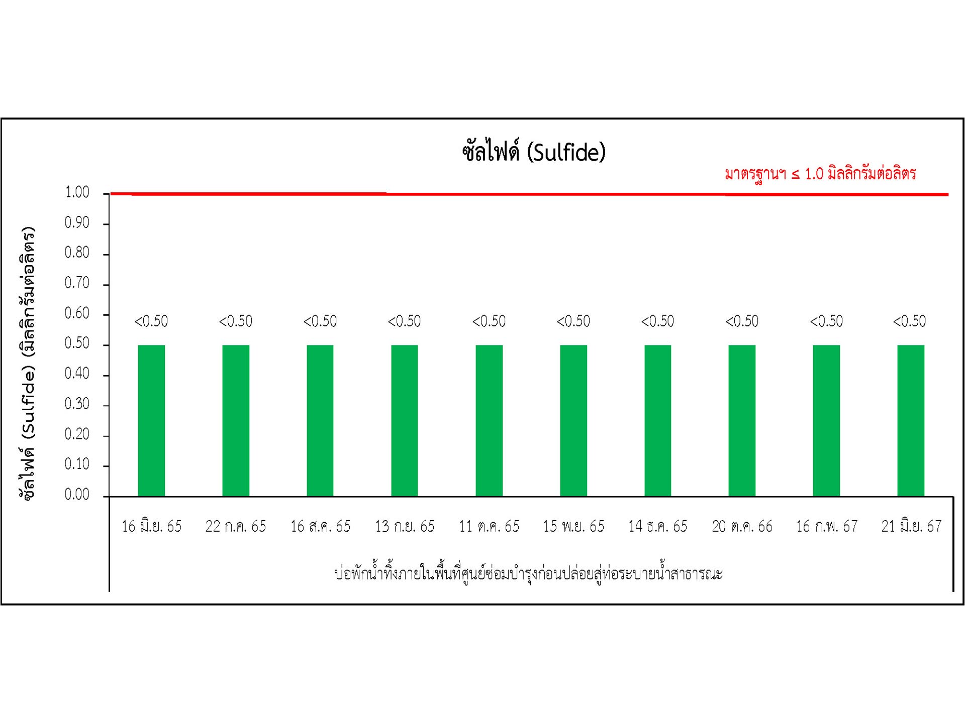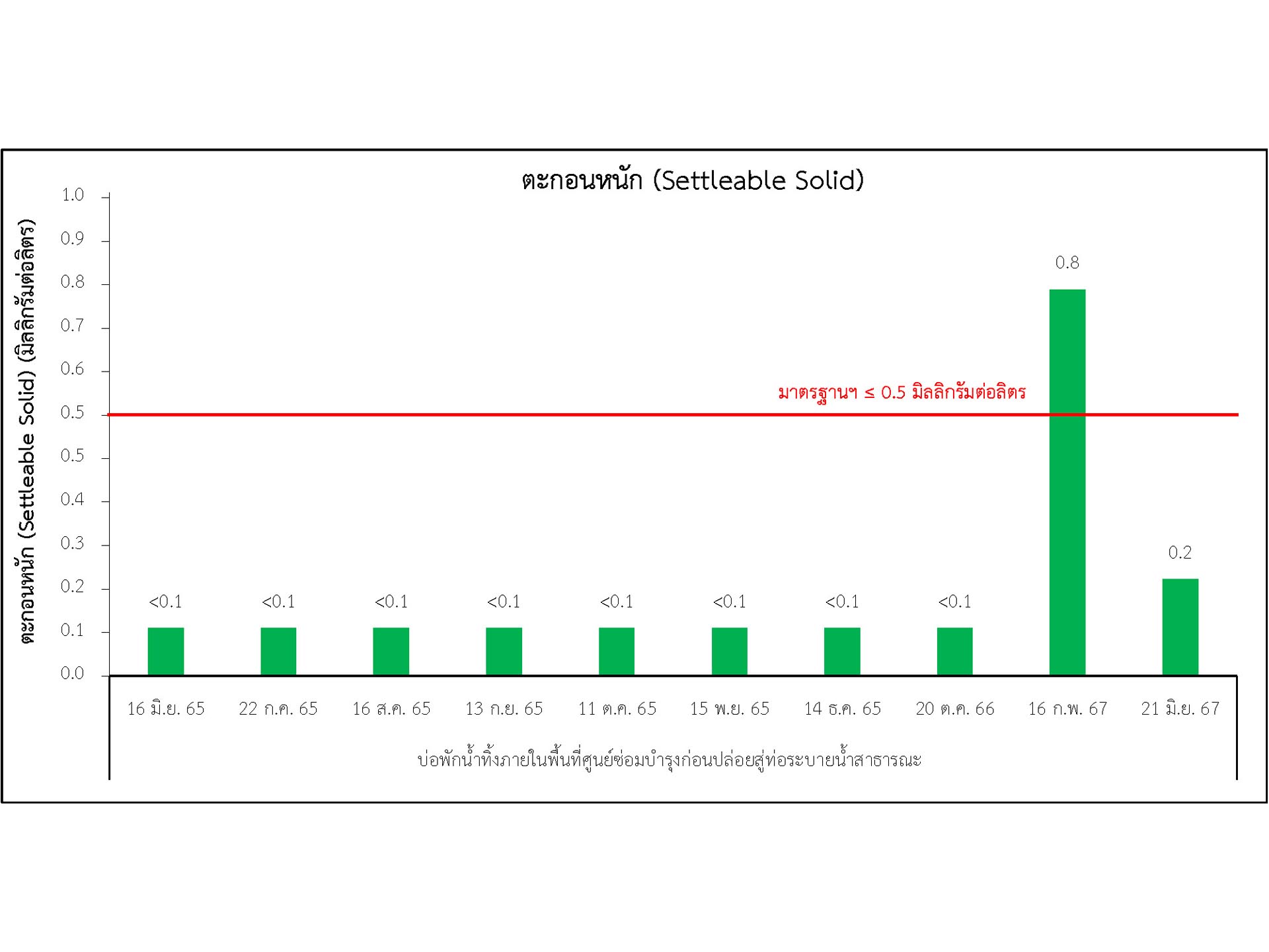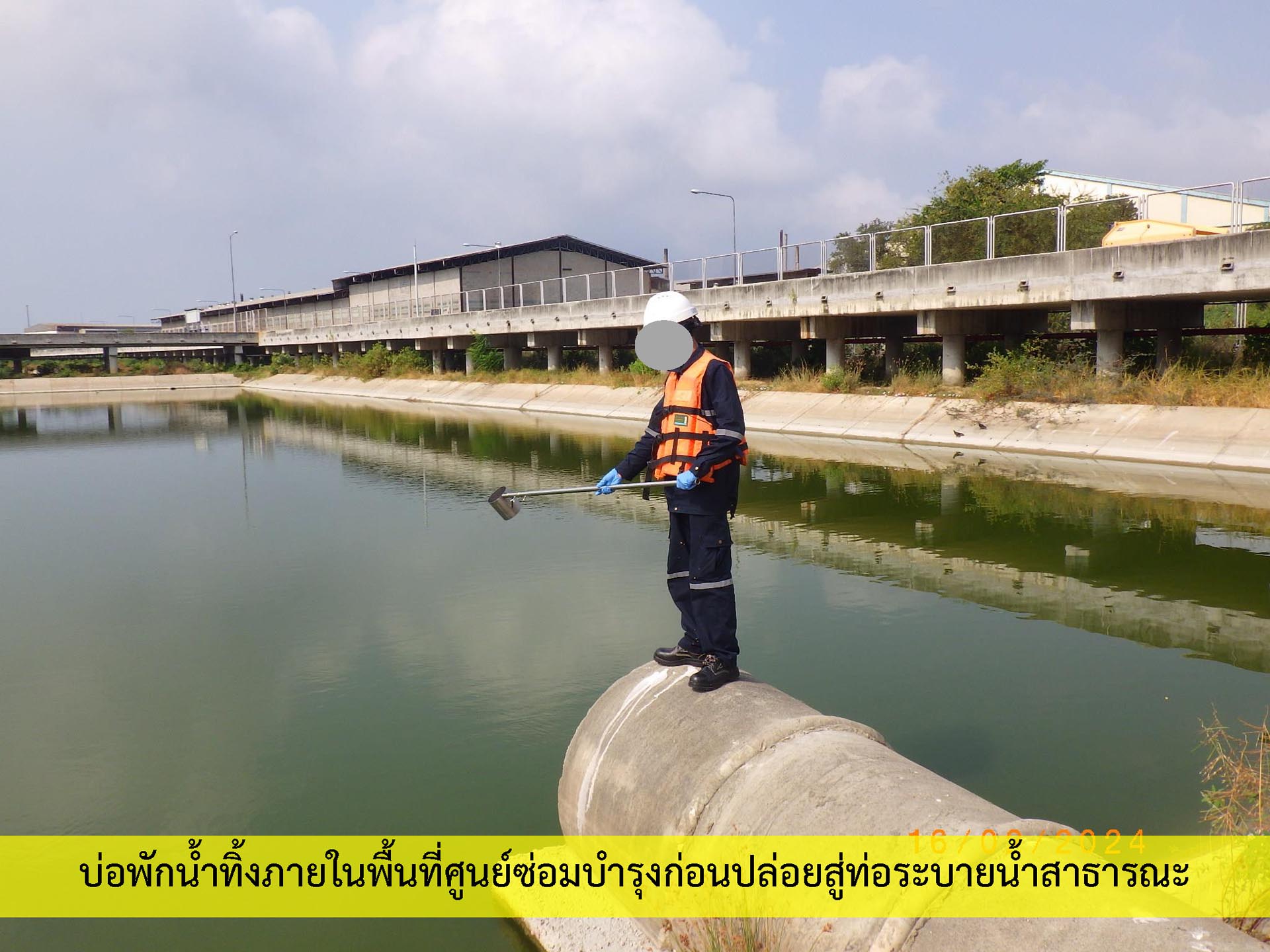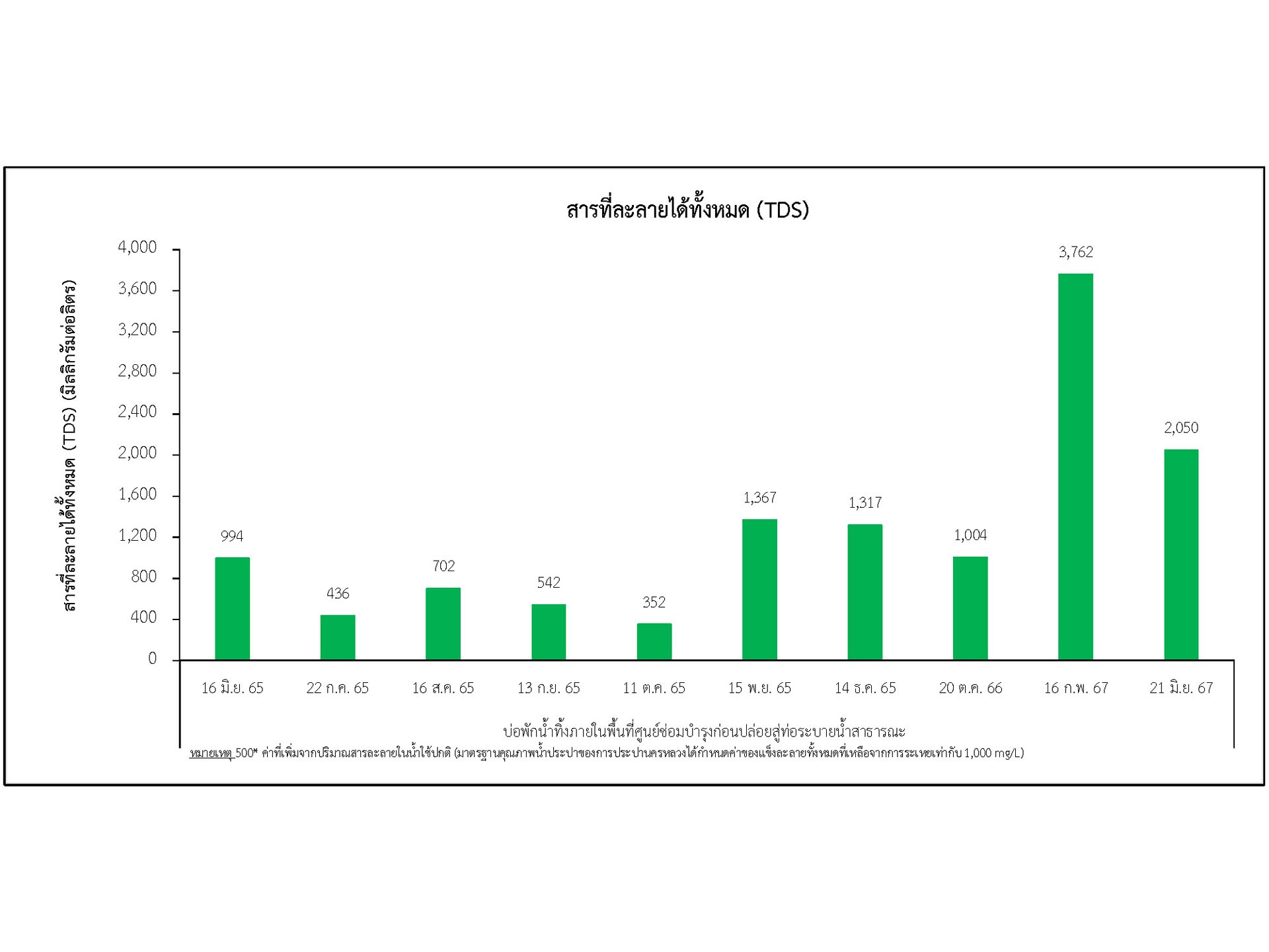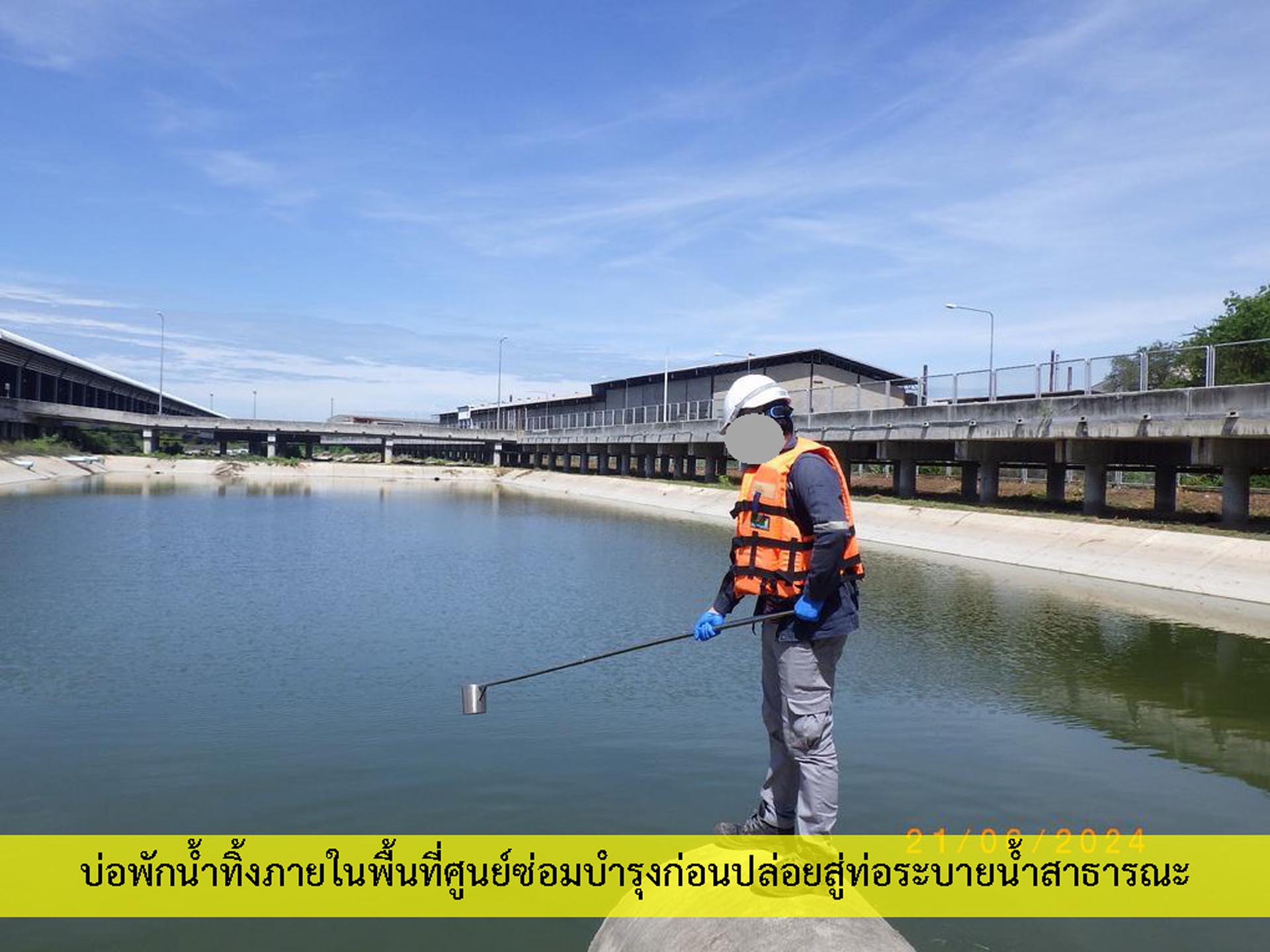 ผลการติดตามตรวจสอบคุณภาพน้ำทิ้ง ได้แก่ อุณหภูมิ ความเป็นกรด-ด่าง บีโอดี ซัลไฟด์ ทีเคเอ็น ปริมาณสารแขวนลอย ปริมาณของแข็งละลายทั้งหมด ปริมาณตะกอนหนัก น้ำมันและไขมัน และปริมาณโคลิฟอร์มแบคทีเรียทั้งหมด พบว่า ค่าดัชนีส่วนใหญ่มีค่าอยู่ในเกณฑ์มาตรฐานที่กำหนด ยกเว้น สารแขวนลอย (SS) สารที่ละลายได้ทั้งหมด (TDS) และตะกอนหนัก (Settleable Solids) ในวันที่ 16 กุมภาพันธ์ พ.ศ. 2567 และสารที่ละลายได้ทั้งหมด (TDS) ในวันที่ 21 มิถุนายน พ.ศ. 2567 ที่มีค่าไม่อยู่ในเกณฑ์มาตรฐานกำหนด เนื่องจากบ่อพักน้ำทิ้งมีปริมาณน้ำค่อนข้างน้อย สภาพน้ำในบ่อมีลักษณะเป็นน้ำนิ่ง ซึ่งสภาพแวดล้อมดังกล่าวมีความเหมาะสมที่เอื้อต่อการเจริญเติบโตของแพลงก์ตอนบางกลุ่ม และวัชพืชภายในบ่อพักน้ำทิ้ง อีกทั้งการสะสมของปริมาณอินทรีย์สารในบ่อพักน้ำทิ้งมีปริมาณมากขึ้นจึงส่งผลให้บางดัชนีมีค่าไม่อยู่ในเกณฑ์มาตรฐานที่กำหนด โครงการควรพิจารณาปรับเพิ่มความถี่ในการตรวจสอบตะกอนในบ่อพักน้ำทิ้งและการทำความสะอาดบริเวณบ่อพักน้ำทิ้ง เพื่อลดการสะสมของปริมาณอินทรีย์สารในบ่อพักน้ำทิ้งก่อนปล่อยออกสู่แหล่งน้ำสาธารณะ ทั้งนี้ สำหรับปริมาณแบคทีเรียกลุ่มโคลิฟอร์มทั้งหมด (TCB) ยังไม่มีมาตรฐานกำหนด