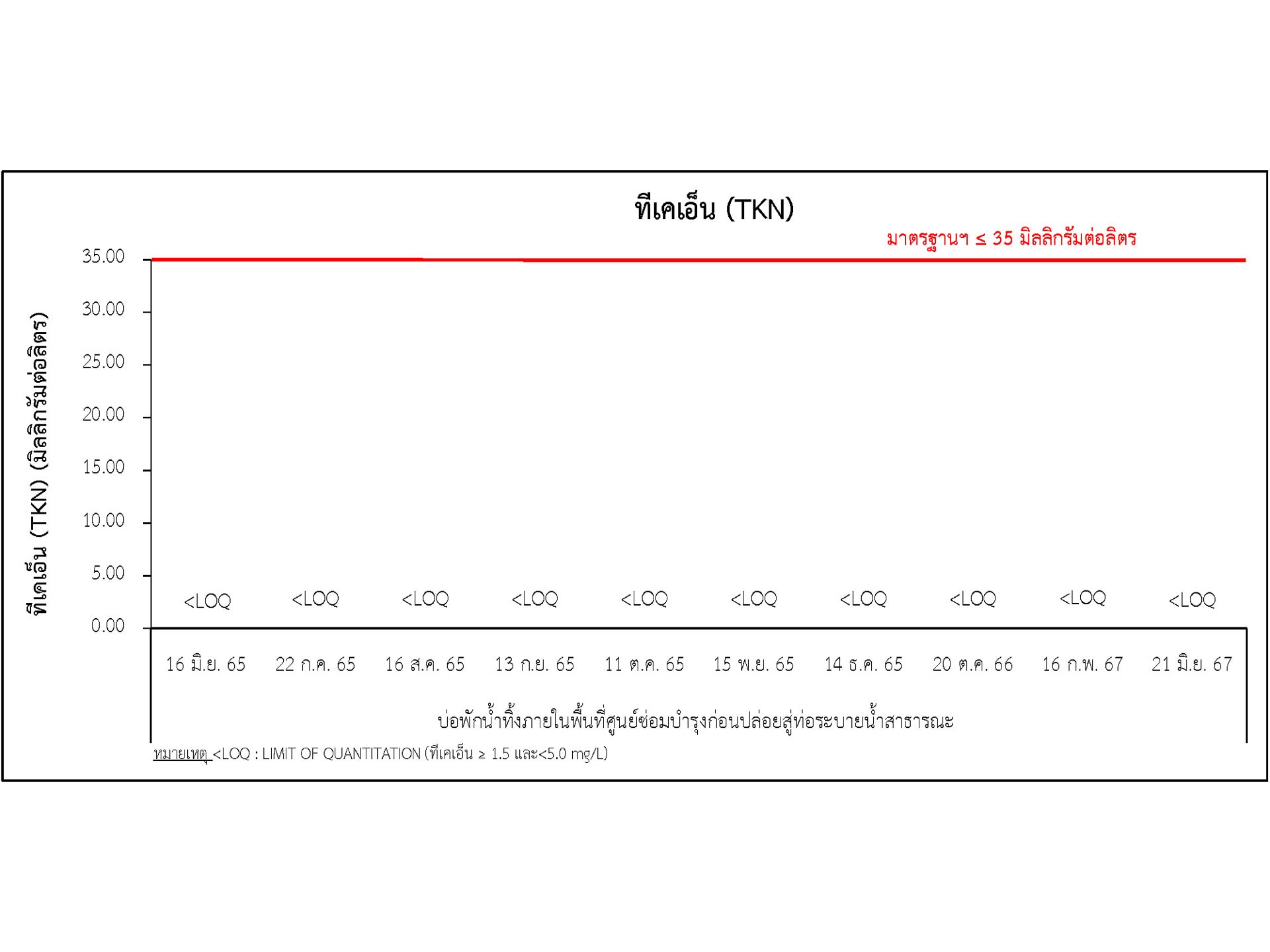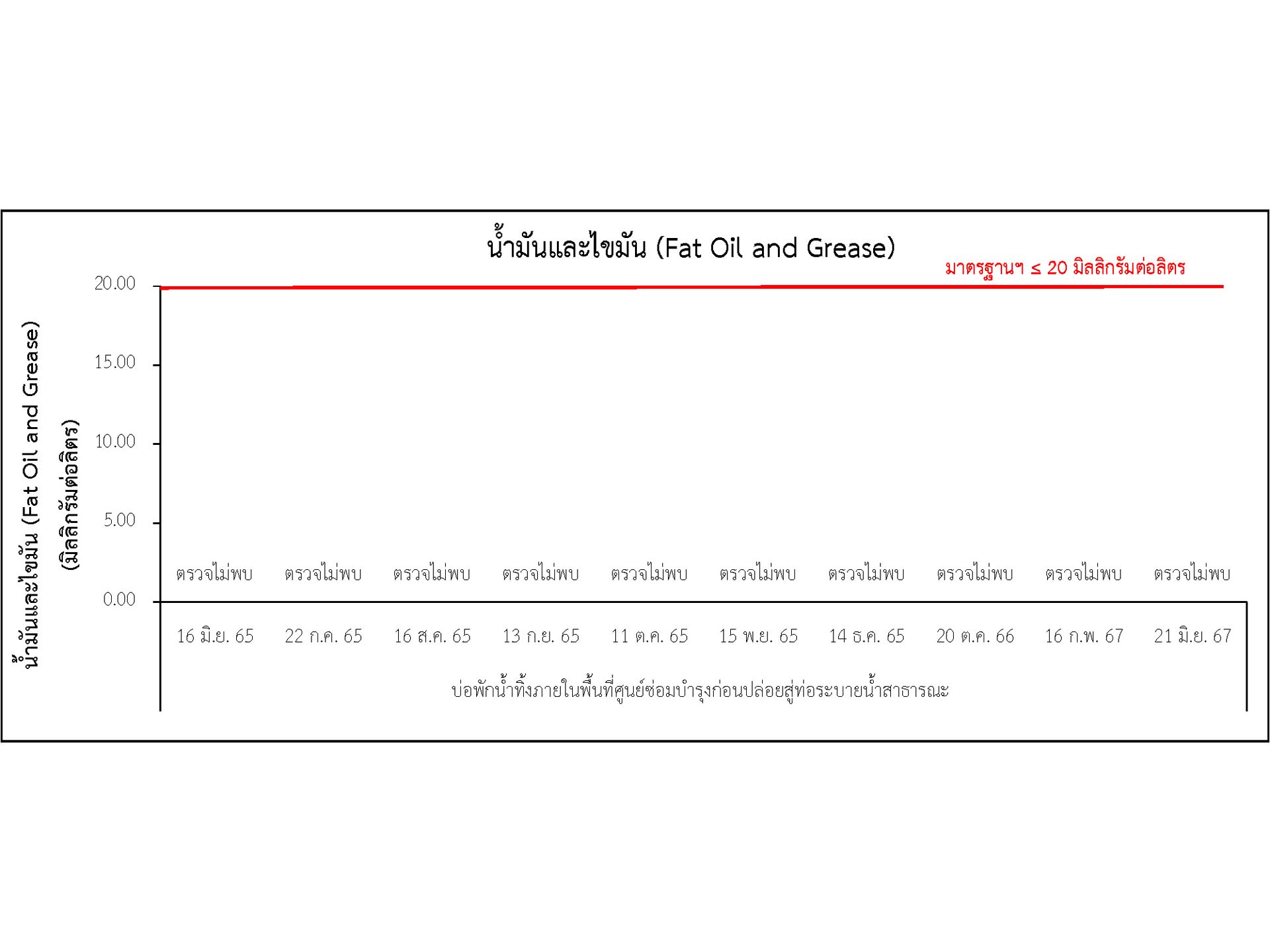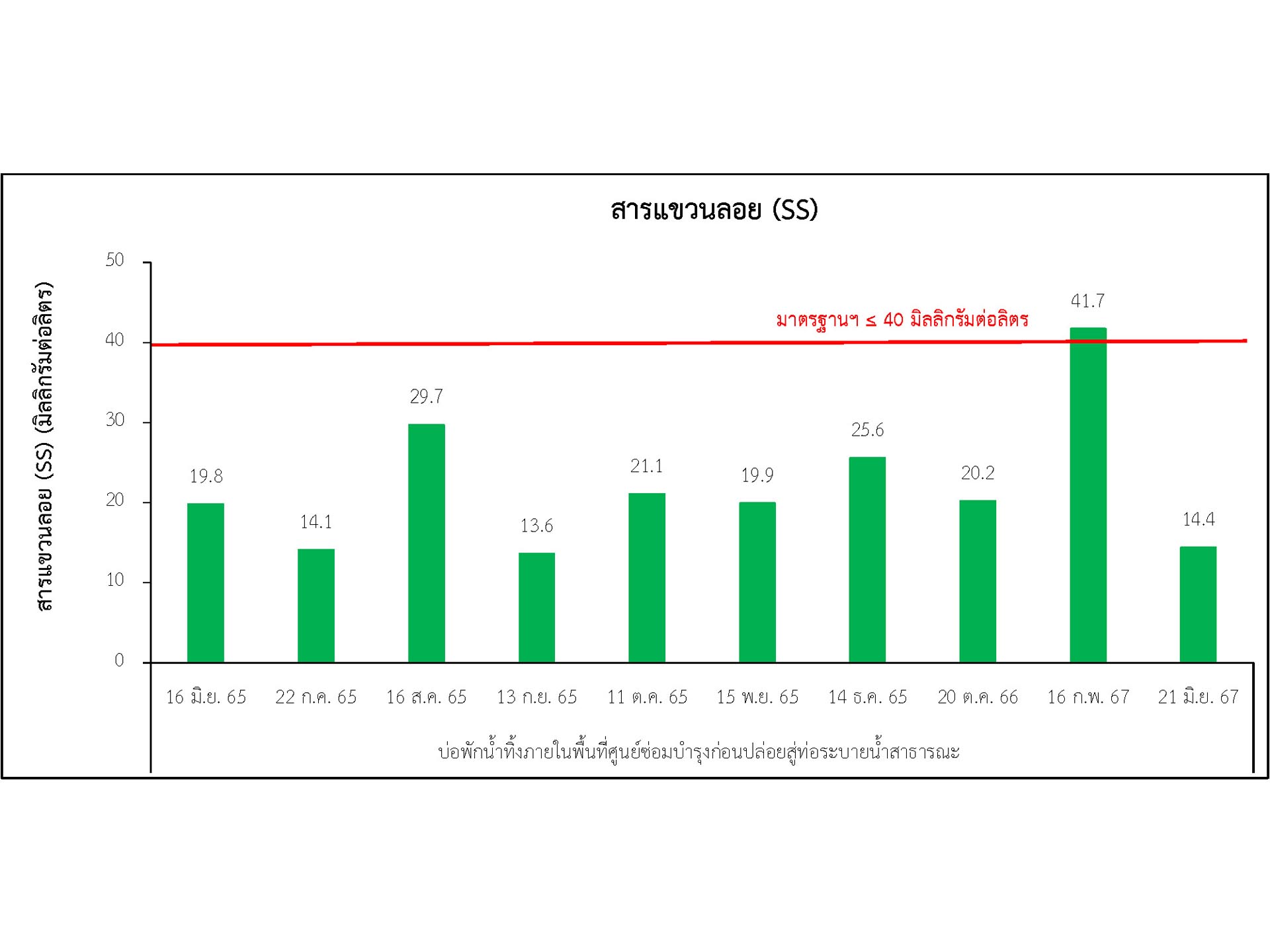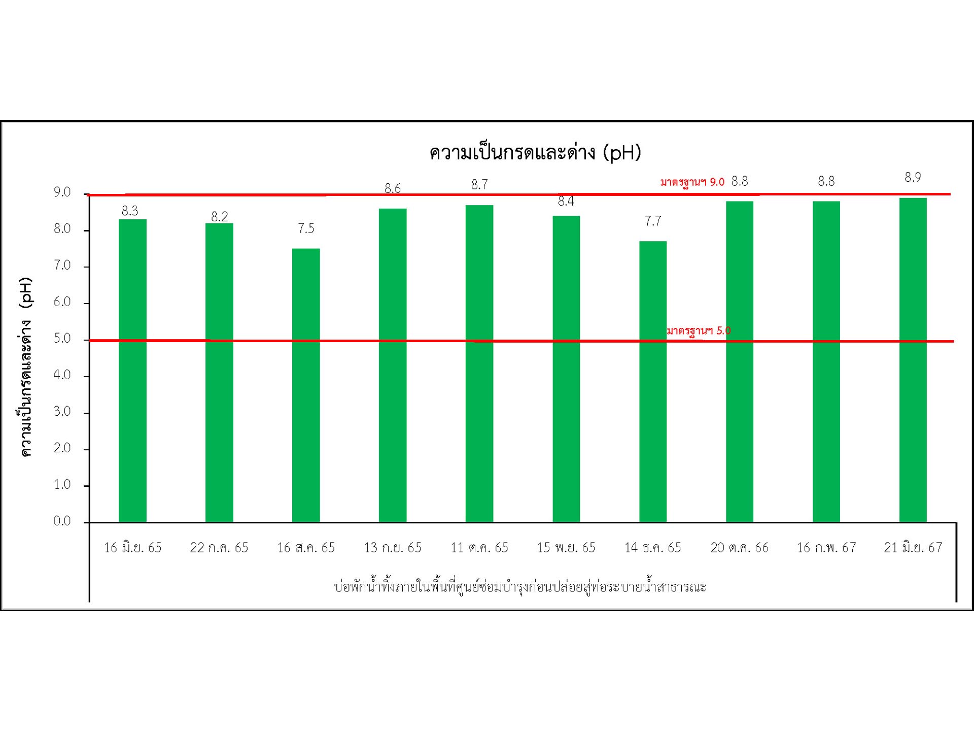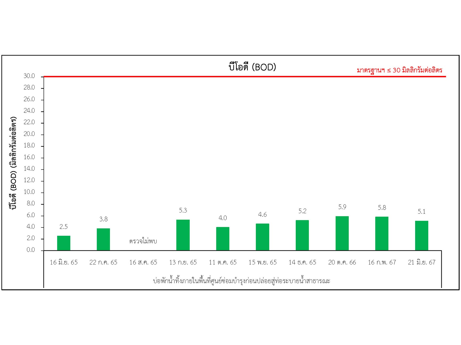 ผลการติดตามตรวจสอบคุณภาพน้ำทิ้ง ได้แก่ อุณหภูมิ ความเป็นกรด-ด่าง บีโอดี ซัลไฟด์ ทีเคเอ็น ปริมาณสารแขวนลอย ปริมาณของแข็งละลายทั้งหมด ปริมาณตะกอนหนัก น้ำมันและไขมัน และปริมาณโคลิฟอร์มแบคทีเรียทั้งหมด พบว่า ค่าดัชนีส่วนใหญ่มีค่าอยู่ในเกณฑ์มาตรฐานที่กำหนด ยกเว้น สารแขวนลอย (SS) สารที่ละลายได้ทั้งหมด (TDS) และตะกอนหนัก (Settleable Solids) ในวันที่ 16 กุมภาพันธ์ พ.ศ. 2567 และสารที่ละลายได้ทั้งหมด (TDS) ในวันที่ 21 มิถุนายน พ.ศ. 2567 ที่มีค่าไม่อยู่ในเกณฑ์มาตรฐานกำหนด เนื่องจากบ่อพักน้ำทิ้งมีปริมาณน้ำค่อนข้างน้อย สภาพน้ำในบ่อมีลักษณะเป็นน้ำนิ่ง ซึ่งสภาพแวดล้อมดังกล่าวมีความเหมาะสมที่เอื้อต่อการเจริญเติบโตของแพลงก์ตอนบางกลุ่ม และวัชพืชภายในบ่อพักน้ำทิ้ง อีกทั้งการสะสมของปริมาณอินทรีย์สารในบ่อพักน้ำทิ้งมีปริมาณมากขึ้นจึงส่งผลให้บางดัชนีมีค่าไม่อยู่ในเกณฑ์มาตรฐานที่กำหนด โครงการควรพิจารณาปรับเพิ่มความถี่ในการตรวจสอบตะกอนในบ่อพักน้ำทิ้งและการทำความสะอาดบริเวณบ่อพักน้ำทิ้ง เพื่อลดการสะสมของปริมาณอินทรีย์สารในบ่อพักน้ำทิ้งก่อนปล่อยออกสู่แหล่งน้ำสาธารณะ ทั้งนี้ สำหรับปริมาณแบคทีเรียกลุ่มโคลิฟอร์มทั้งหมด (TCB) ยังไม่มีมาตรฐานกำหนด