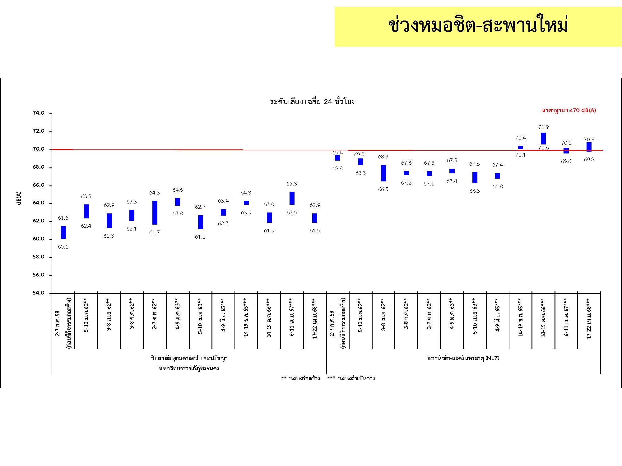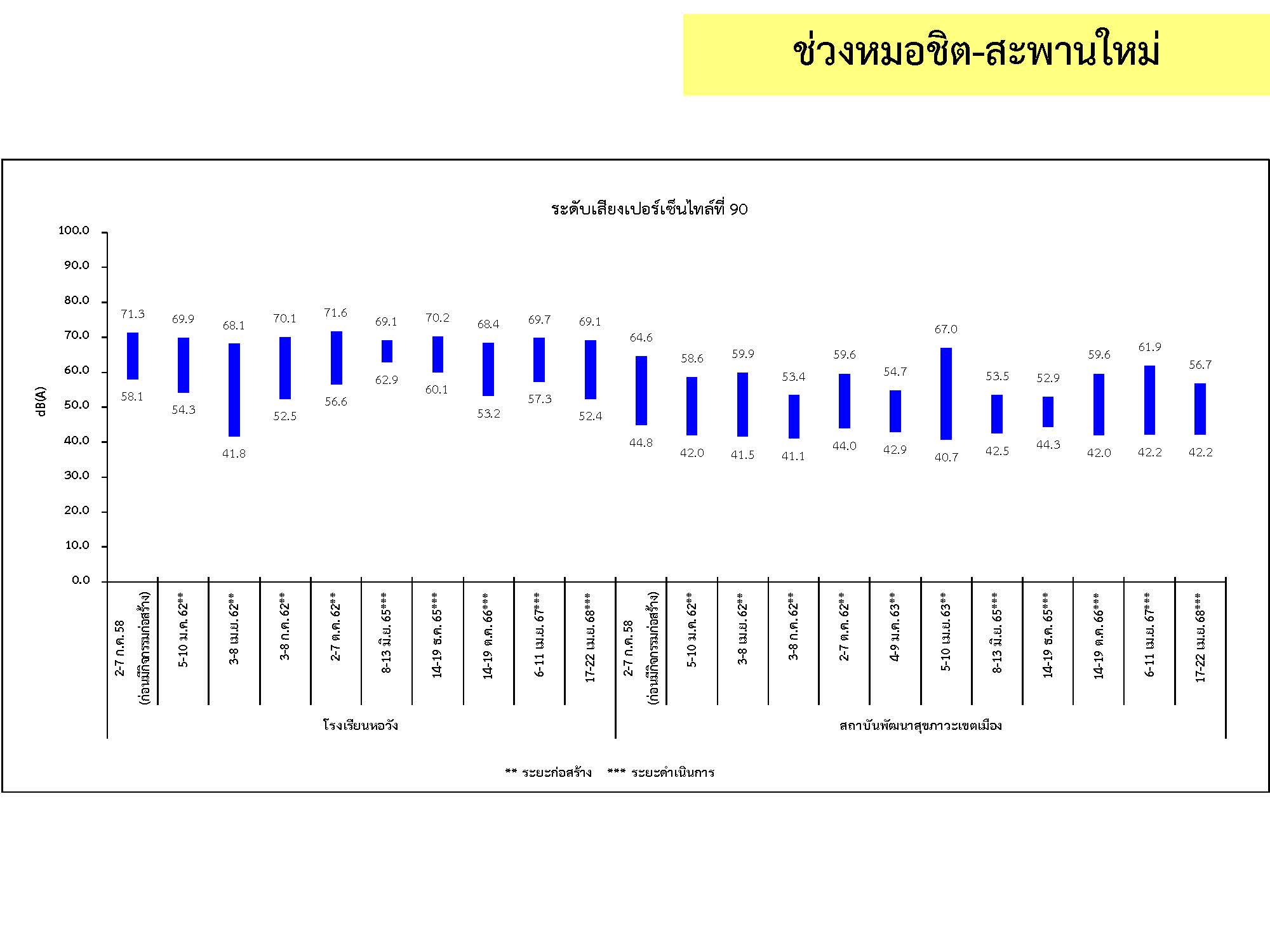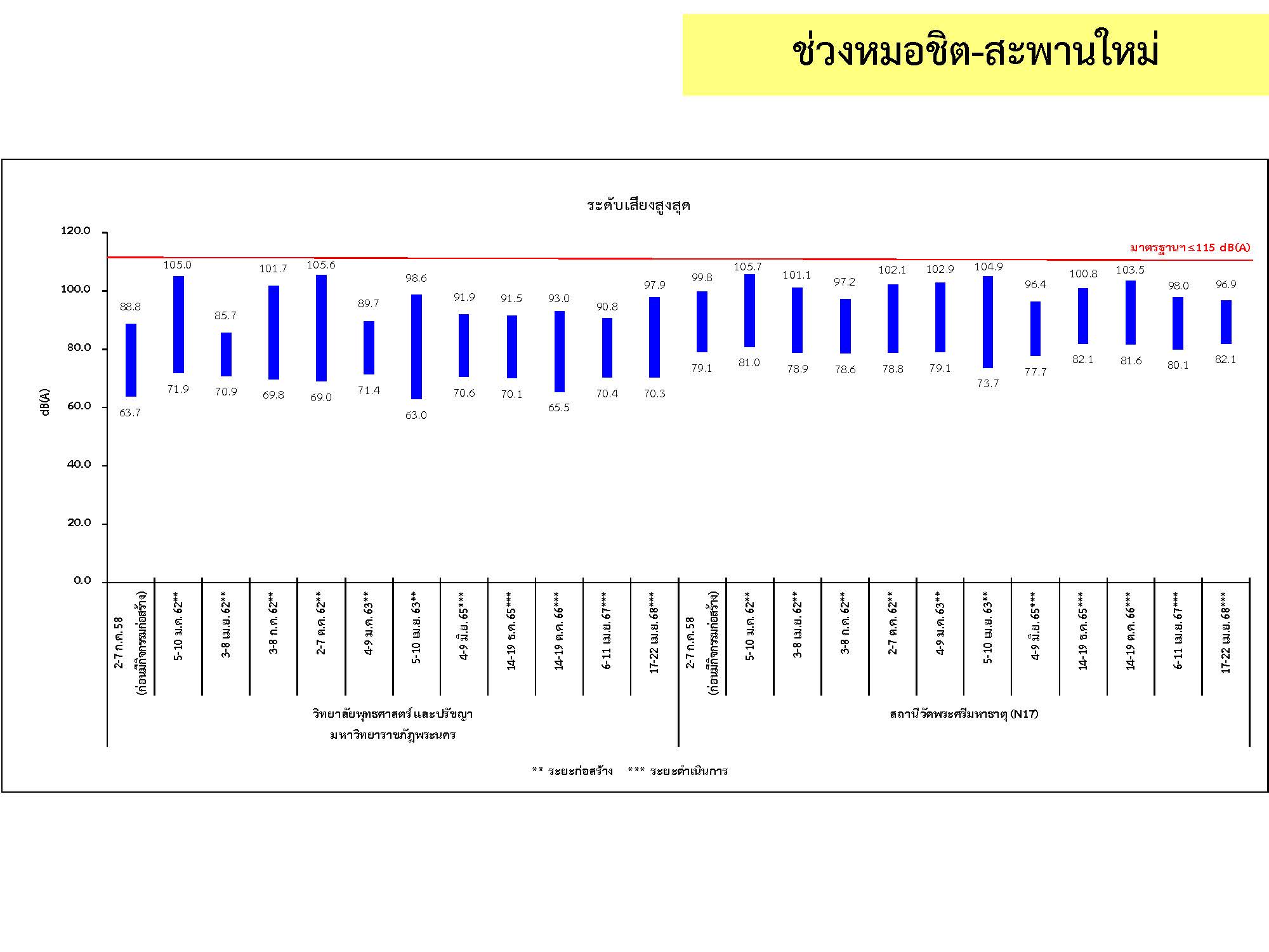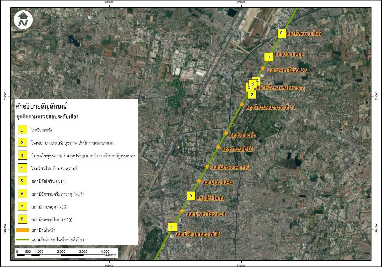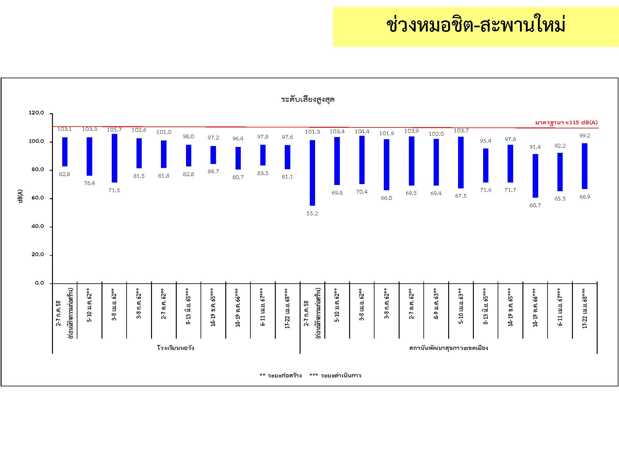 ผลการติดตามตรวจสอบระดับเสียงทั่วไป ได้แก่ ระดับเสียงเฉลี่ย 1 ชั่วโมง ระดับเสียงเฉลี่ย 24 ชั่วโมง ระดับเสียงเปอร์เซ็นไทล์ที่ 90 ระดับเสียงเฉลี่ยกลางวัน-กลางคืน และระดับเสียง ในช่วงเดือนมกราคม-มิถุนายน พ.ศ. 2568 พบว่าโรงเรียนหอวัง สถานีวัดพระศรีมหาธาตุ (N17) สถานีรัชโยธิน (N11) และสถานีสายหยุด (N19) และสถานีสะพานใหม่ (N20) มีค่าไม่อยู่ในเกณฑ์มาตรฐานที่กำหนด เนื่องจากจุดติดตามตรวจสอบระดับเสียงตั้งอยู่ริมถนนพหลโยธิน ซึ่งมีปริมาณการจราจรหนาแน่นตลอดทั้งวัน โดยโครงการควรเพิ่มเติมการปลูกต้นไม้บริเวณริมทางเท้าเกาะกลางถนน และบริเวณเสาโครงสร้างของสถานีเพื่อช่วยดูดซับเสียงจากการจราจร ส่วนโรงเรียนไทยนิยมสงเคราะห์ เนื่องจากจุดติดตามตรวจสอบระดับเสียงตั้งอยู่ภายในบริเวณโรงเรียนไทยนิยมสังเคราะห์ ซึ่งอยู่ในช่วงที่มีกิจกรรมการปรับปรุงอาคารภายในโรงเรียน จึงทำให้ระดับเสียงเฉลี่ย 24 ชั่วโมงมีค่าเกินมาตรฐาน ขณะที่ระดับเสียงสูงสุด มีค่าอยู่ในมาตรฐานระดับเสียงโดยทั่วไป ตามประกาศคณะกรรมการสิ่งแวดล้อมแห่งชาติ ฉบับที่ 15 (พ.ศ. 2540) ที่กำหนดให้ระดับเสียงสูงสุด มีค่าได้ไม่เกิน 115 เดซิเบลเอ สำหรับระดับเสียงเฉลี่ย 1 ชั่วโมง ระดับเสียงเปอร์เซ็นไทล์ที่ 90 และระดับเสียงเฉลี่ยกลางวัน-กลางคืน ยังไม่มีมาตรฐานกำหนด