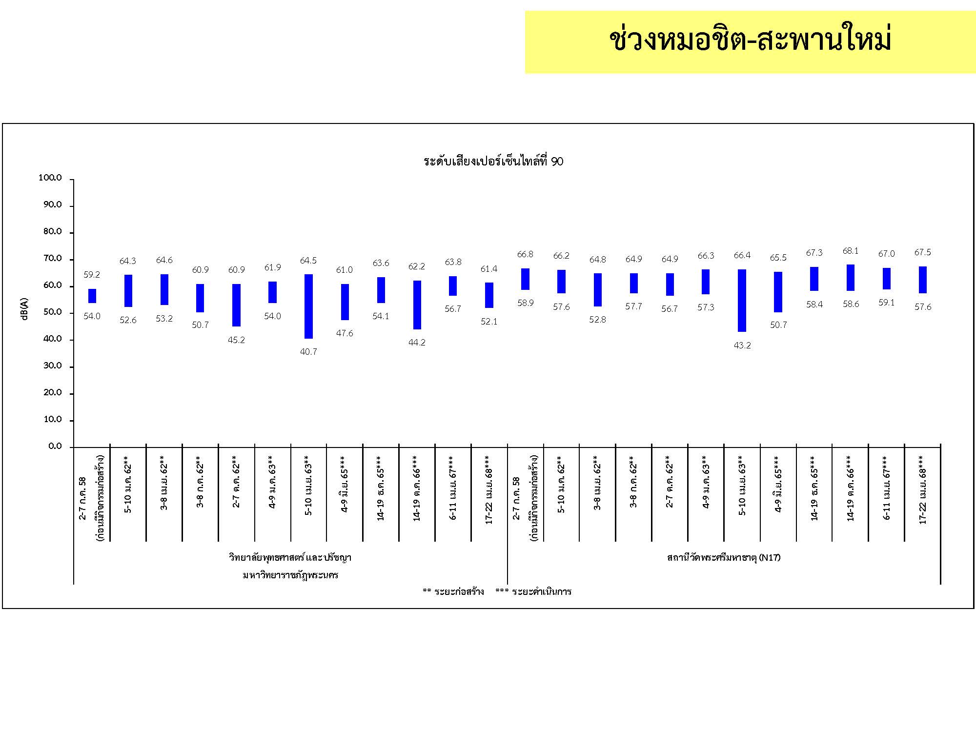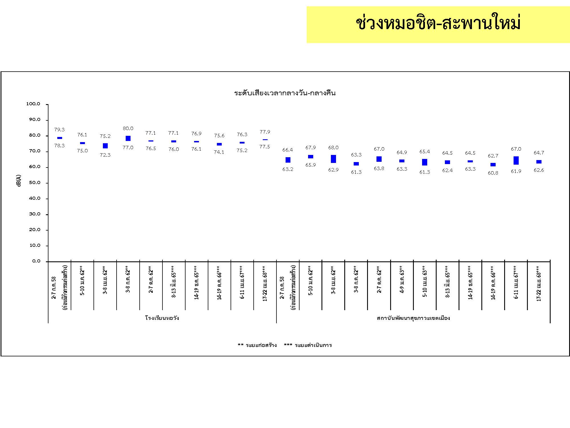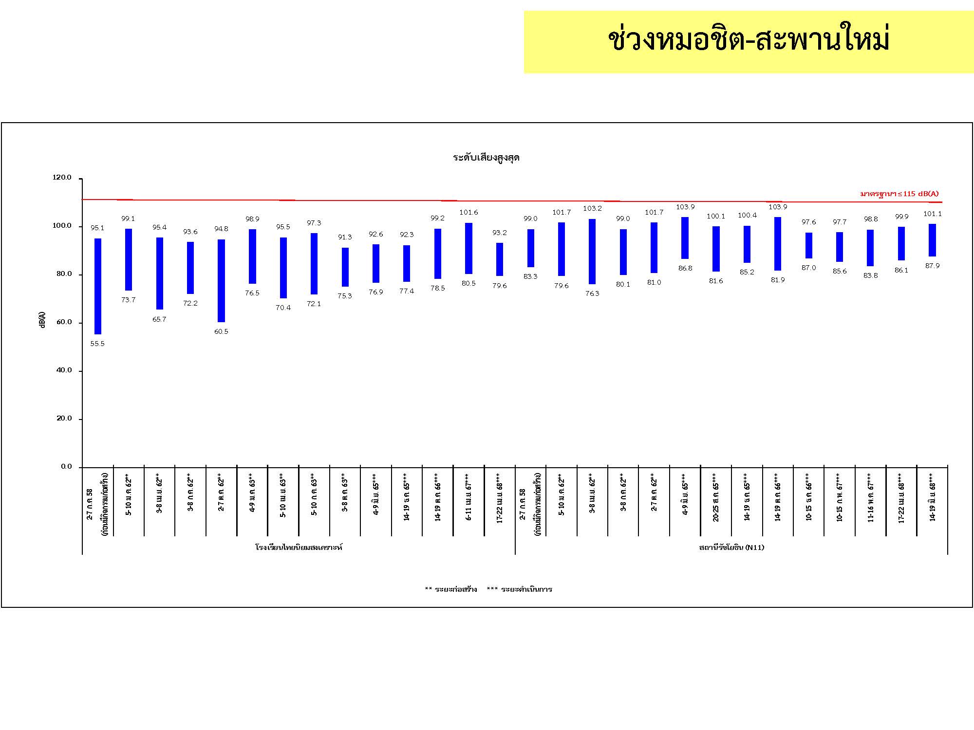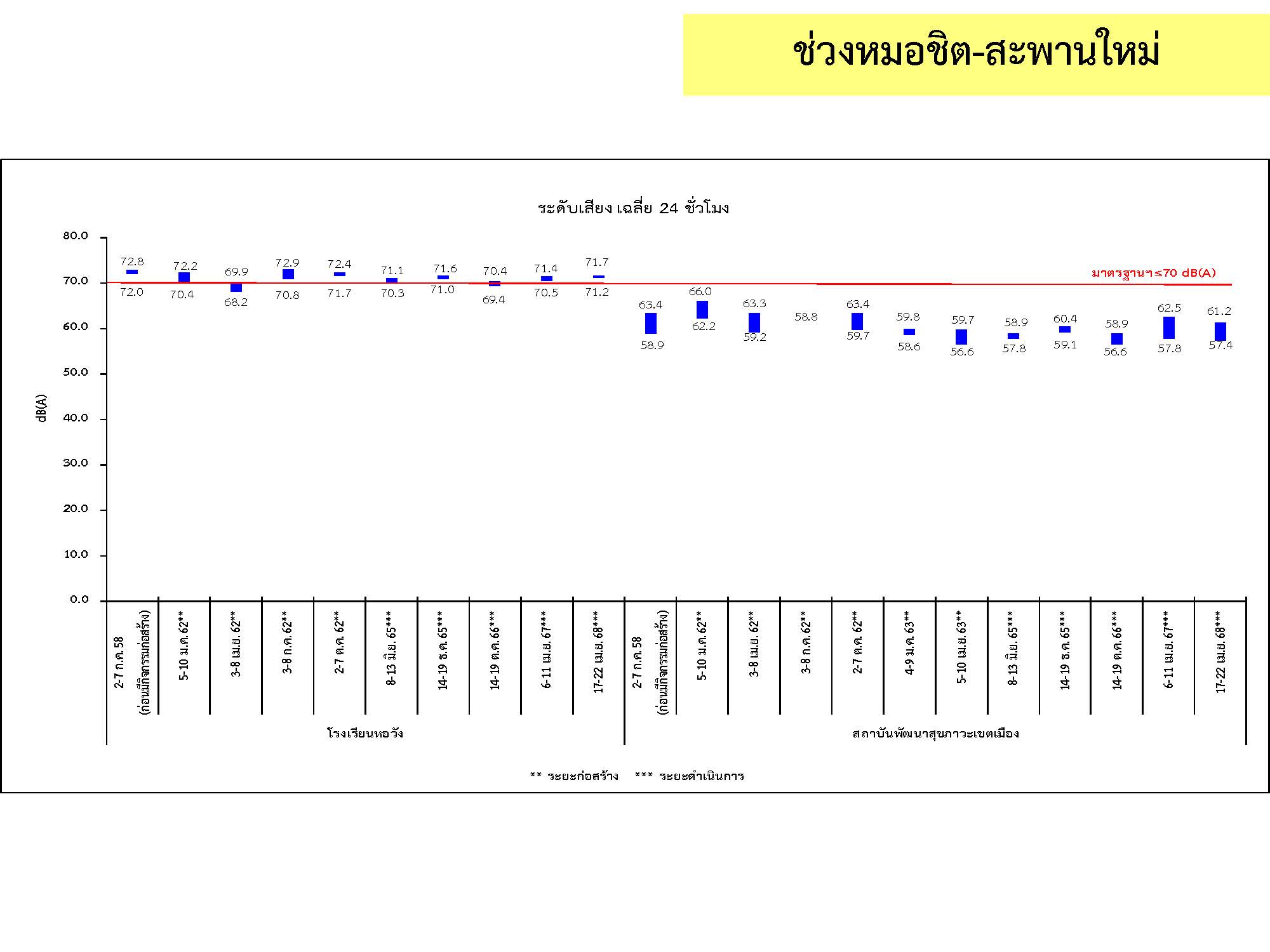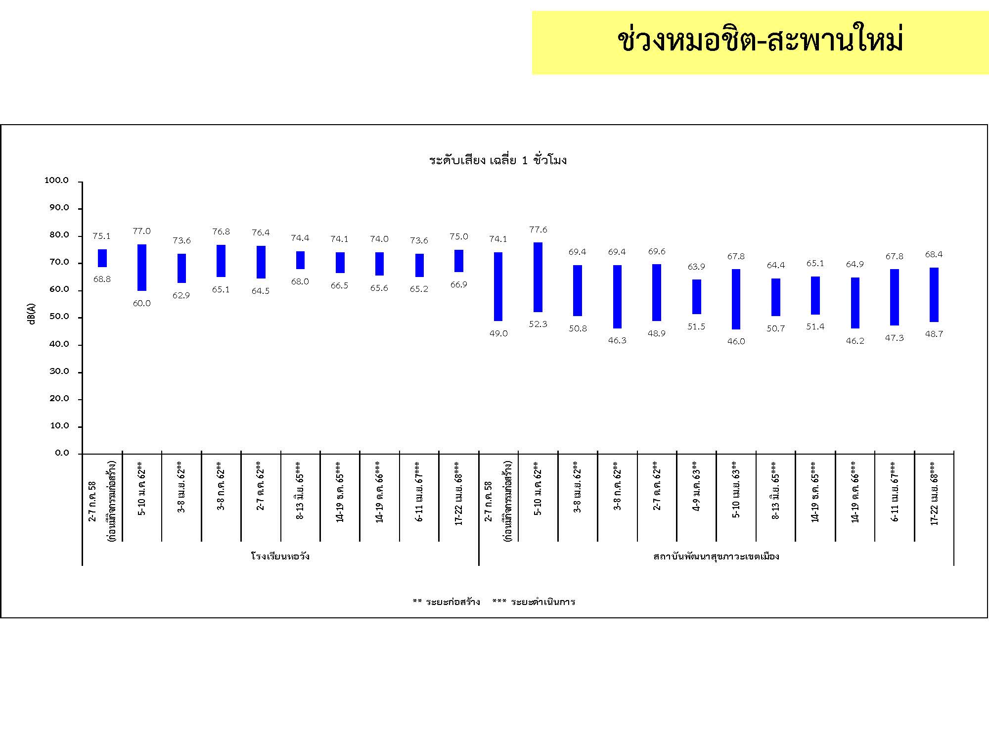 ผลการติดตามตรวจสอบระดับเสียงทั่วไป ได้แก่ ระดับเสียงเฉลี่ย 1 ชั่วโมง ระดับเสียงเฉลี่ย 24 ชั่วโมง ระดับเสียงเปอร์เซ็นไทล์ที่ 90 ระดับเสียงเฉลี่ยกลางวัน-กลางคืน และระดับเสียง ในช่วงเดือนมกราคม-มิถุนายน พ.ศ. 2568 พบว่าโรงเรียนหอวัง สถานีวัดพระศรีมหาธาตุ (N17) สถานีรัชโยธิน (N11) และสถานีสายหยุด (N19) และสถานีสะพานใหม่ (N20) มีค่าไม่อยู่ในเกณฑ์มาตรฐานที่กำหนด เนื่องจากจุดติดตามตรวจสอบระดับเสียงตั้งอยู่ริมถนนพหลโยธิน ซึ่งมีปริมาณการจราจรหนาแน่นตลอดทั้งวัน โดยโครงการควรเพิ่มเติมการปลูกต้นไม้บริเวณริมทางเท้าเกาะกลางถนน และบริเวณเสาโครงสร้างของสถานีเพื่อช่วยดูดซับเสียงจากการจราจร ส่วนโรงเรียนไทยนิยมสงเคราะห์ เนื่องจากจุดติดตามตรวจสอบระดับเสียงตั้งอยู่ภายในบริเวณโรงเรียนไทยนิยมสังเคราะห์ ซึ่งอยู่ในช่วงที่มีกิจกรรมการปรับปรุงอาคารภายในโรงเรียน จึงทำให้ระดับเสียงเฉลี่ย 24 ชั่วโมงมีค่าเกินมาตรฐาน ขณะที่ระดับเสียงสูงสุด มีค่าอยู่ในมาตรฐานระดับเสียงโดยทั่วไป ตามประกาศคณะกรรมการสิ่งแวดล้อมแห่งชาติ ฉบับที่ 15 (พ.ศ. 2540) ที่กำหนดให้ระดับเสียงสูงสุด มีค่าได้ไม่เกิน 115 เดซิเบลเอ สำหรับระดับเสียงเฉลี่ย 1 ชั่วโมง ระดับเสียงเปอร์เซ็นไทล์ที่ 90 และระดับเสียงเฉลี่ยกลางวัน-กลางคืน ยังไม่มีมาตรฐานกำหนด