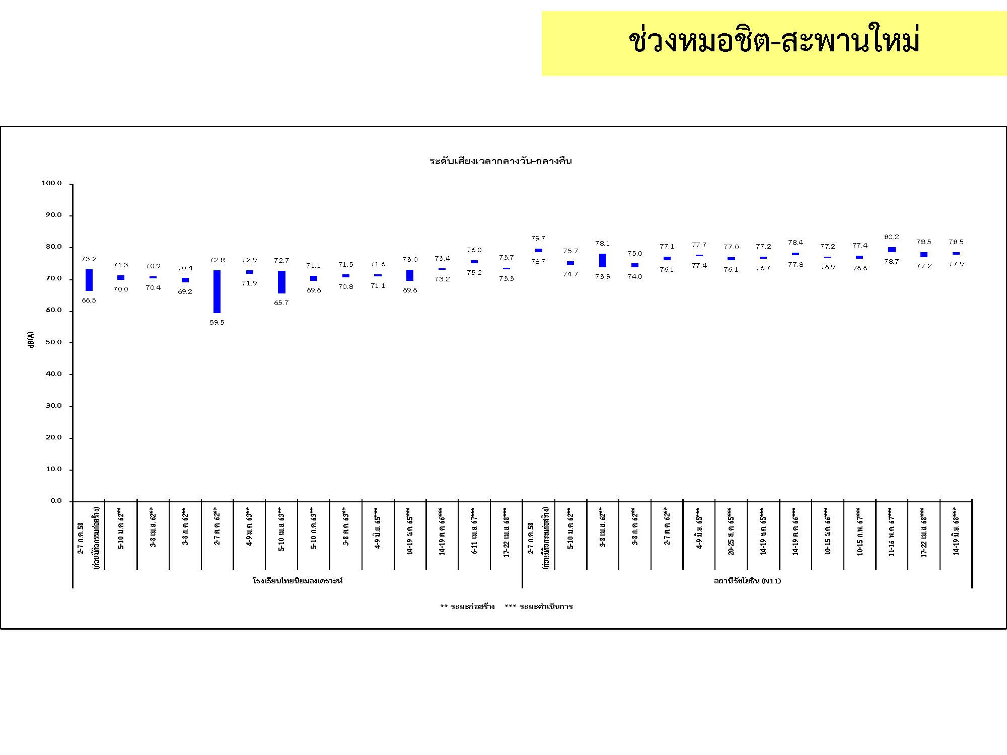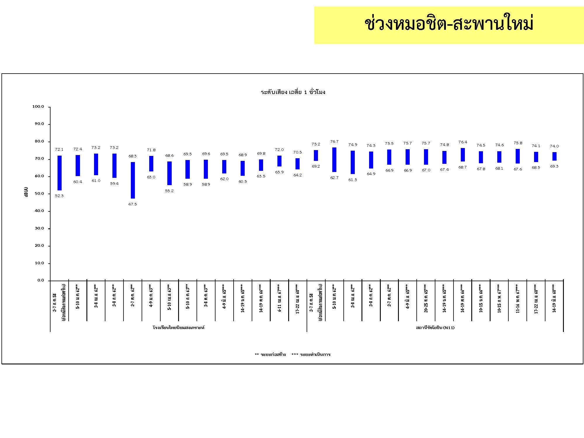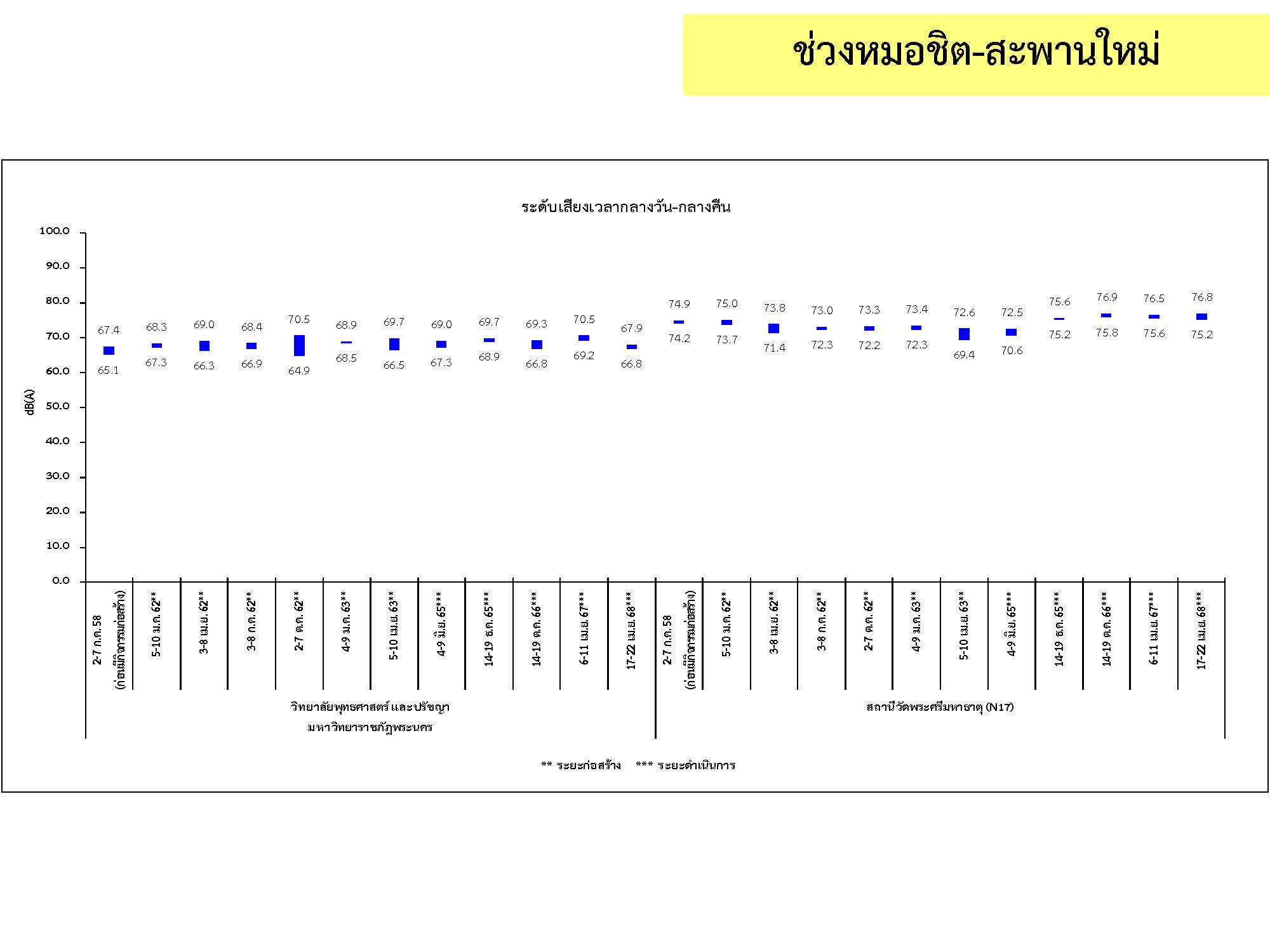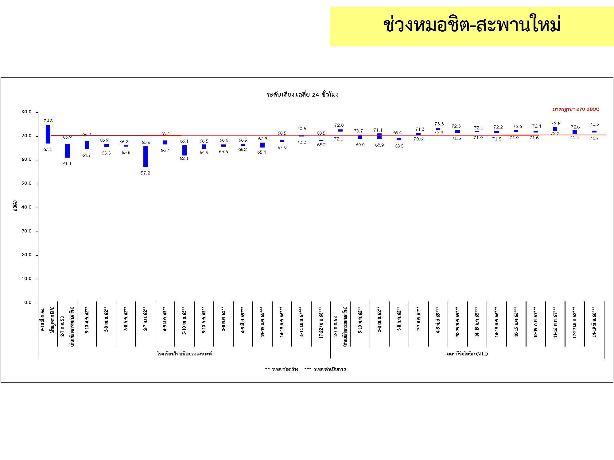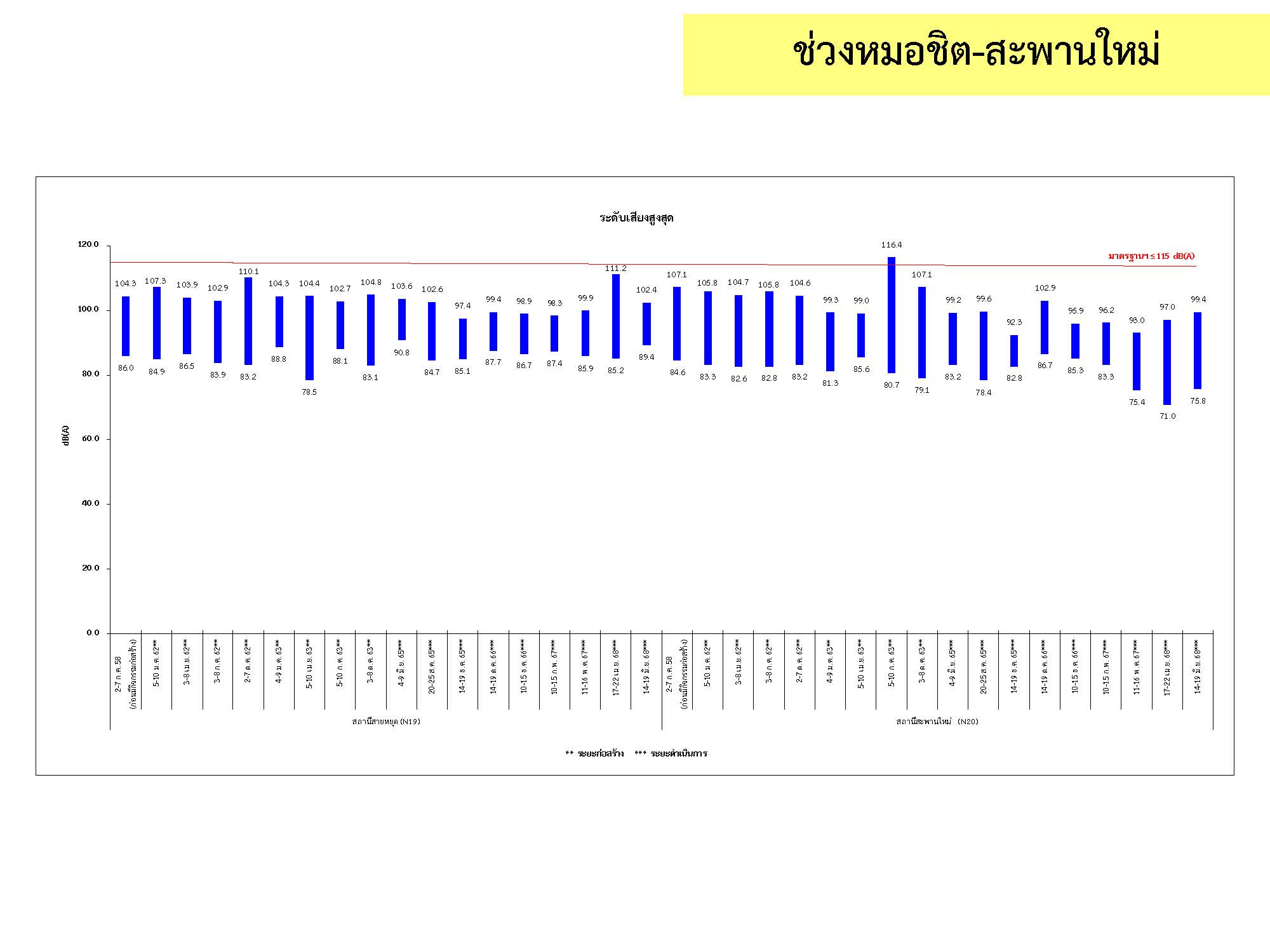 ผลการติดตามตรวจสอบระดับเสียงทั่วไป ได้แก่ ระดับเสียงเฉลี่ย 1 ชั่วโมง ระดับเสียงเฉลี่ย 24 ชั่วโมง ระดับเสียงเปอร์เซ็นไทล์ที่ 90 ระดับเสียงเฉลี่ยกลางวัน-กลางคืน และระดับเสียง ในช่วงเดือนมกราคม-มิถุนายน พ.ศ. 2568 พบว่าโรงเรียนหอวัง สถานีวัดพระศรีมหาธาตุ (N17) สถานีรัชโยธิน (N11) และสถานีสายหยุด (N19) และสถานีสะพานใหม่ (N20) มีค่าไม่อยู่ในเกณฑ์มาตรฐานที่กำหนด เนื่องจากจุดติดตามตรวจสอบระดับเสียงตั้งอยู่ริมถนนพหลโยธิน ซึ่งมีปริมาณการจราจรหนาแน่นตลอดทั้งวัน โดยโครงการควรเพิ่มเติมการปลูกต้นไม้บริเวณริมทางเท้าเกาะกลางถนน และบริเวณเสาโครงสร้างของสถานีเพื่อช่วยดูดซับเสียงจากการจราจร ส่วนโรงเรียนไทยนิยมสงเคราะห์ เนื่องจากจุดติดตามตรวจสอบระดับเสียงตั้งอยู่ภายในบริเวณโรงเรียนไทยนิยมสังเคราะห์ ซึ่งอยู่ในช่วงที่มีกิจกรรมการปรับปรุงอาคารภายในโรงเรียน จึงทำให้ระดับเสียงเฉลี่ย 24 ชั่วโมงมีค่าเกินมาตรฐาน ขณะที่ระดับเสียงสูงสุด มีค่าอยู่ในมาตรฐานระดับเสียงโดยทั่วไป ตามประกาศคณะกรรมการสิ่งแวดล้อมแห่งชาติ ฉบับที่ 15 (พ.ศ. 2540) ที่กำหนดให้ระดับเสียงสูงสุด มีค่าได้ไม่เกิน 115 เดซิเบลเอ สำหรับระดับเสียงเฉลี่ย 1 ชั่วโมง ระดับเสียงเปอร์เซ็นไทล์ที่ 90 และระดับเสียงเฉลี่ยกลางวัน-กลางคืน ยังไม่มีมาตรฐานกำหนด