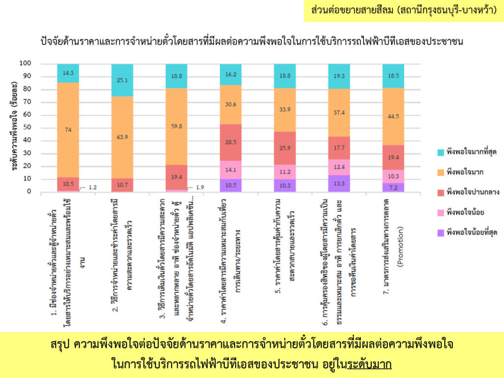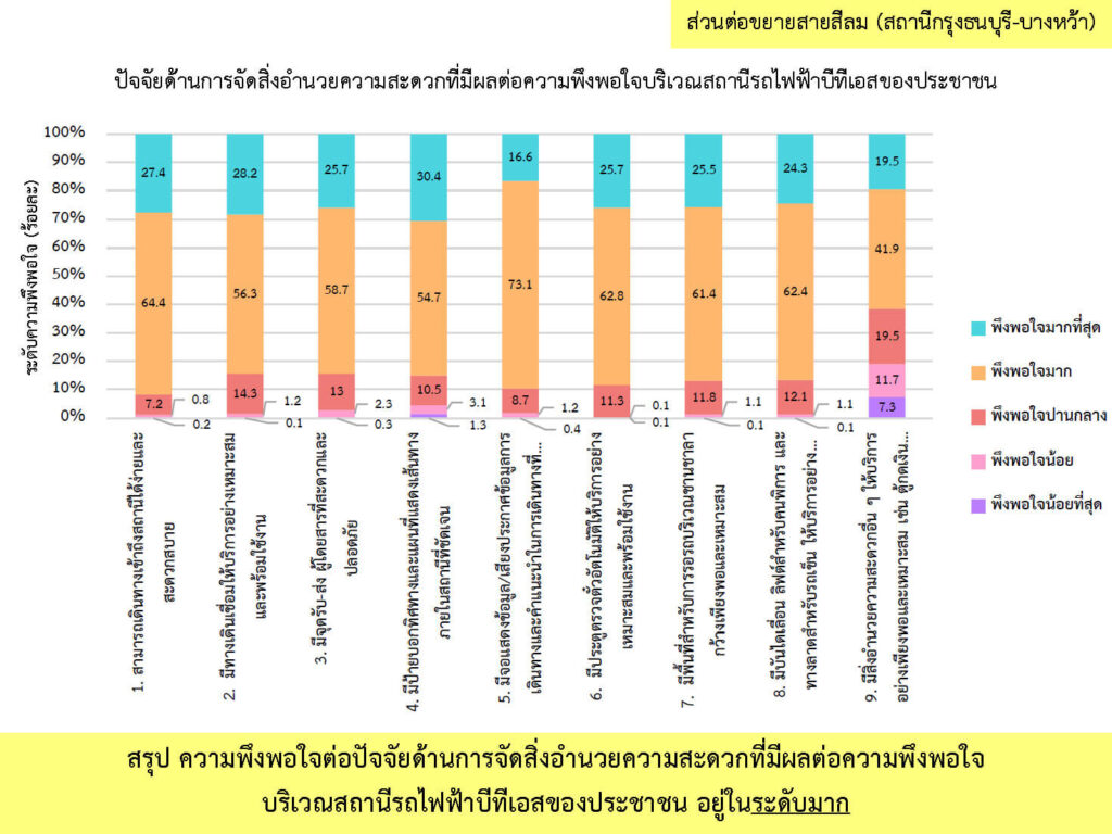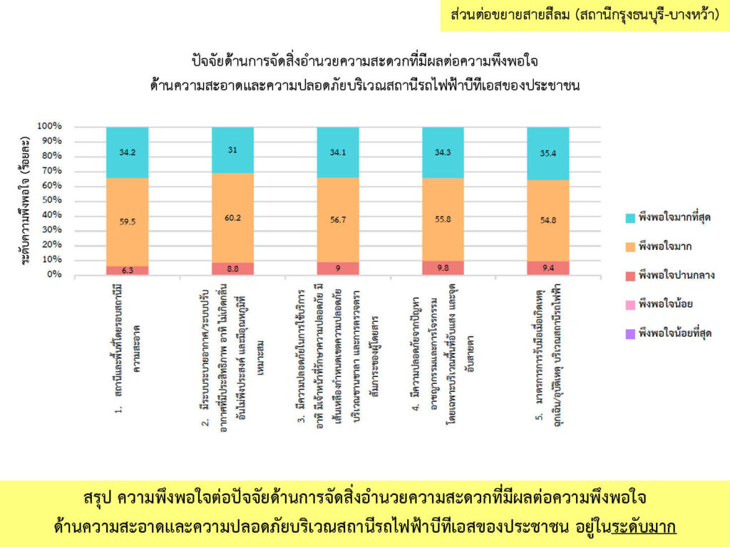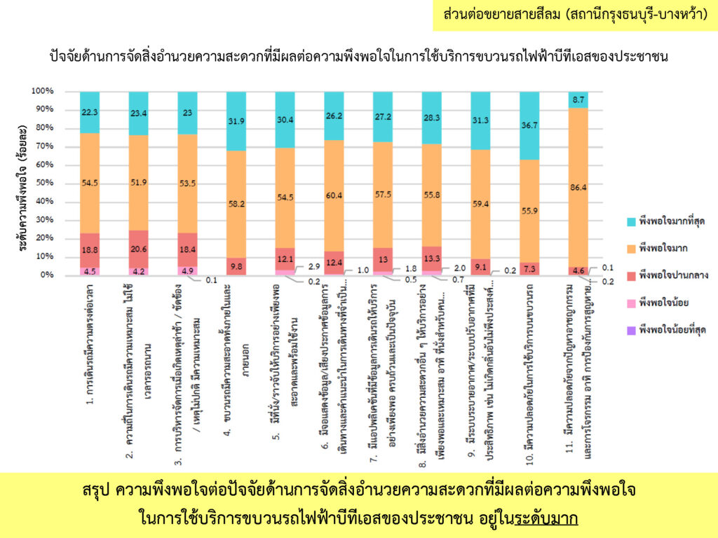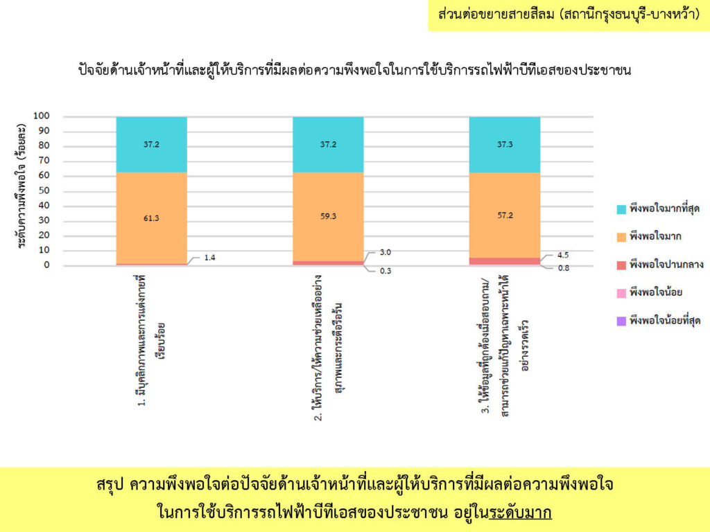 ผลการสำรวจความพึงพอใจ ระหว่างเดือนกรกฎาคม-ธันวาคม พ.ศ. 2566 จากกลุ่มตัวอย่างผู้ใช้บริการโครงการระบบขนส่งมวลชนกรุงเทพมหานคร ส่วนต่อขยายสายสีลม จำนวนทั้งสิ้น 912 คน โดยผู้ให้สัมภาษณ์ มีความพึงพอใจในระดับมาก (คิดเป็นร้อยละ 81.6) ต่อการดำเนินงานของโครงการฯ ระยะดำเนินการ