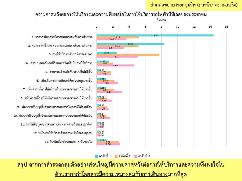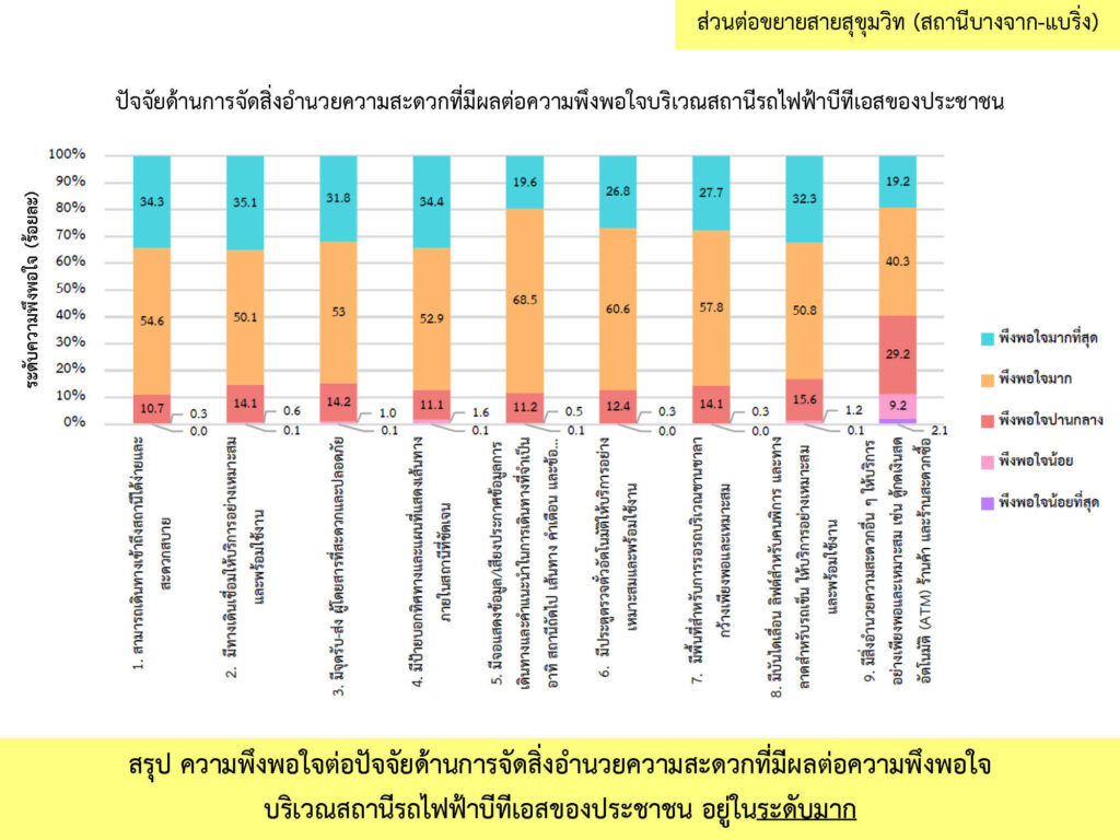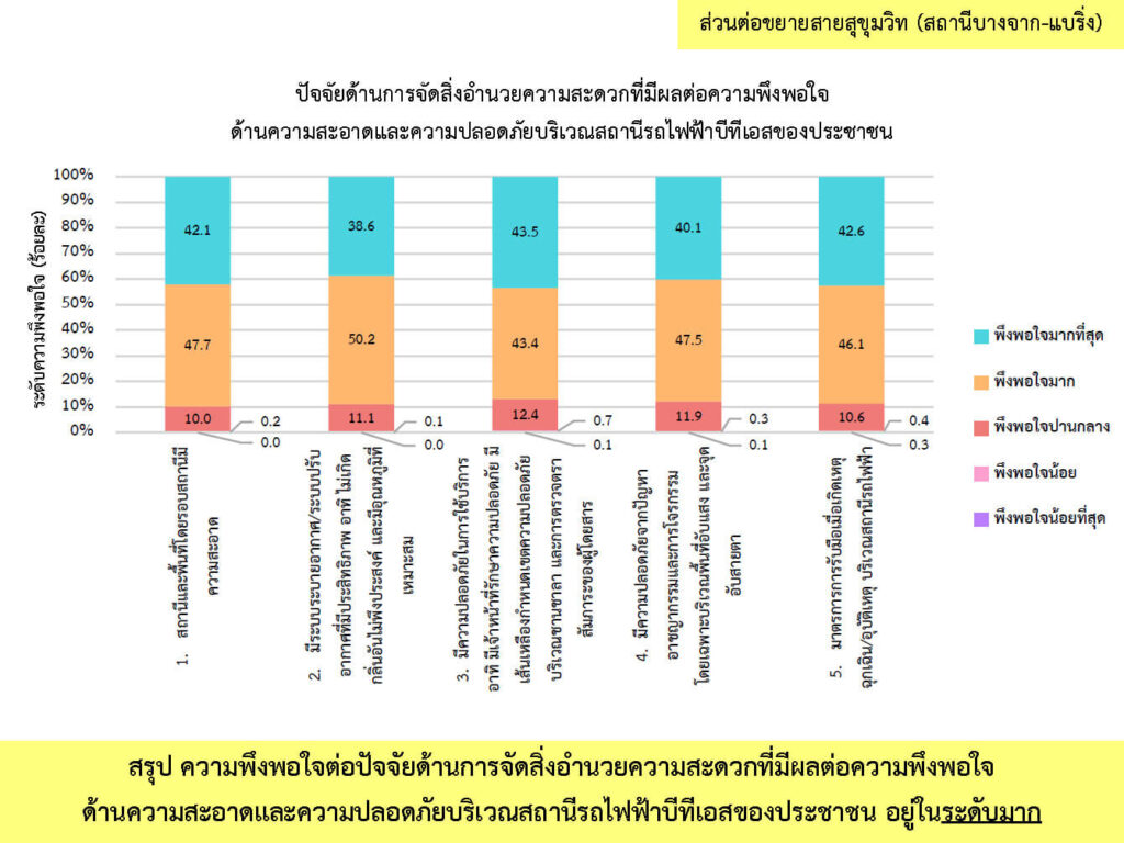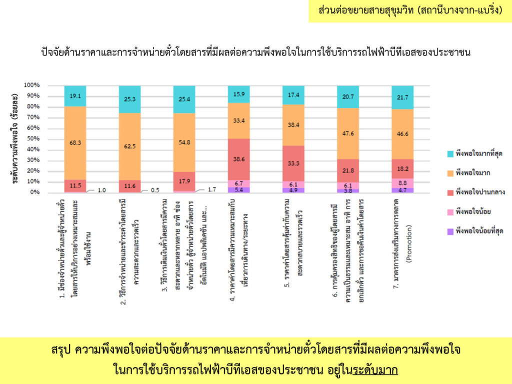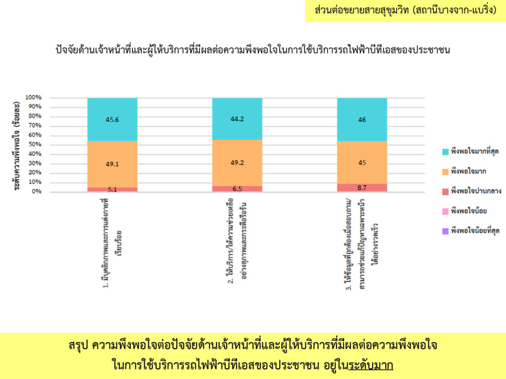 ผลการสำรวจความพึงพอใจ ระหว่างเดือนกรกฎาคม-ธันวาคม พ.ศ. 2566 จากกลุ่มตัวอย่างผู้ใช้บริการโครงการระบบขนส่งมวลชนกรุงเทพมหานคร ส่วนต่อขยายสายสุขุมวิท จำนวนทั้งสิ้น 1,157 คน โดยผู้ให้สัมภาษณ์ มีความพึงพอใจในระดับมาก (คิดเป็นร้อยละ 82.6) ต่อการดำเนินงานของโครงการฯ ระยะดำเนินการ