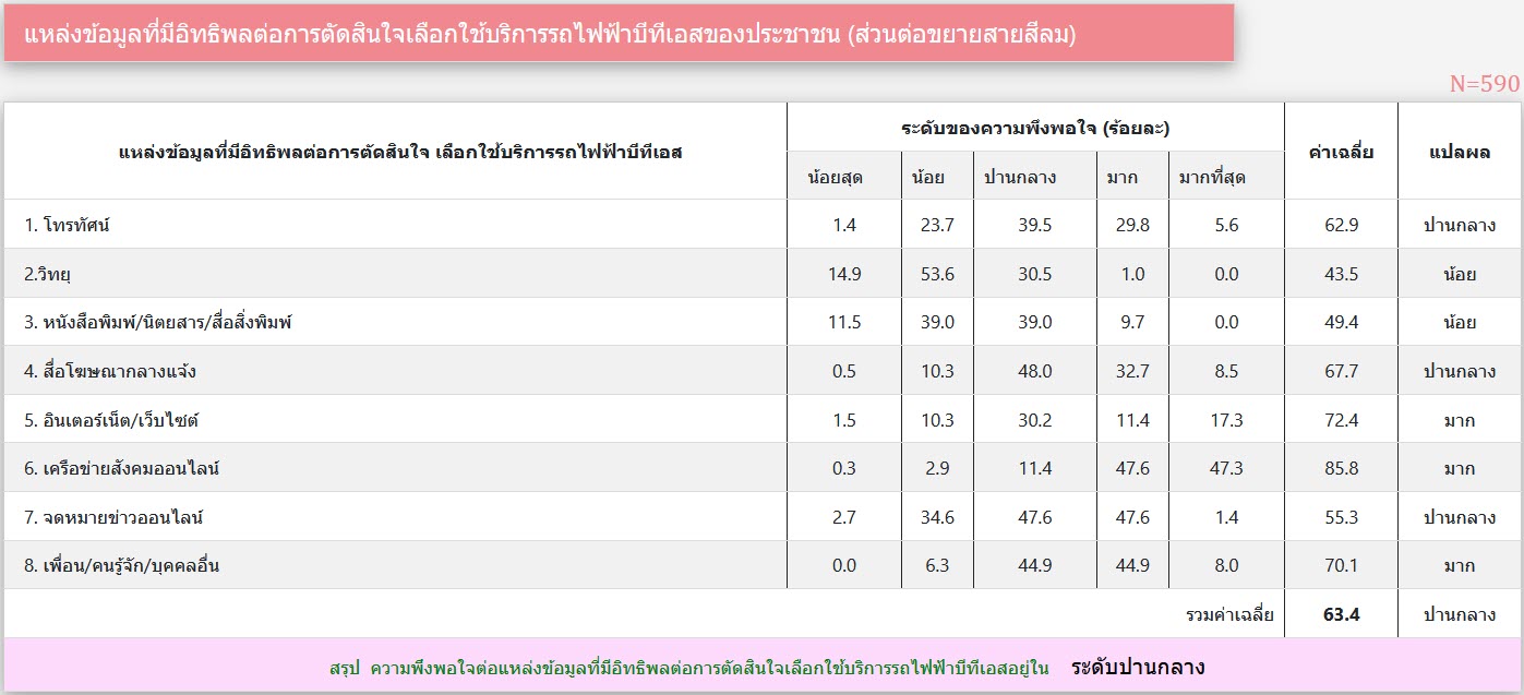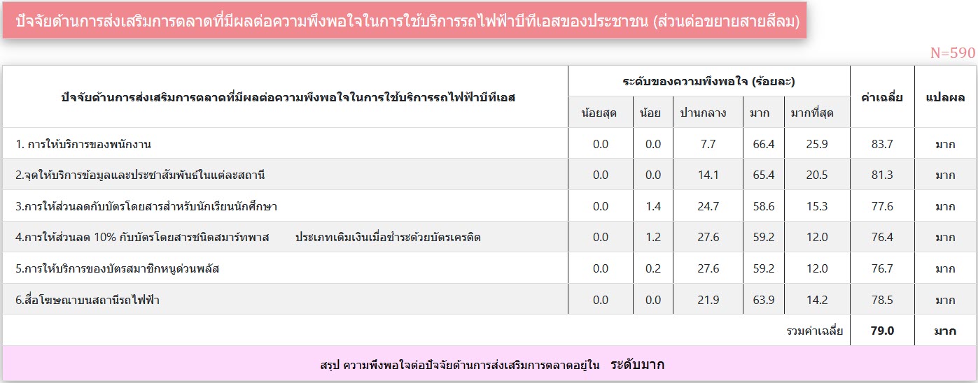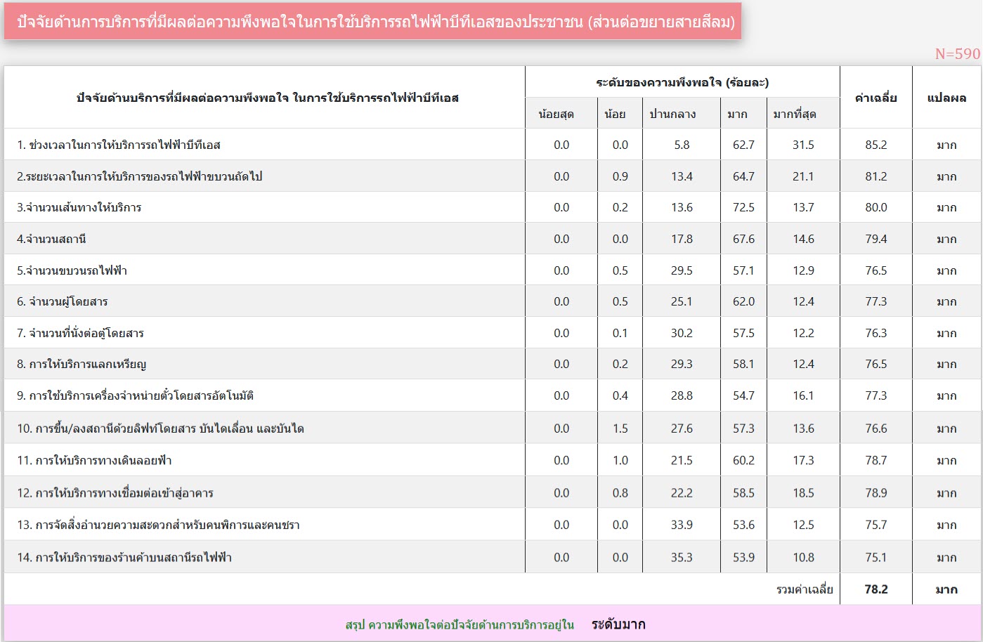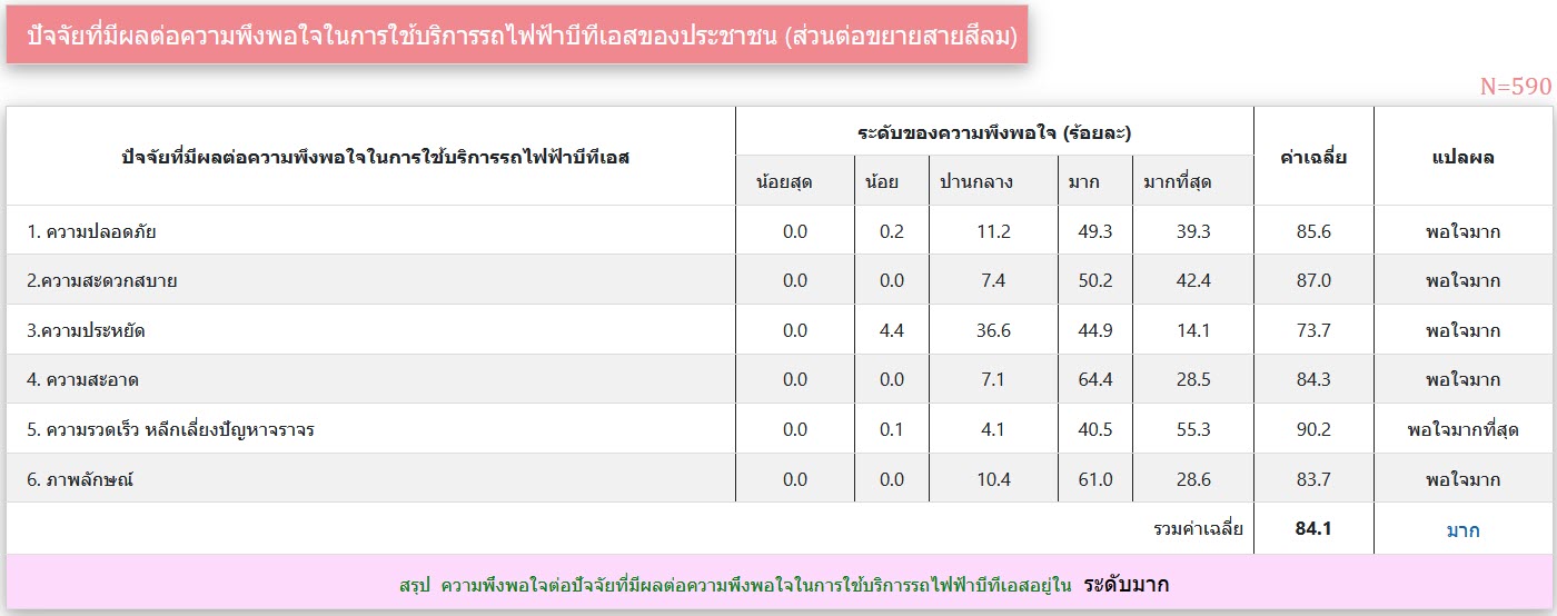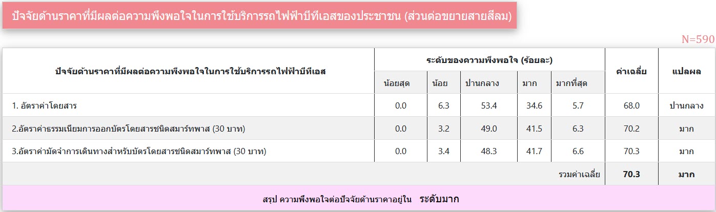 ผลการสำรวจความพึงพอใจ ระหว่างเดือนมกราคม-มิถุนายน พ.ศ. 2564จากกลุ่มตัวอย่างผู้ใช้บริการโครงการระบบขนส่งมวลชนกรุงเทพมหานคร ส่วนต่อขยายสายสีลม จำนวนทั้งสิ้น 590 คน โดยผู้ให้สัมภาษณ์มี ความพึงพอใจในระดับมาก (คิดเป็นร้อยละ 77.7) ต่อการดำเนินงานของโครงการฯ ระยะดำเนินการ