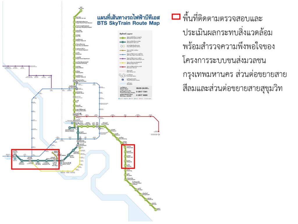 ผลการสำรวจความพึงพอใจ ได้ดำเนินการสำรวจพร้อมสรุปผลแสดงในรายงานฉบับเดือนกรกฎาคม-ธันวาคม พ.ศ. 2566 เรียบร้อยแล้ว พบว่า จากกลุ่มตัวอย่างผู้ใช้บริการโครงการระบบขนส่งมวลชนกรุงเทพมหานคร ส่วนต่อขยายสายสุขุมวิท จำนวนทั้งสิ้น 1,157 คน โดยผู้ให้สัมภาษณ์ มีความพึงพอใจในระดับมาก (คิดเป็นร้อยละ 82.6) ต่อการดำเนินงานของโครงการฯ ระยะดำเนินการ