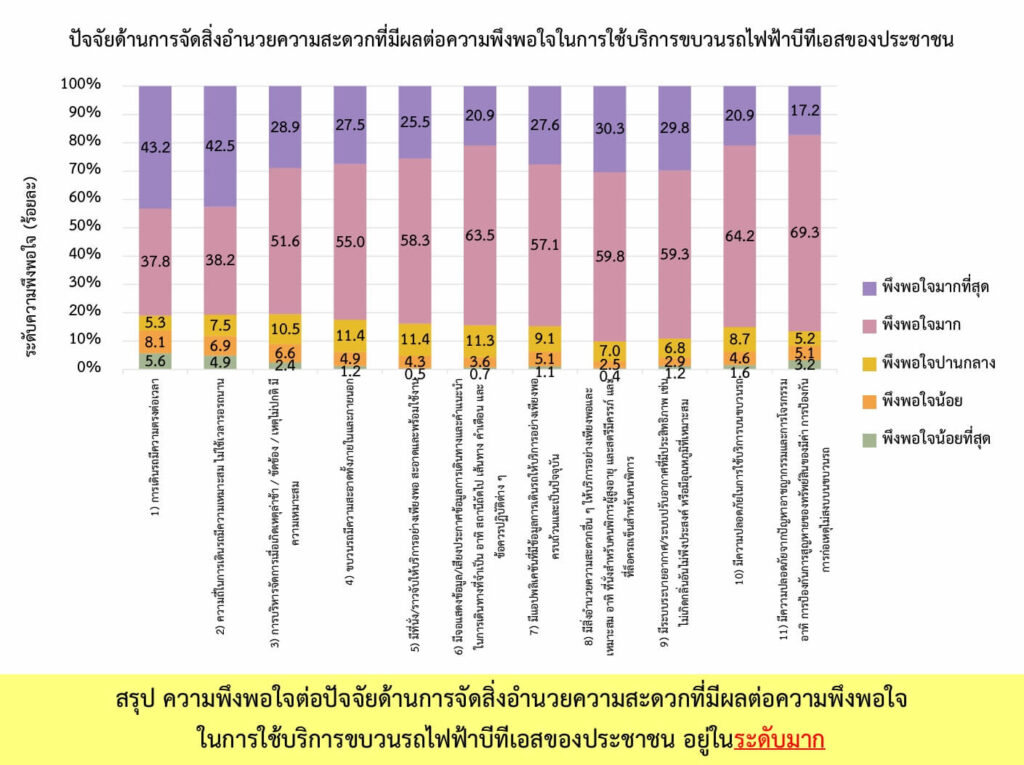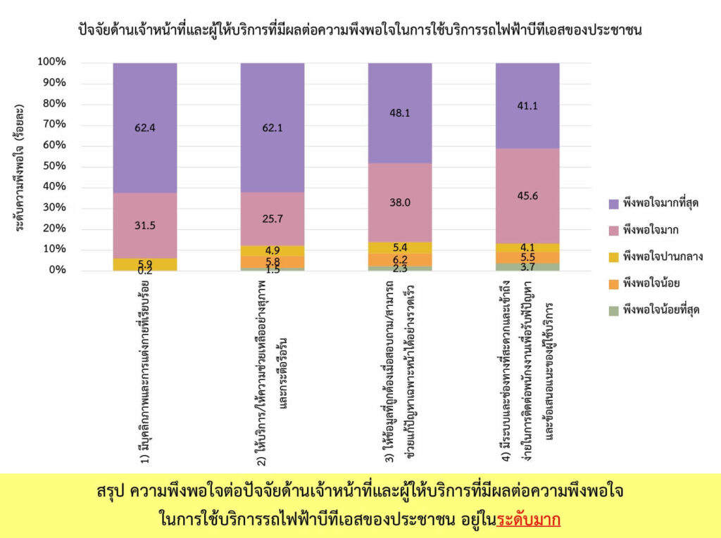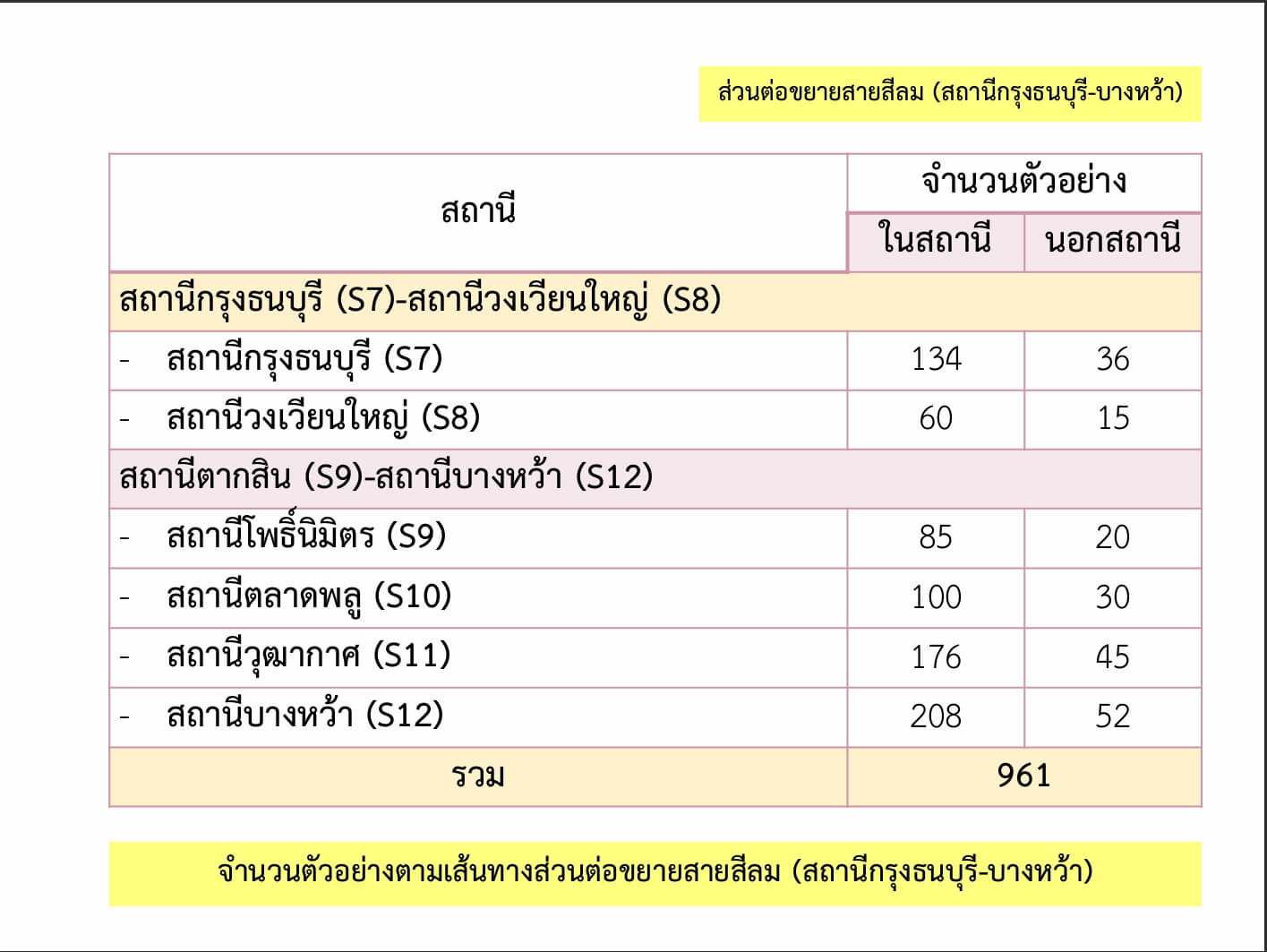 ผลการสำรวจความพึงพอใจ ได้ดำเนินการสำรวจพร้อมสรุปผลแสดงในรายงานฉบับเดือนมกราคม-มิถุนายน พ.ศ. 2568 เรียบร้อยแล้ว พบว่า จากกลุ่มตัวอย่างผู้ใช้บริการโครงการระบบขนส่งมวลชนกรุงเทพมหานคร ส่วนต่อขยายสายสีลม จำนวนทั้งสิ้น 961 คน โดยผู้ให้สัมภาษณ์ มีความพึงพอใจในระดับมาก (คิดเป็นร้อยละ 81.0) ต่อการดำเนินงานของโครงการฯ ระยะดำเนินการ