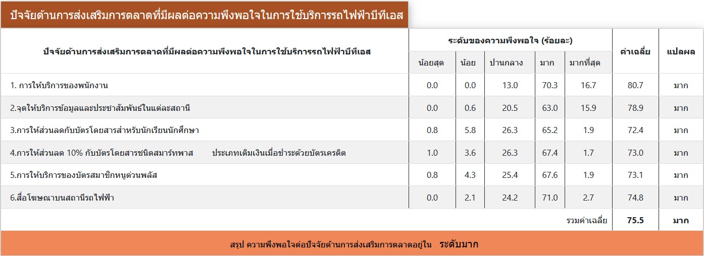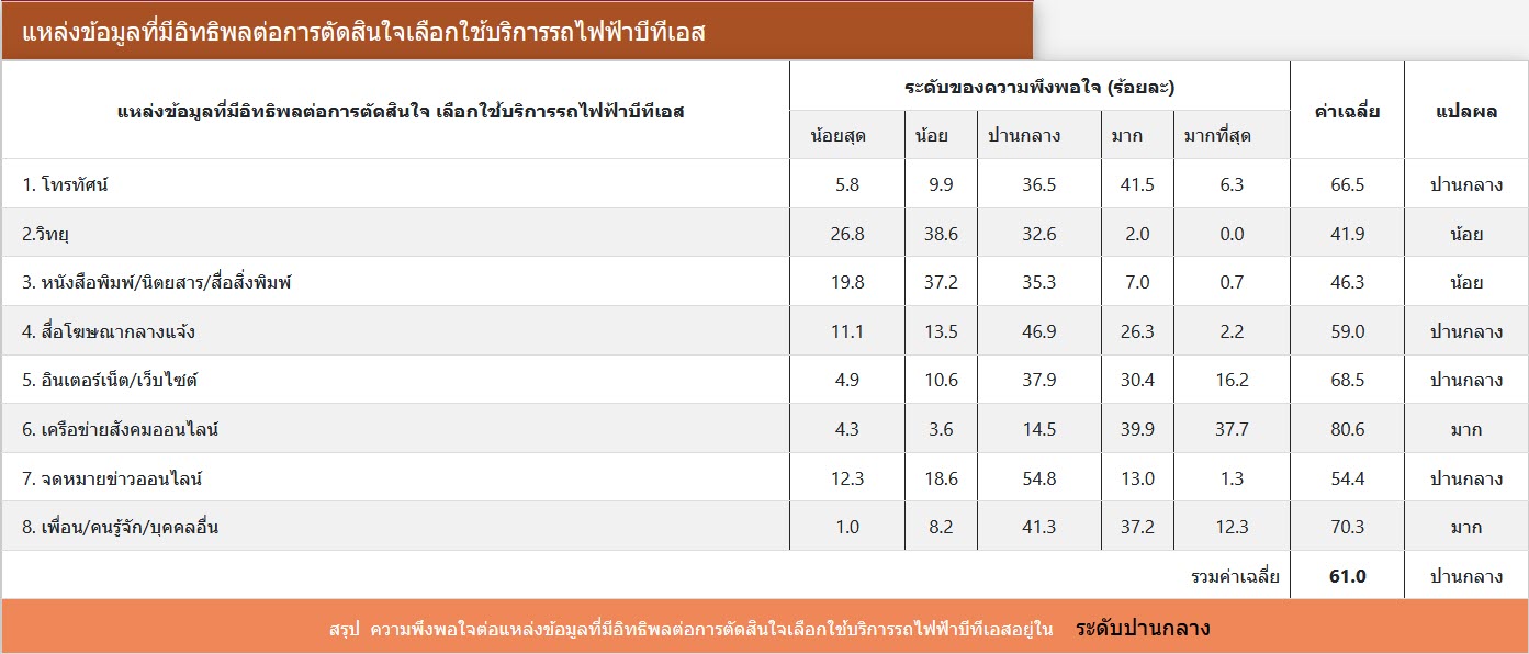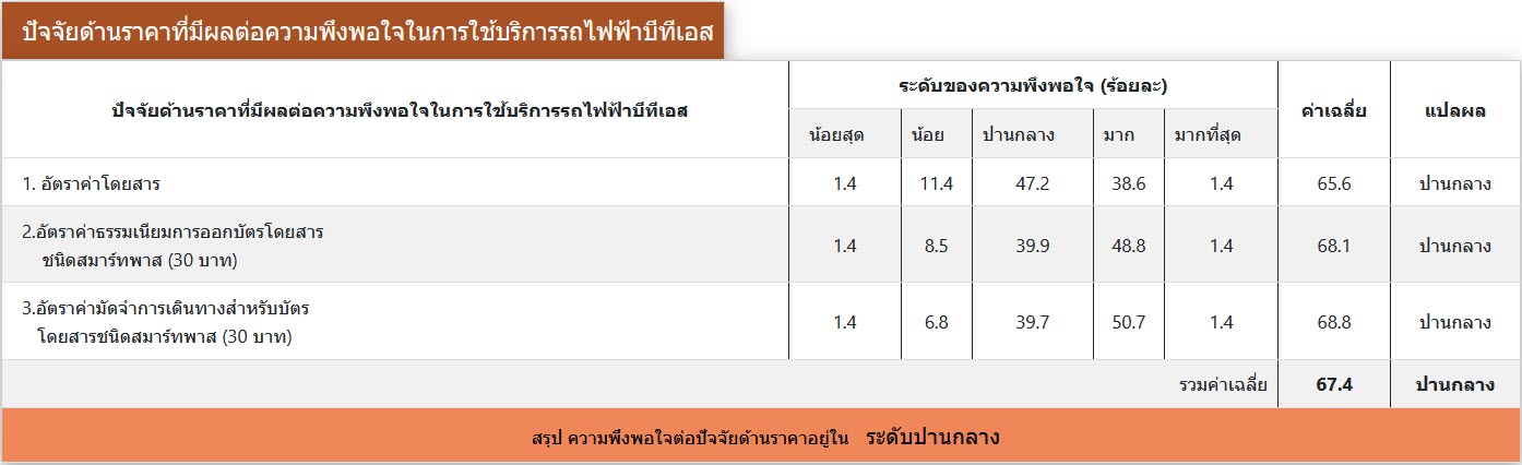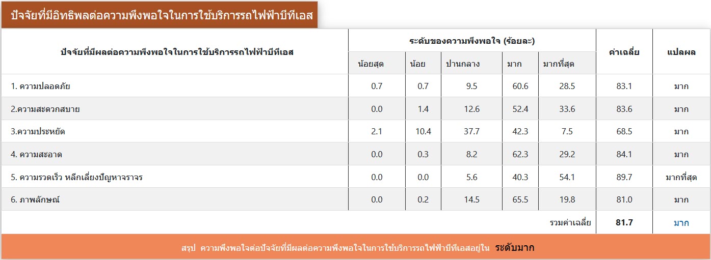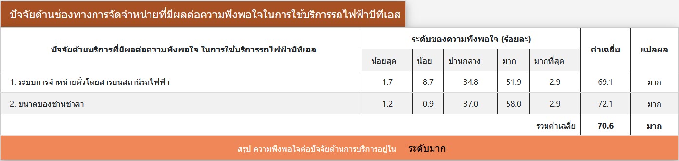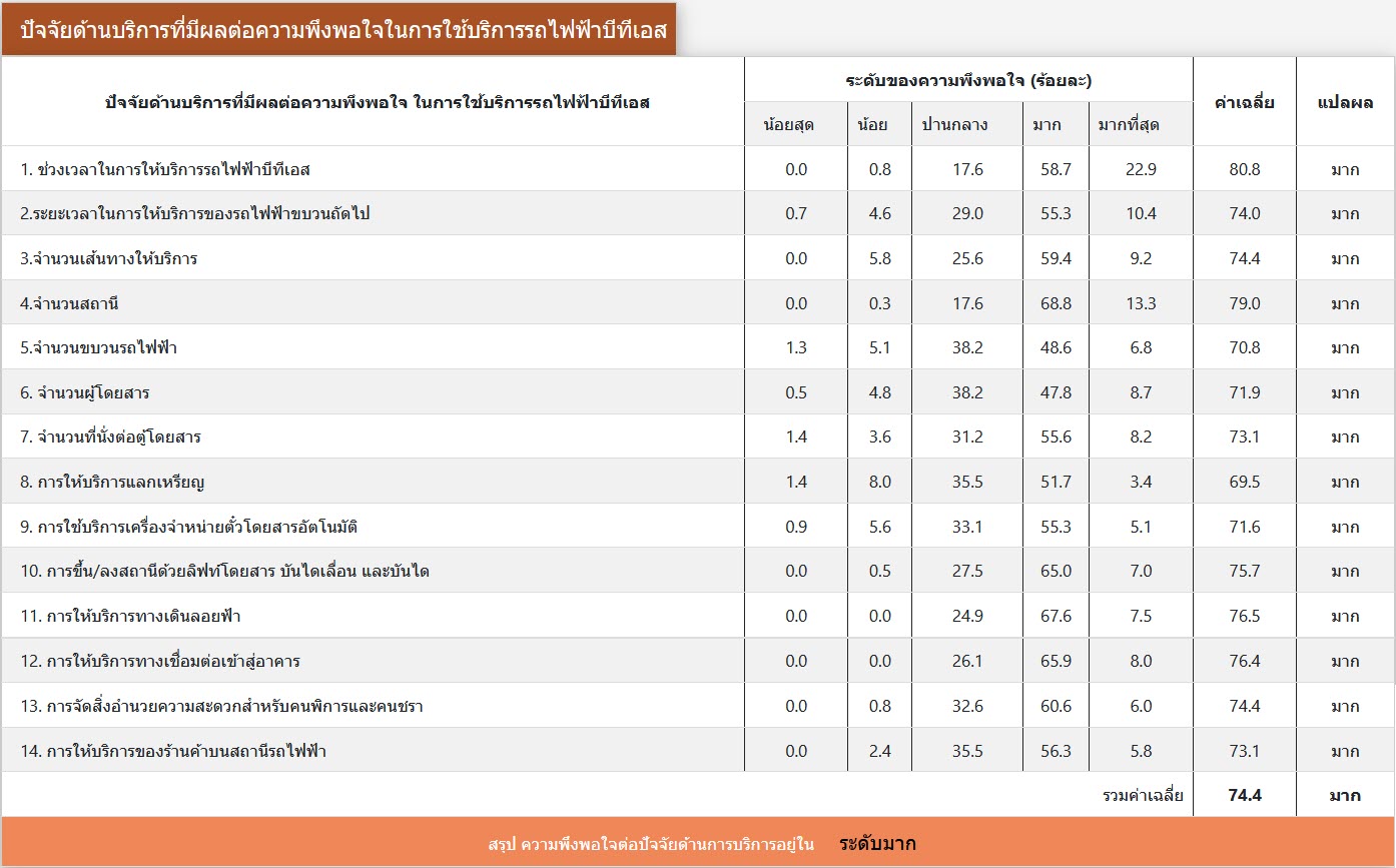 ผลการสำรวจความพึงพอใจ ระหว่างเดือนมกราคม-มิถุนายน พ.ศ. 2563 จากกลุ่มตัวอย่างผู้ใช้บริการโครงการระบบขนส่งมวลชนกรุงเทพมหานคร ส่วนต่อขยายสายสุขุมวิท จำนวนทั้งสิ้น 414 คน โดยผู้ให้สัมภาษณ์ มีความพึงพอใจในระดับมาก (คิดเป็นร้อยละ 72) ต่อการดำเนินงานของโครงการฯ ระยะดำเนินการ