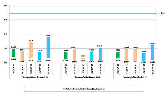 ผลการติดตามตรวจสอบความสั่นสะเทือน ได้แก่ ความสั่นสะเทือน (Peak Particle Velocity) และความถี่ (Frequency) ระหว่างปี พ.ศ. 2560-2562 พบว่า ดัชนีความสั่นสะเทือนทั้งหมด มีค่าอยู่ในมาตรฐานกำหนดตามประกาศคณะกรรมการสิ่งแวดล้อมแห่งชาติ ฉบับที่ 37 (พ.ศ. 2553) เรื่อง กำหนดมาตรฐานความสั่นสะเทือนเพื่อป้องกันผลกระทบต่ออาคาร