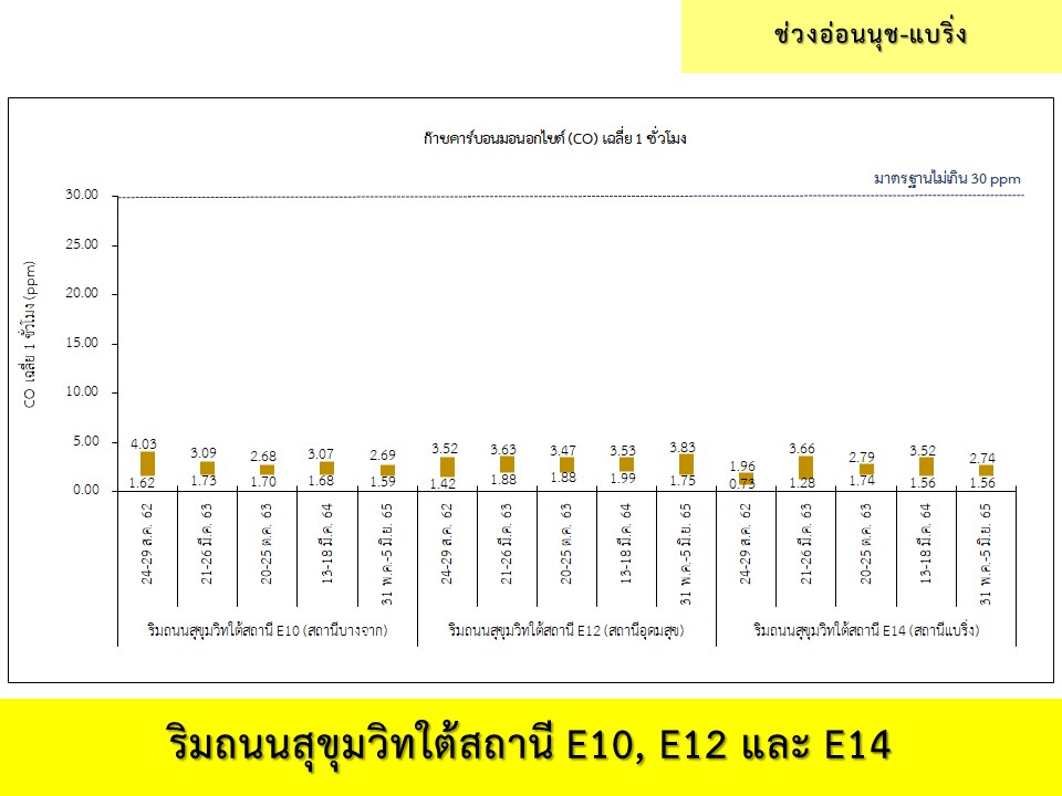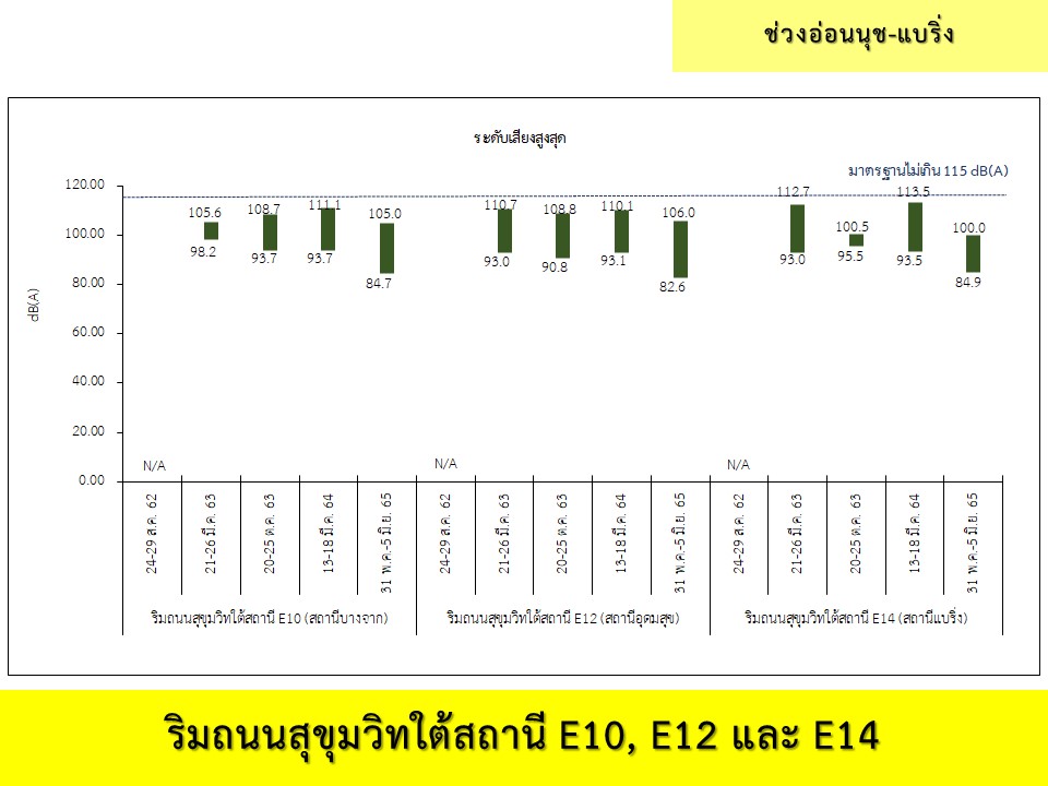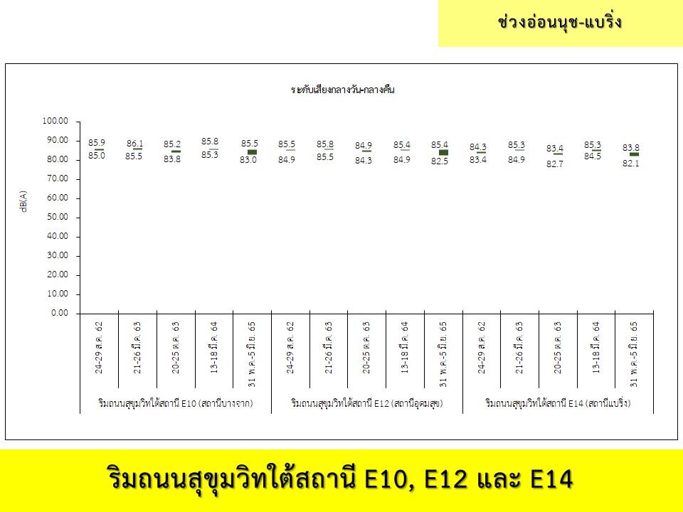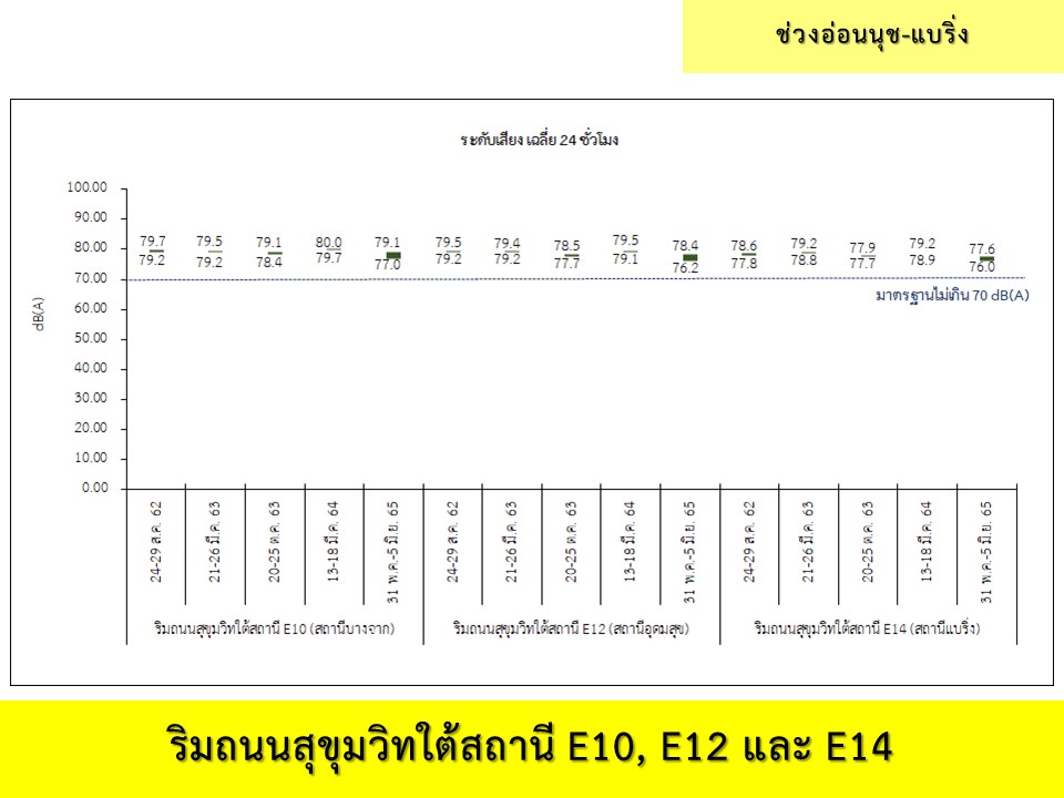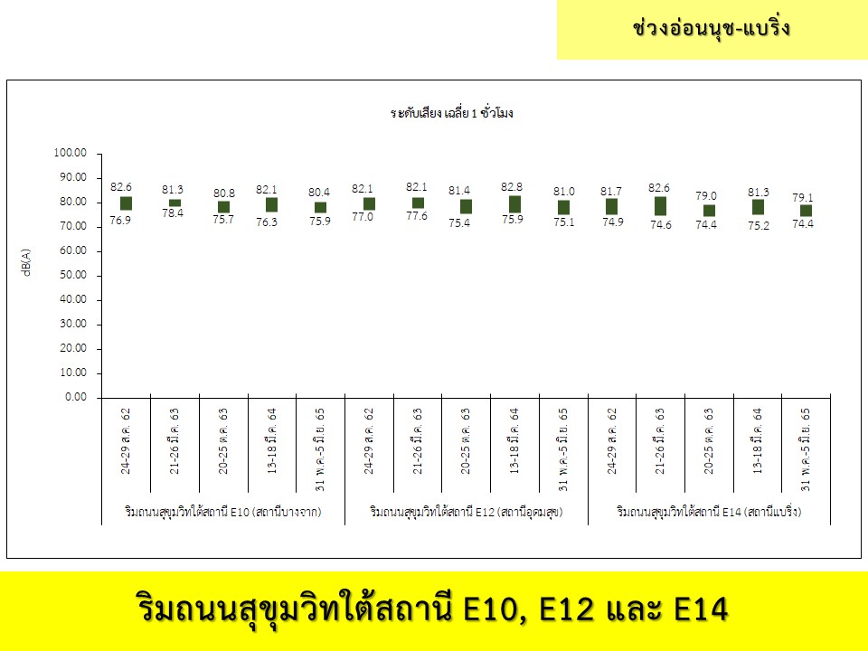 ผลการติดตามตรวจสอบระดับเสียงโดยทั่วไป ได้แก่ ระดับเสียงเฉลี่ย 1 ชั่วโมง ระดับเสียงเฉลี่ย 24 ชั่วโมง ระดับเสียงสูงสุด ระดับเสียงเปอร์เซ็นไทล์ที่ 90 และระดับเสียงเฉลี่ยกลางวัน-กลางคืน ระหว่างปี พ.ศ. 2562-2565 พบว่า ระดับเสียงเฉลี่ย 24 ชั่วโมง มีค่าเกินมาตรฐานกำหนดตามประกาศคณะกรรมการสิ่งแวดล้อมแห่งชาติ ฉบับที่ 15 (พ.ศ. 2540) เรื่อง กำหนดมาตรฐานระดับเสียงโดยทั่วไป เนื่องจาก จุดติดตามตรวจสอบตั้งอยู่บนทางเดินเท้าริมถนนสุขุมวิท ซึ่งมีปริมาณจราจรค่อนข้างหนาแน่นจึงทำให้มีระดับเสียงเกินมาตรฐานฯ และระดับเสียงสูงสุดมีค่าอยู่ในมาตรฐานฯ ในขณะที่ระดับเสียงเฉลี่ย 1 ชั่วโมง ระดับเสียงเปอร์เซ็นไทล์ที่ 90 และระดับเสียงเฉลี่ยกลางวัน-กลางคืน ปัจจุบันยังไม่มีมาตรฐานกำหนด