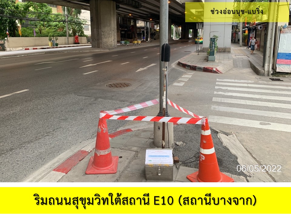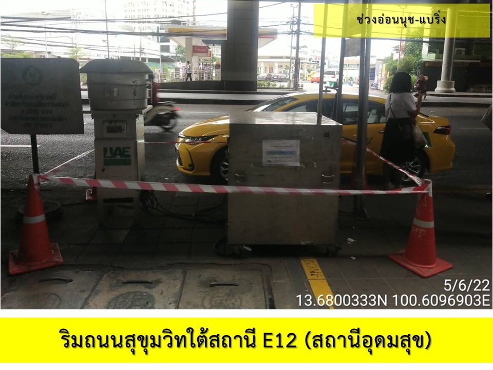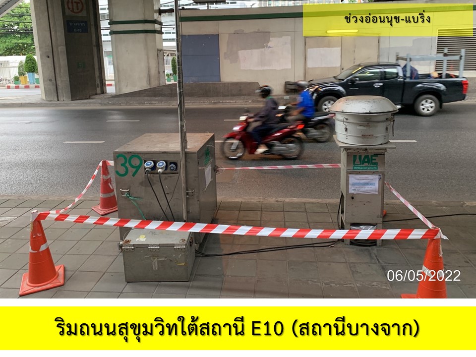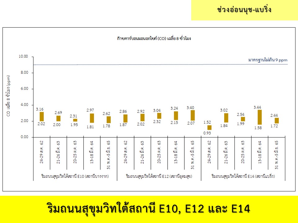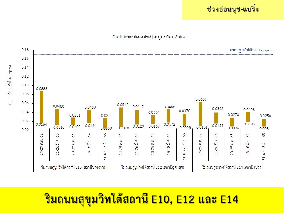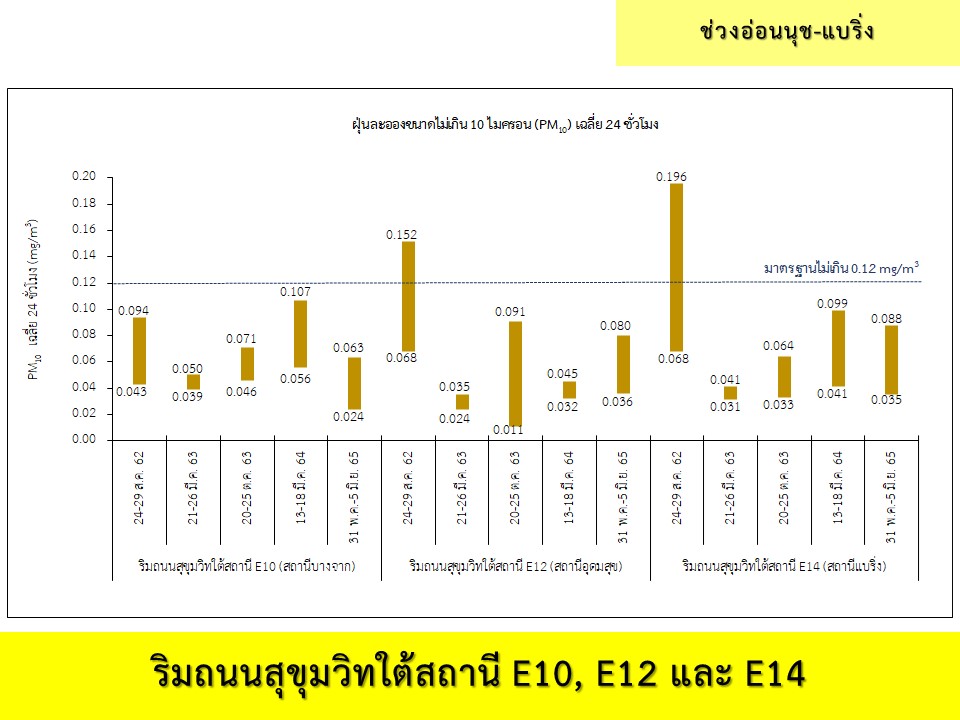 ผลการติดตามตรวจสอบระดับเสียงโดยทั่วไป ได้แก่ ระดับเสียงเฉลี่ย 1 ชั่วโมง ระดับเสียงเฉลี่ย 24 ชั่วโมง ระดับเสียงสูงสุด ระดับเสียงเปอร์เซ็นไทล์ที่ 90 และระดับเสียงเฉลี่ยกลางวัน-กลางคืน ระหว่างปี พ.ศ. 2562-2565 พบว่า ระดับเสียงเฉลี่ย 24 ชั่วโมง มีค่าเกินมาตรฐานกำหนดตามประกาศคณะกรรมการสิ่งแวดล้อมแห่งชาติ ฉบับที่ 15 (พ.ศ. 2540) เรื่อง กำหนดมาตรฐานระดับเสียงโดยทั่วไป เนื่องจาก จุดติดตามตรวจสอบตั้งอยู่บนทางเดินเท้าริมถนนสุขุมวิท ซึ่งมีปริมาณจราจรค่อนข้างหนาแน่นจึงทำให้มีระดับเสียงเกินมาตรฐานฯ และระดับเสียงสูงสุดมีค่าอยู่ในมาตรฐานฯ ในขณะที่ระดับเสียงเฉลี่ย 1 ชั่วโมง ระดับเสียงเปอร์เซ็นไทล์ที่ 90 และระดับเสียงเฉลี่ยกลางวัน-กลางคืน ปัจจุบันยังไม่มีมาตรฐานกำหนด