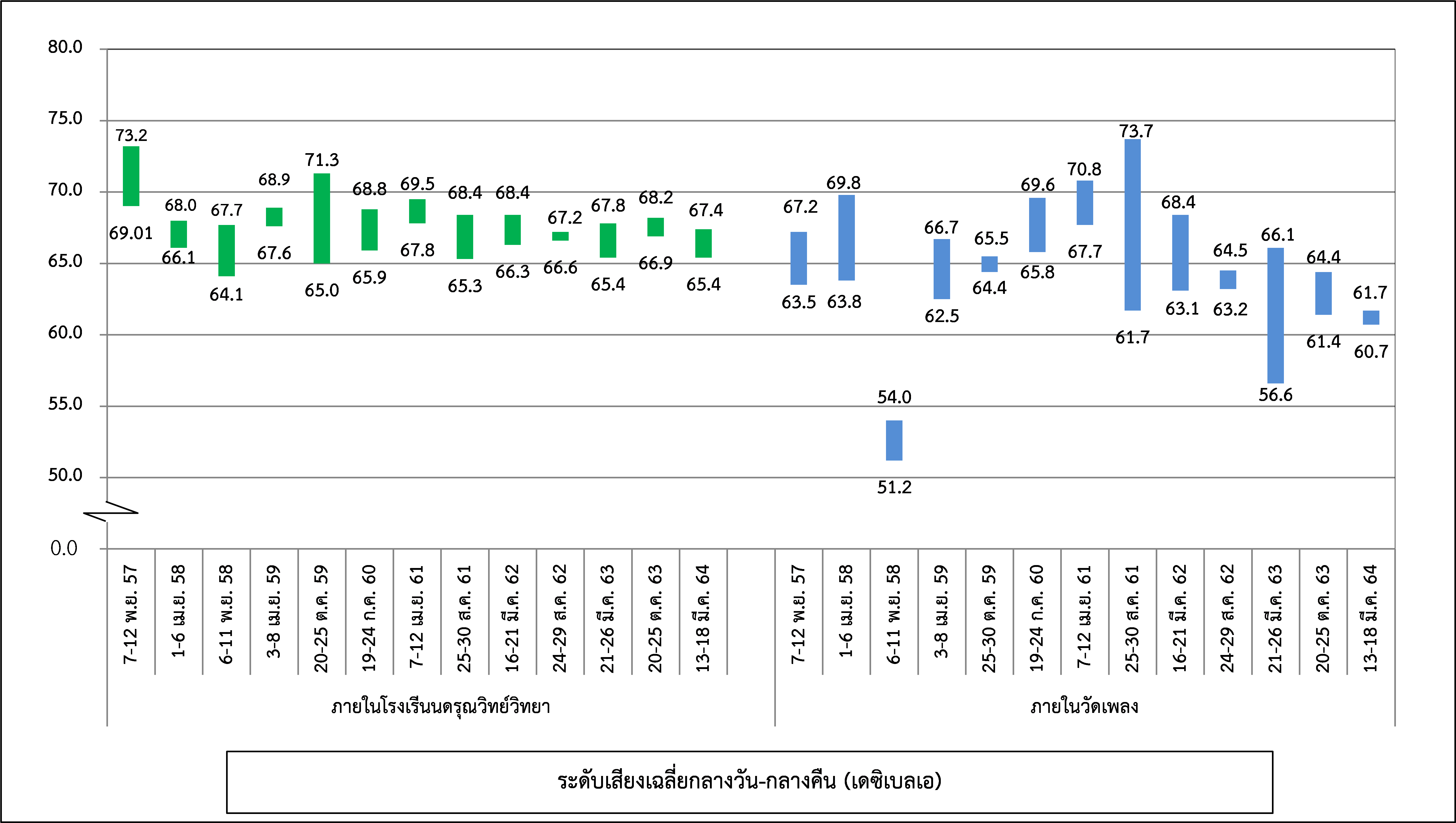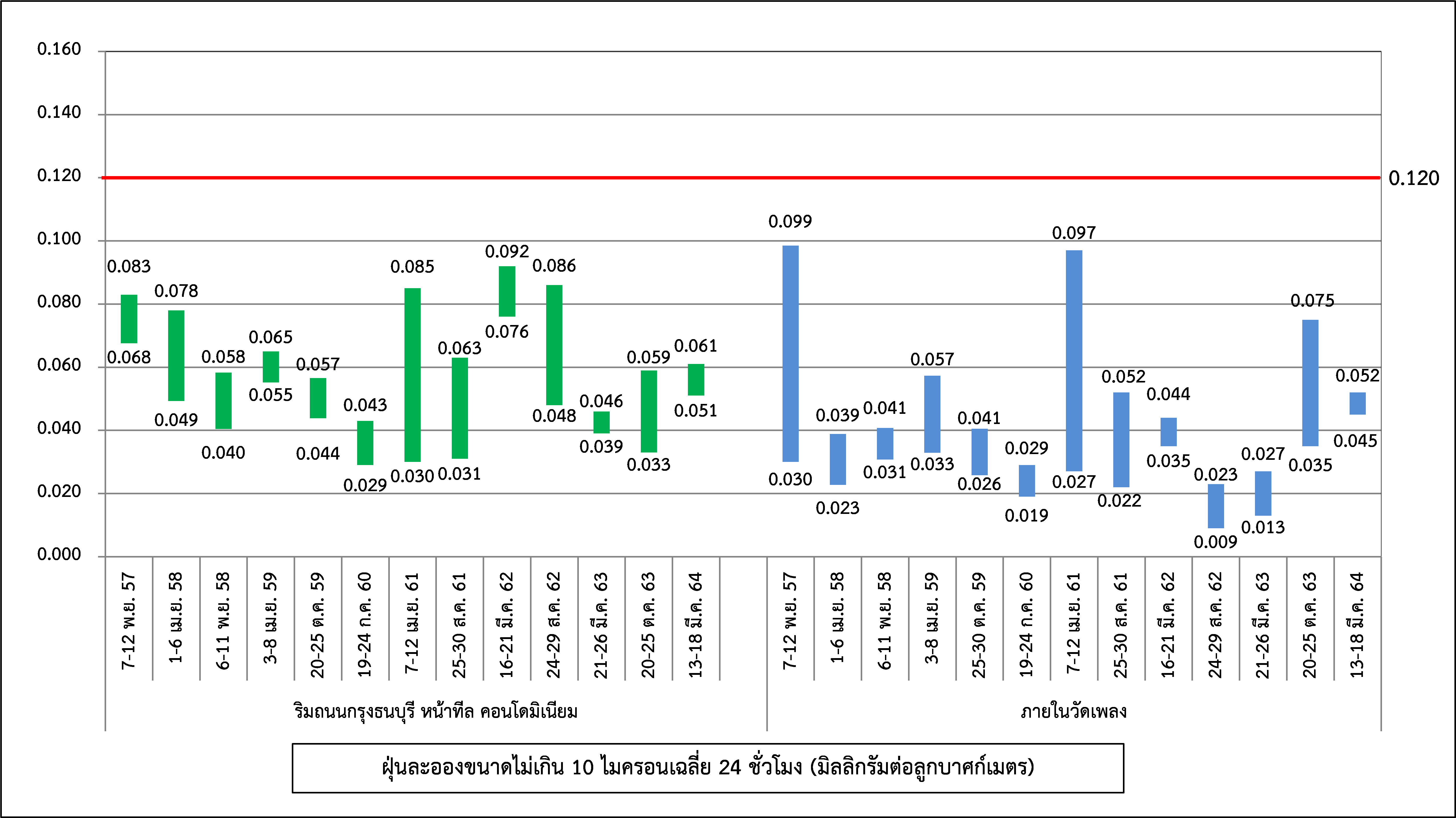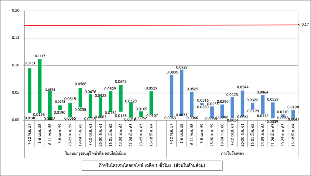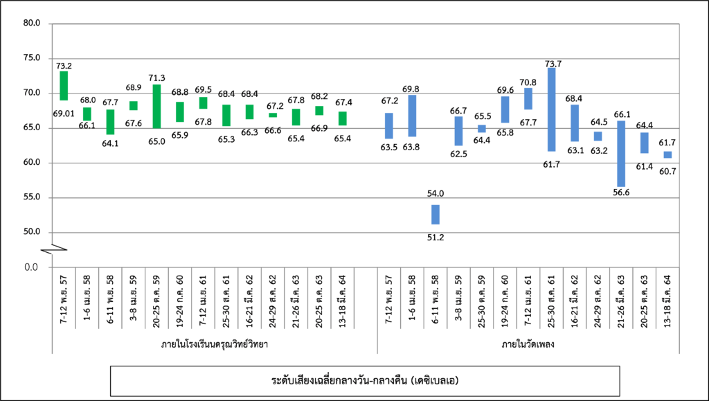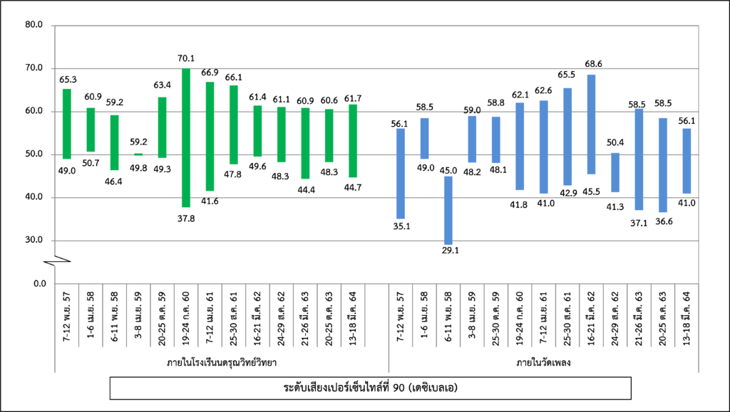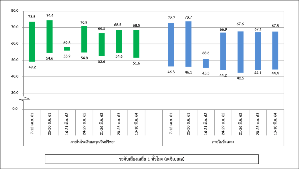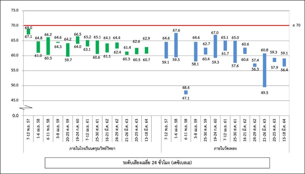 ผลการติดตามตรวจสอบระดับเสียงโดยทั่วไป ได้แก่ ระดับเสียงเฉลี่ย 1 ชั่วโมง ระดับเสียงเฉลี่ย 24 ชั่วโมง ระดับเสียงเปอร์เซ็นไทล์ที่ 90 และระดับเสียงเฉลี่ยกลางวัน-กลางคืน ระหว่างปี พ.ศ. 2560-2564 พบว่า ระดับเสียงเฉลี่ย 24 ชั่วโมง ทั้งหมดมีค่าอยู่ในมาตรฐานกำหนดตามประกาศคณะกรรมการสิ่งแวดล้อมแห่งชาติ ฉบับที่ 15 (พ.ศ. 2540) เรื่อง กำหนดมาตรฐานระดับเสียงโดยทั่วไป เนื่องจากจุดติดตามตรวจสอบอยู่บริเวณริมถนนกรุงธนบุรีที่มีปริมาณจราจรที่หนาแน่นและติดขัดตลอดทั้งวัน สำหรับระดับเสียงเฉลี่ย 1 ชั่วโมง ระดับเสียงเปอร์เซ็นไทล์ที่ 90 และระดับเสียงเฉลี่ยกลางวัน-กลางคืน ยังไม่มีมาตรฐานกำหนด