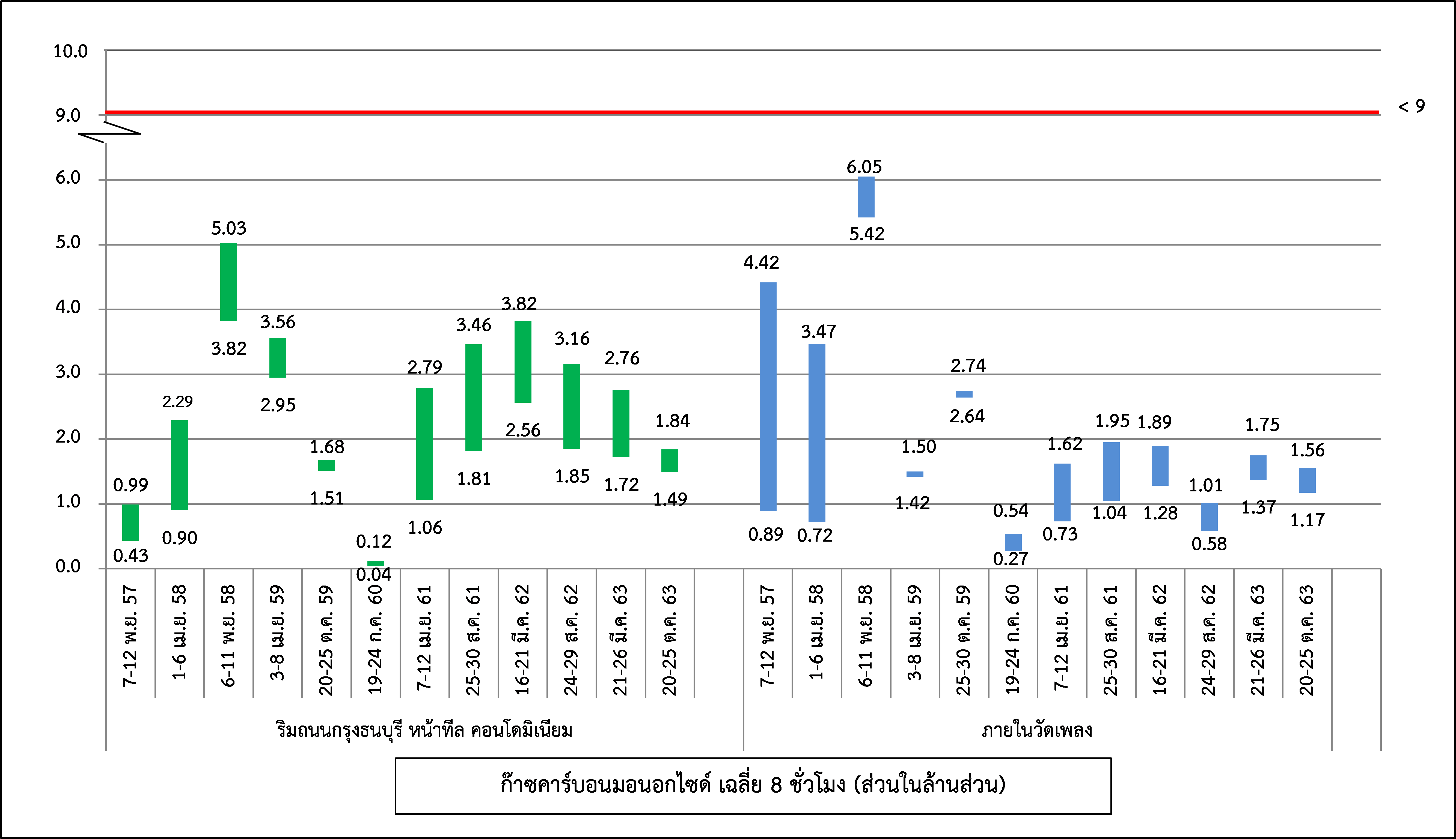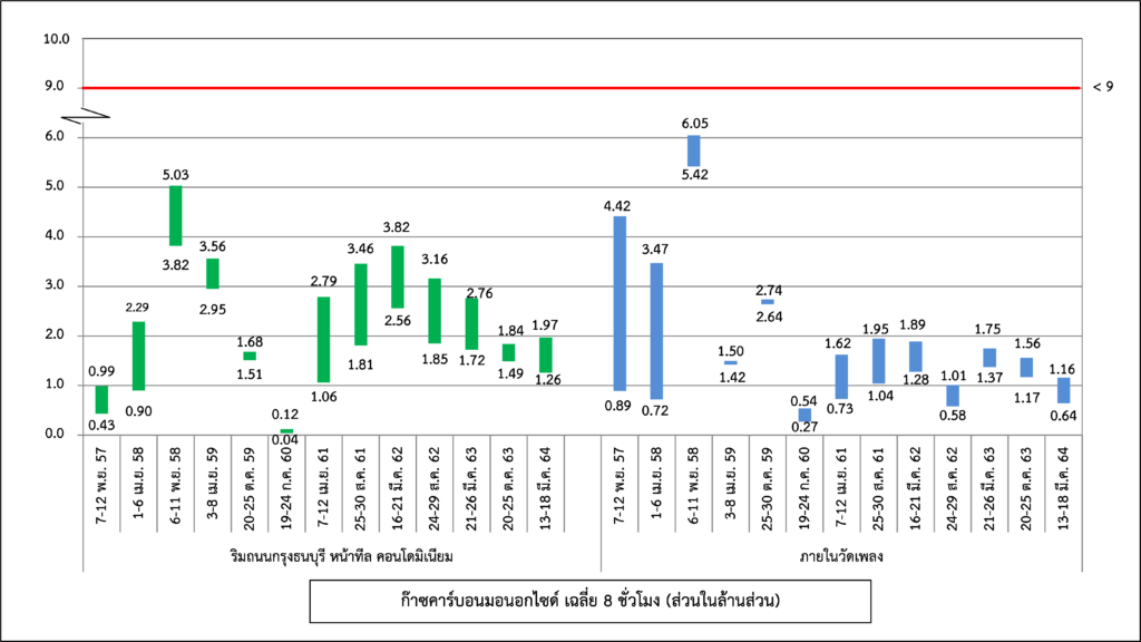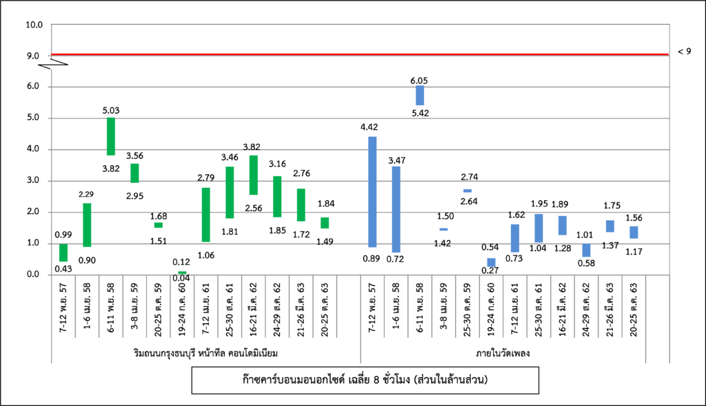 ผลการติดตามตรวจสอบคุณภาพอากาศในบรรยากาศ ได้แก่ ฝุ่นละอองขนาดไม่เกิน 10 ไมครอน ก๊าซคาร์บอนมอนอกไซด์ และก๊าซไนโตรเจนไดออกไซด์ ระหว่างปี พ.ศ. 2560-2564 พบว่า ดัชนีคุณภาพอากาศทั้งหมด มีค่าอยู่ในมาตรฐานกำหนดตามประกาศคณะกรรมการสิ่งแวดล้อมแห่งชาติ ฉบับที่ 24 (พ.ศ. 2547) เรื่อง กำหนดมาตรฐานคุณภาพอากาศในบรรยากาศทั่วไป ประกาศคณะกรรมการสิ่งแวดล้อมแห่งชาติ ฉบับที่ 10 (พ.ศ. 2538) ออกตามความในพระราชบัญญัติส่งเสริมและรักษาคุณภาพสิ่งแวดล้อมแห่งชาติ พ.ศ. 2535 เรื่อง กำหนดมาตรฐาน และประกาศคณะกรรมการสิ่งแวดล้อมแห่งชาติ ฉบับที่ 33 (พ.ศ. 2552) เรื่อง กำหนดมาตรฐานค่าก๊าซไนโตรเจนไดออกไซด์ในบรรยากาศโดยทั่วไป