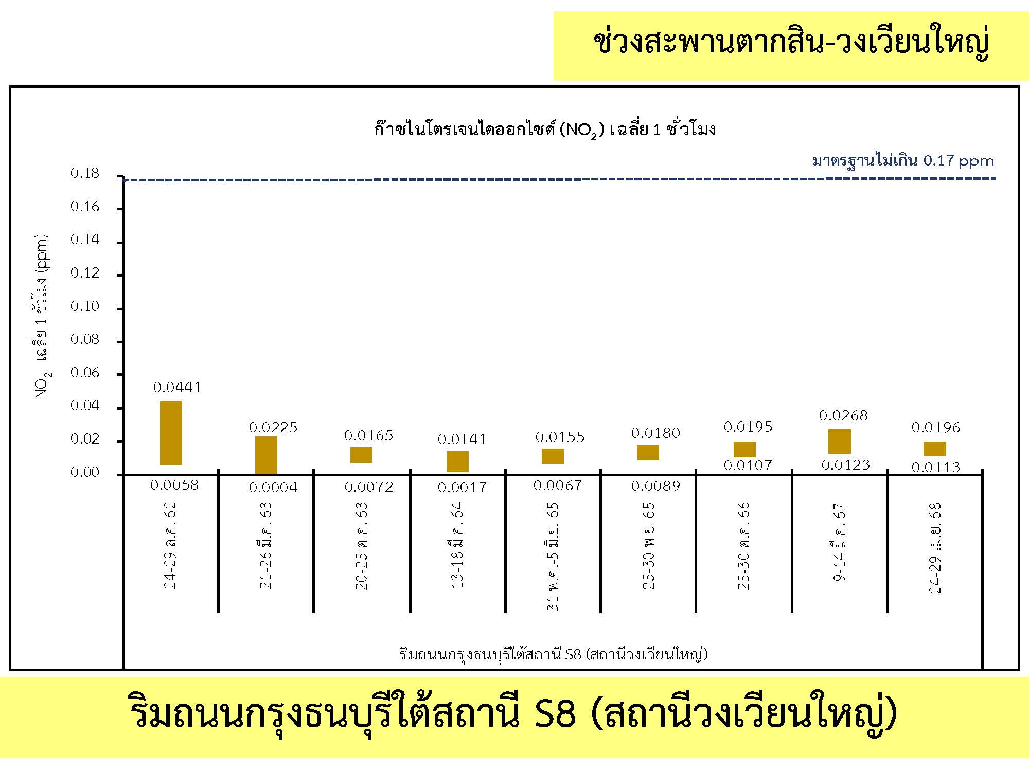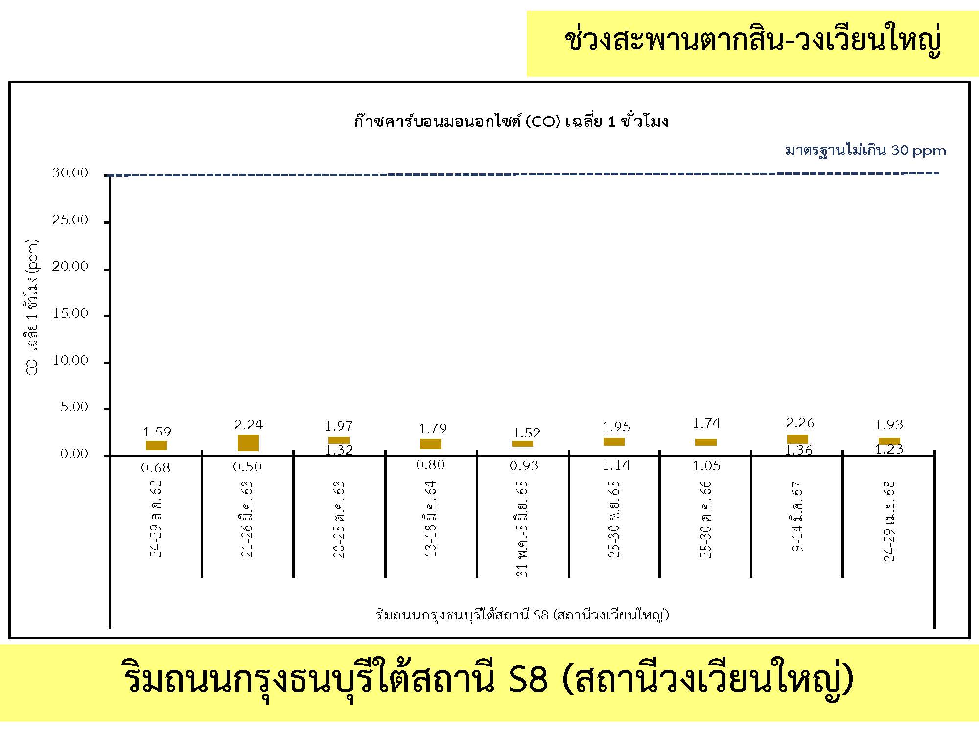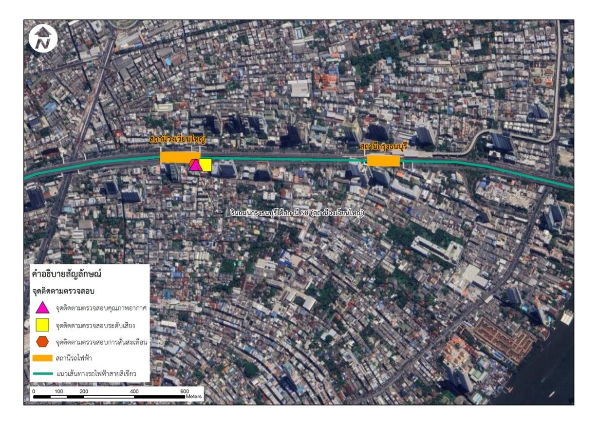 ผลการติดตามตรวจสอบระดับเสียงโดยทั่วไป ได้แก่ ระดับเสียงเฉลี่ย 1 ชั่วโมง ระดับเสียงเฉลี่ย 24 ชั่วโมง ระดับเสียงสูงสุด ระดับเสียงเปอร์เซ็นไทล์ที่ 90 และระดับเสียงเฉลี่ยกลางวัน-กลางคืน ในช่วงมกราคม-มิถุนายน พ.ศ. 2568 พบว่า ระดับเสียงเฉลี่ย 24 ชั่วโมง มีค่าไม่อยู่ในเกณฑ์มาตรฐานที่กำหนด เนื่องจากจุดติดตามตรวจสอบระดับเสียงตั้งอยู่ริมถนนกรุงธนบุรี ซึ่งมีปริมาณการจราจรหนาแน่น ในขณะที่ระดับเสียงสูงสุดมีค่าอยู่ในมาตรฐานฯ ที่กำหนด