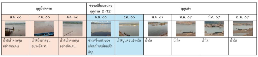 สีของน้ำมีการเปลี่ยนแปลงเป็นสีปูนในช่วงหลังฤดูน้ำหลาก (ช่วงเปลี่ยนแปลงฤดูกาล 2 – น้ำเริ่มลด) ในช่วงครึ่งหลังของเดือนพฤศจิกายน และน้ำเริ่มใสมากขึ้นในช่วงต้นเดือนธันวาคม โดยสีของน้ำในแม่น้ำโขงเริ่มเปลี่ยนเป็นสีคราม