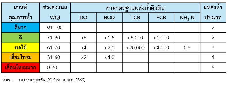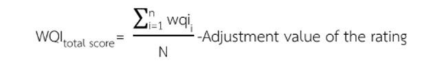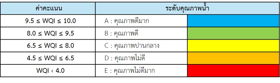 ค่า WQI (คะแนนรวม) = ค่าเฉลี่ยของคะแนนทั้ง 5 ดัชนี – ค่าการปรับความถูกต้องของคะแนน