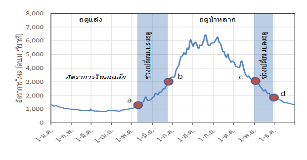 - จุด b คือวันที่อัตราการไหลสูงขึ้นจนมีค่าเท่ากับอัตราการไหลเฉลี่ยรายปี