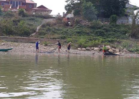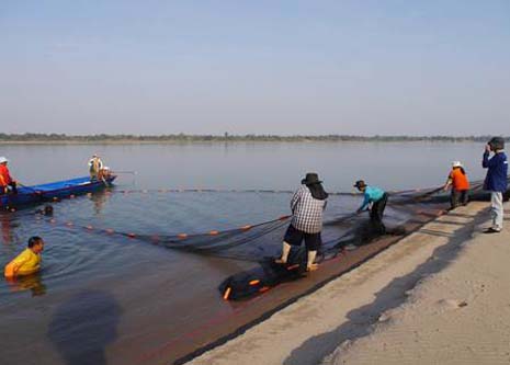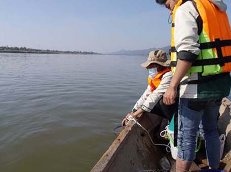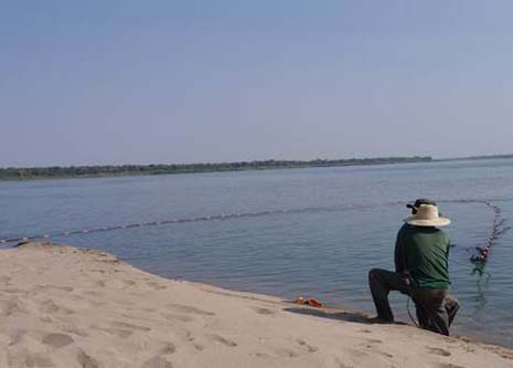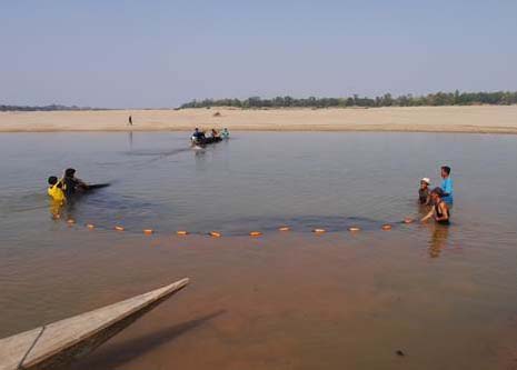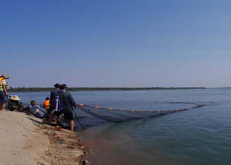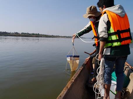 การศึกษาในครั้งนี้ได้เลือกใช้อวนทับตลิ่ง (Beach seine) ที่มีขนาดความยาว 40 เมตร ขนาดตาอวน 2 เซนติเมตร ความกว้างประมาณ 8 เมตร ทำการตีอวนใน 3 ฤดูกาล โดยลงพื้นที่จังหวัดที่กำหนดเพื่อตีอวนพื้นที่จำนวน 3 ฤดูกาล คือ ฤดูน้ำกำลังขึ้น (กรกฎาคม – กันยายน 2563) ฤดูน้ำขึ้นสูงสุด (พฤศจิกายน – ธันวาคม 2563) และฤดูน้ำกำลังลง (มกราคม – กุมภาพันธ์ 2564) จำนวนช่วงฤดูละ 1 ครั้ง ใน 8 พื้นที่ ได้แก่ จังหวัดเชียงราย เลย หนองคาย บึงกาฬ นครพนม มุกดาหาร อำนาจเจริญ และอุบลราชธานี
