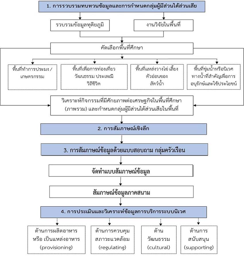สรุปตัวแทนพื้นที่ศึกษาด้านการบริการระบบนิเวศ โดยทำการสำรวจด้านบริการระบบนิเวศในทุกๆ ด้านใน 3 พื้นที่ ได้แก่ 1) อ.เชียงคาน จ.เลย 2) อ.ท่าอุเทน จ.นครพนม และ 3) อ.สังคม จ.หนองคาย ทั้งนี้ ได้กำหนดจำนวนกลุ่มตัวอย่างแต่ละพื้นที่ ดังตารางที่ 2