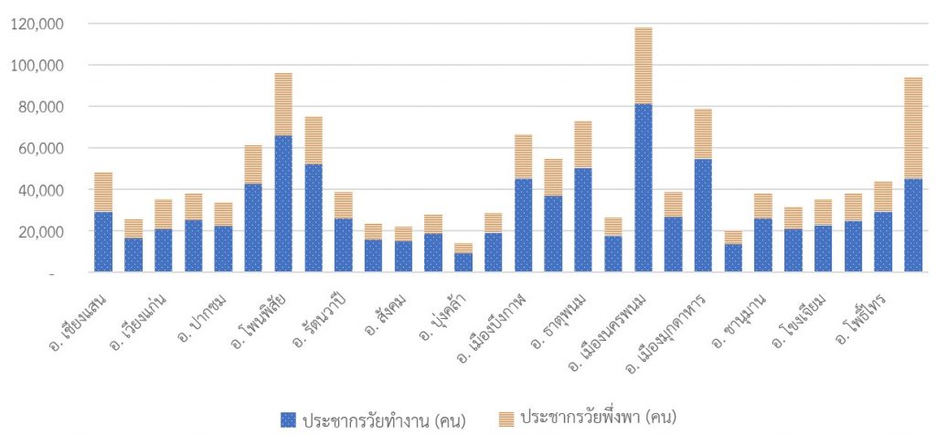 เมื่อพิจารณาถึงลักษณะของประชากรของพื้นที่ศึกษาพบว่า ในปี พ.ศ. 2561 มีประชากร วัยทำงานทั้งหมด 873,064 คน คิดเป็นร้อยละ 65.84 ของประชากรทั้งหมด โดยพบสัดส่วนประชากรวัยแรงงานมากที่สุดในอำเภอเมืองหนองคาย ร้อยละ 69.66 รองลงมาได้แก่ อำเภอดอนตาล ร้อยละ 69.25 อำเภอท่าบ่อ ร้อยละ 69.19 อำเภอเมืองมุกดาหาร ร้อยละ 69.10 ตามลำดับ และอำเภอศรีเมืองใหม่มีสัดส่วนประชากรวัยแรงงานน้อยที่สุด คิดเป็นร้อยละ 48.21 รายละเอียดตามตารางที่ 2 และรูปที่ 2