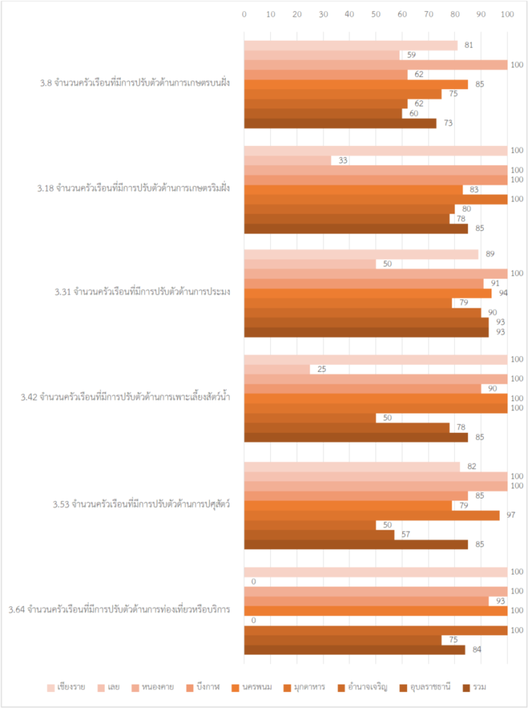 ผลกระทบทางธรรมชาติที่ครัวเรือนประสบปัญหาสูงสุดคือภัยแล้ง (ร้อยละ 62) และเป็นปัญหาที่ครัวเรือนมีการปรับสูงเช่นกัน (ร้อยละ 84)