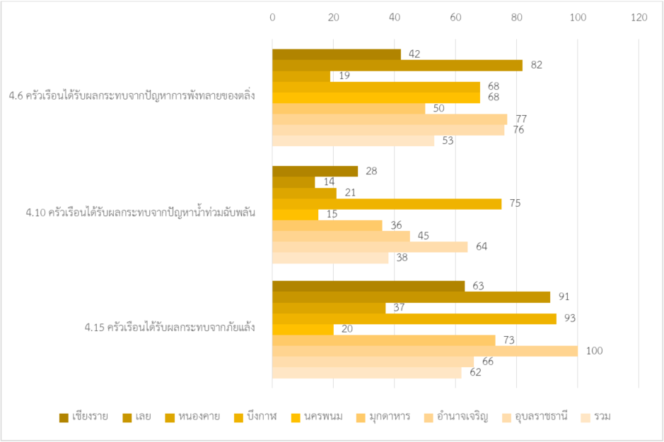 – ด้านการเจริญเติบโตของพืชจากการเกษตรบนฝั่ง พบว่า ครัวเรือนทั้ง 8 จังหวัดส่วนใหญ่มีการเจริญเติบโตของพืชลดลง จำนวน 123 ครัวเรือน (ร้อยละ 44) โดยจังหวัดที่มีความรุนแรงของปัญหานี้สูงสุด คือ จังหวัดเลย จำนวน 24 ครัวเรือน (ร้อยละ 96)