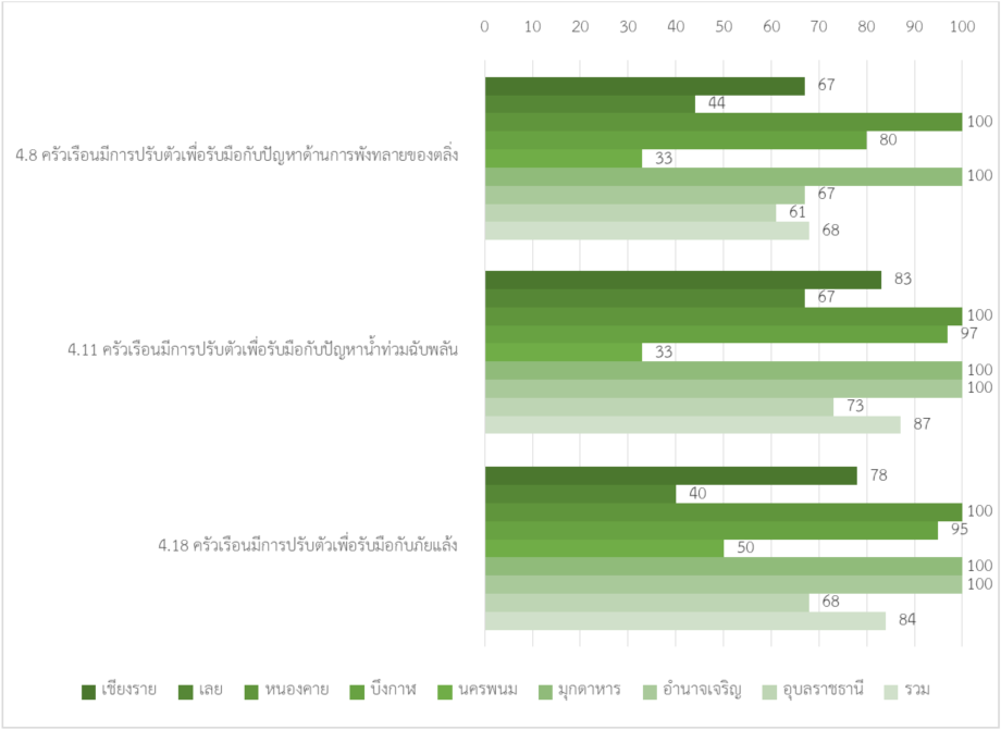 – ด้านการปรับตัวเพื่อรับมือกับปัญหาด้านการเกษตรกรรมริมฝั่ง พบว่า ครัวเรือนทั้ง 8 จังหวัด ที่ทำการเกษตรริมฝั่งทั้ง 8 จังหวัดมีการปรับตัวจำนวน 152 ครัวเรือน (ร้อยละ 89) โดยจังหวัดที่มีสัดส่วนการปรับตัวสูงที่สุด คือ จังหวัดอำนาจเจริญ จำนวน 15 ครัวเรือน (ร้อยละ 100) และจังหวัดบึงกาฬ จำนวน  12 ครัวเรือน (ร้อยละ 100) โดยวิธีการปรับตัวเพื่อรับมือกับปัญหาด้านการเกษตรกรรมริมฝั่ง ได้แก่  การป้องกันน้ำเสีย การไม่ทิ้งขยะสิ่งปฏิกูลและสารพิษลงในแม่น้ำ จำนวน 124 ครัวเรือน (ร้อยละ 82)