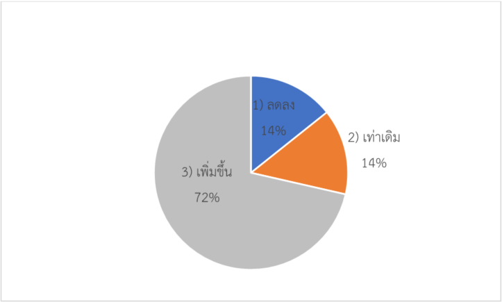 – ด้านรายได้จากการขายผลผลิต ครัวเรือนทั้ง 8 จังหวัดส่วนใหญ่เห็นว่าครัวเรือนของตนเองมีรายได้จากการขายผลผลิตลดลง จำนวน 86 ครัวเรือน (ร้อยละ 51) โดยจังหวัดที่มีความรุนแรงของปัญหานี้สูงที่สุดคือ จังหวัดเลย จำนวน 8 ครัวเรือน (ร้อยละ 80)