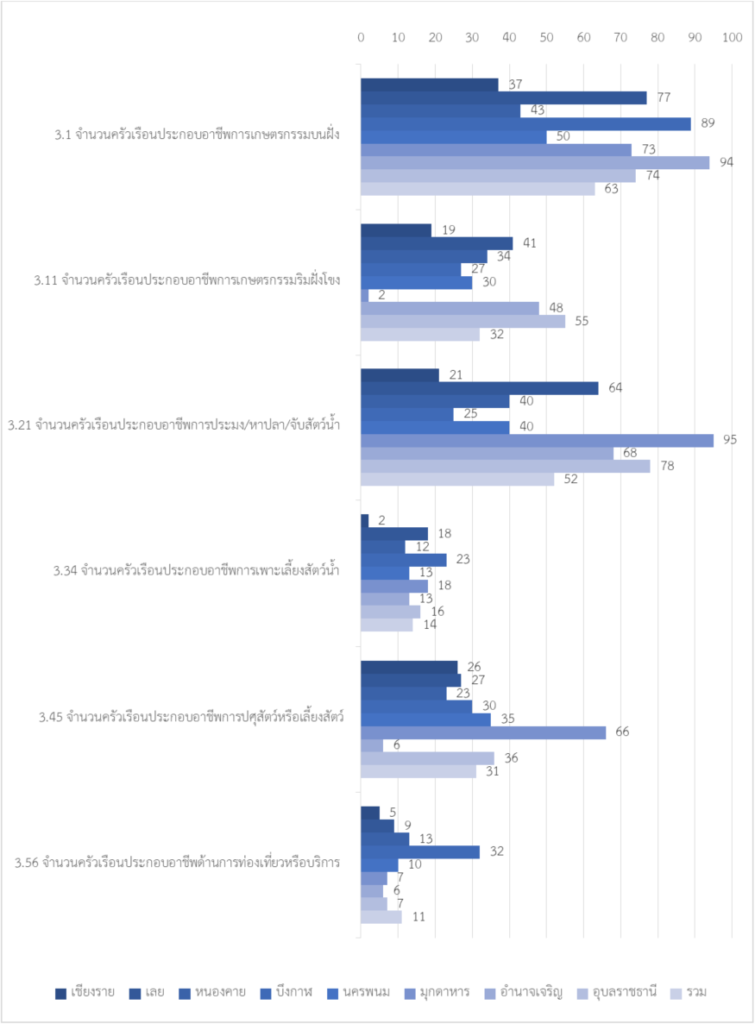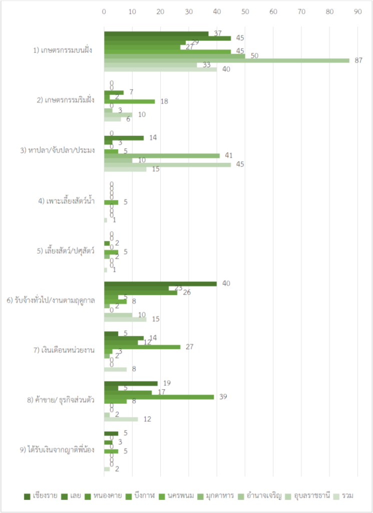 ครัวเรือนทั้ง 8 จังหวัดที่ประกอบอาชีพการเกษตรกรรมริมฝั่งมีจำนวน 170 ครัวเรือน (ร้อยละ 40) โดยจังหวัดอุบลราชธานีมีสัดส่วนครัวเรือนที่ทำเกษตรกรรมริมฝั่งสูงที่สุด จำนวน 34 ครัวเรือน (ร้อยละ 58) ในขณะที่จังหวัดบึงกาฬมีสัดส่วนต่ำที่สุด จำนวน 12 ครัวเรือน (ร้อยละ 27)