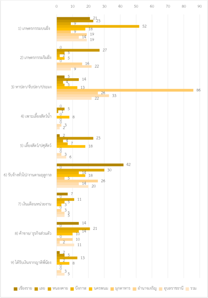 จากข้อมูลจะพบว่ากลุ่มอาชีพที่ครัวเรือนส่วนใหญ่คืออาชีพเกษตรกรรม (ร้อยละ 63) รองลงมาคืออาชีพการประมงหาปลาและจับสัตว์น้ำตามธรรมชาติ (ร้อยละ 52) อาชีพการเกษตรริมฝั่งโขง (ร้อยละ 32) โดยทั้ง 3 อาชีพนี้มีครัวเรือนที่มีการปรับตัวสูงสุดคือการประมงหาปลาและจับสัตว์น้ำตามธรรมชาติ (ร้อยละ 93) รองลงมาคือการเกษตรริมฝั่ง (ร้อยละ 85) และการเกษตรกรรมบนฝั่ง (ร้อยละ 73)