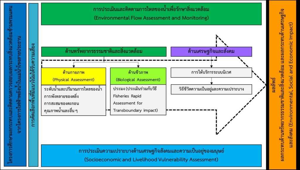 จากกระบวนการวิเคราะห์ผลกระทบสิ่งแวดล้อมข้ามพรมแดนจากรายงานการศึกษาของคณะกรรมาธิการแม่น้ำโขง (MRC, 2009) โครงการฯ ดำเนินการวิเคราะห์ผลกระทบข้ามพรมแดนที่มีโอกาสเกิดขึ้นในประเทศไทย จากการพัฒนาโครงการไฟฟ้าพลังน้ำ การวิเคราะห์และประเมินผลกระทบสิ่งแวดล้อมข้ามพรมแดน ดังแสดงในรูปที่ 1 สำหรับผลกระทบด้านทรัพยากรธรรมชาติและสิ่งแวดล้อมที่โครงการฯ ได้ดำเนินการประเมินนั้นเป็นประเด็นสำคัญที่เกี่ยวข้องกับผลกระทบข้ามพรมแดนโดยตรง ซึ่งประกอบด้วย 2 ส่วน คือ